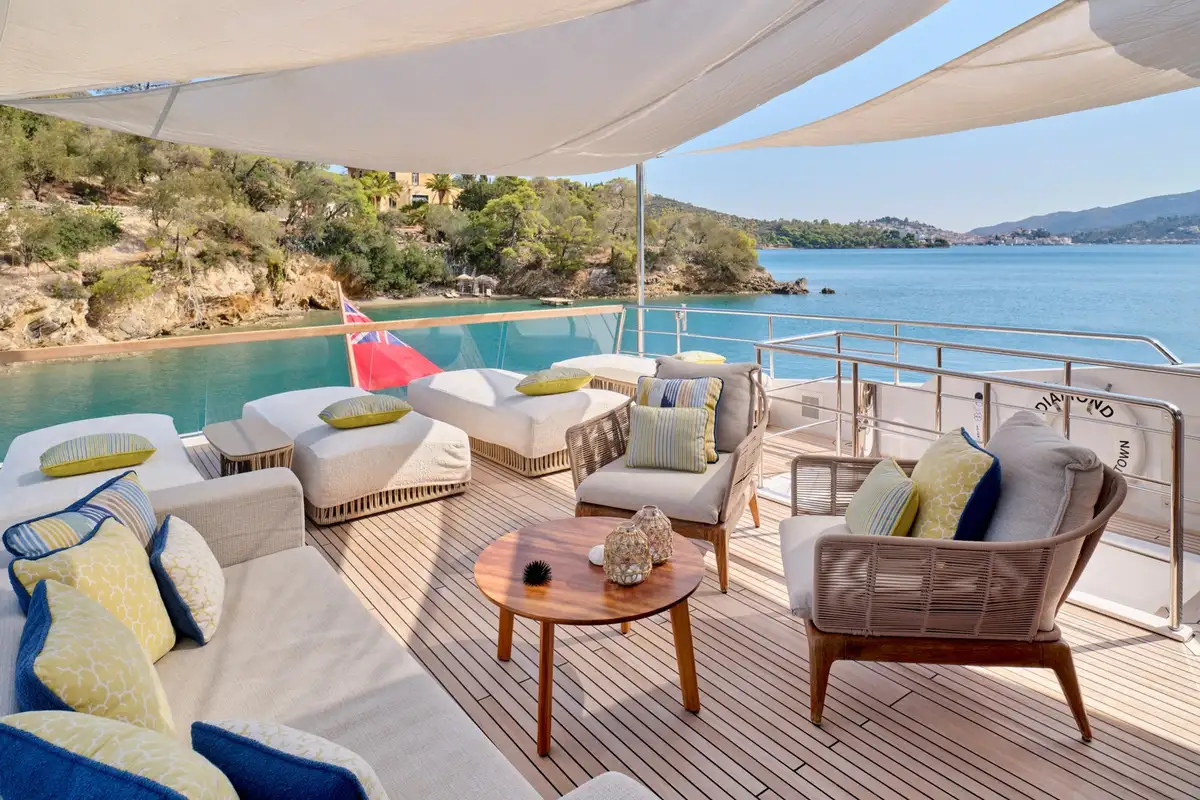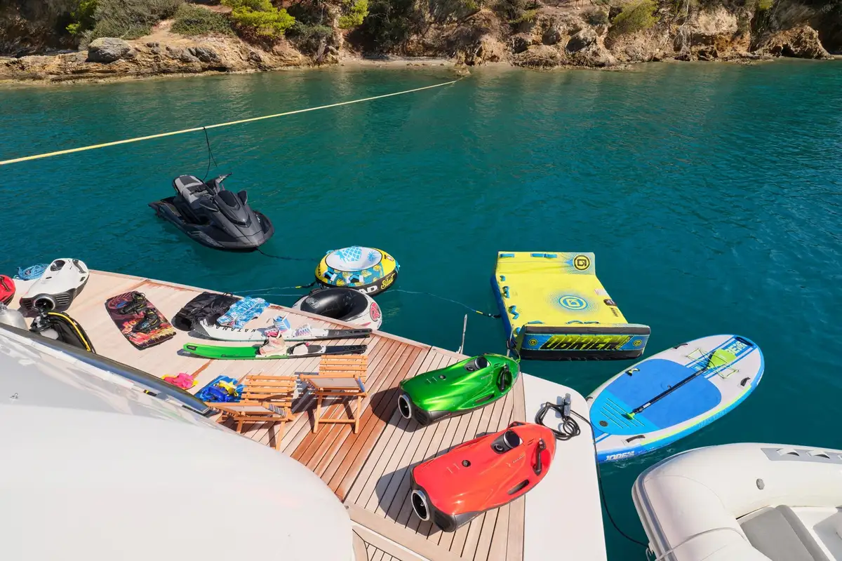 There’s a shaded al fresco lounge area on the main deck too. Plush seating and hi-lo tables create a welcoming place to relax after making the most of the onboard water sports equipment. Whether you’ve been for a serene evening paddle on a SUP, an exhilarating tow on skis, wakeboards, or inflatables (donuts and sofas), or a high-speed thrash on the jetski, RARE DIAMOND has all these and three SeaBobs and snorkelling equipment for 11 people.