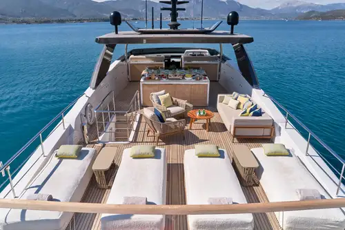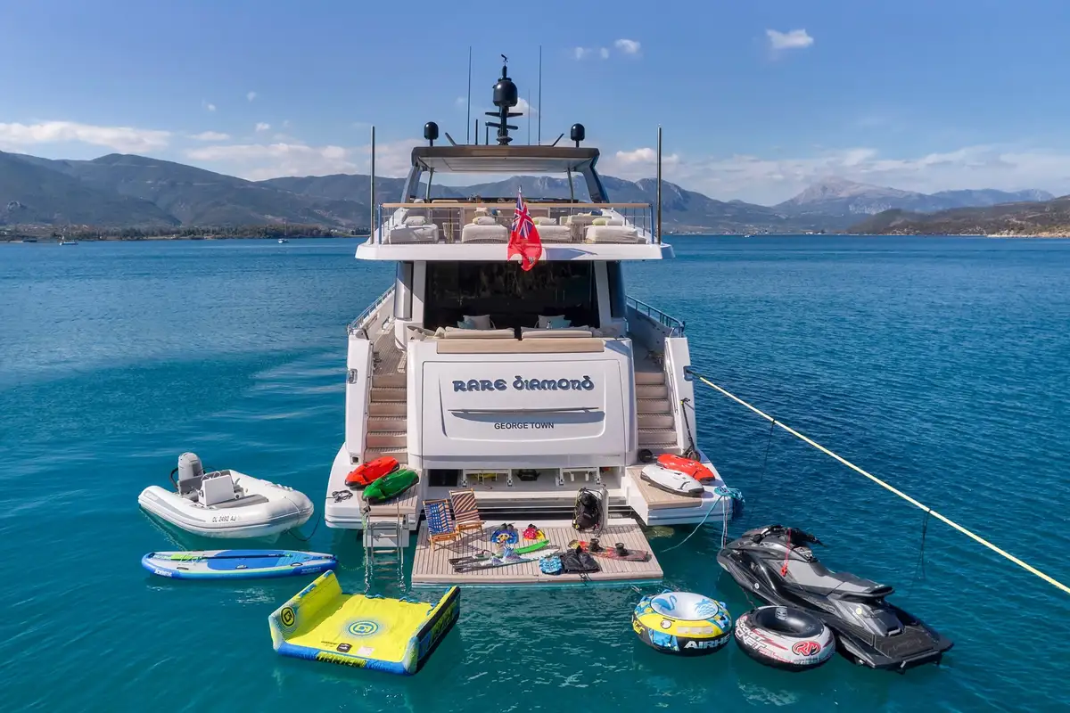 With her sleek looks, 25+ knot top speed, and a toybox packed with a fine selection of water sports equipment, RARE DIAMOND is a gem waiting to be discovered. You and your guests will be treated to an amazing time on this fantastic yacht, whether you’re relaxing on the huge foredeck sunpad, enjoying a wondrous breakfast on the sun deck, or just relaxing on the hydraulic swim platform with the water lapping at your toes.