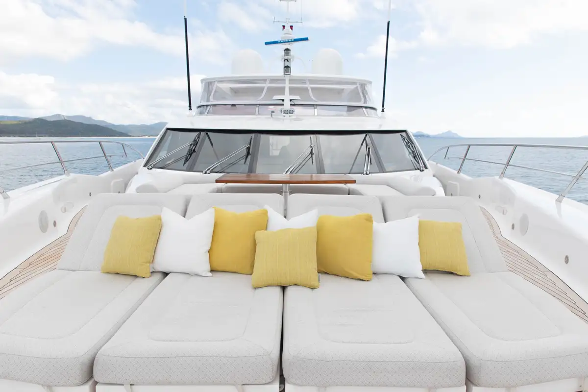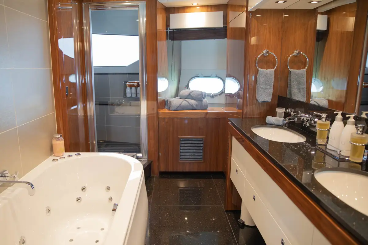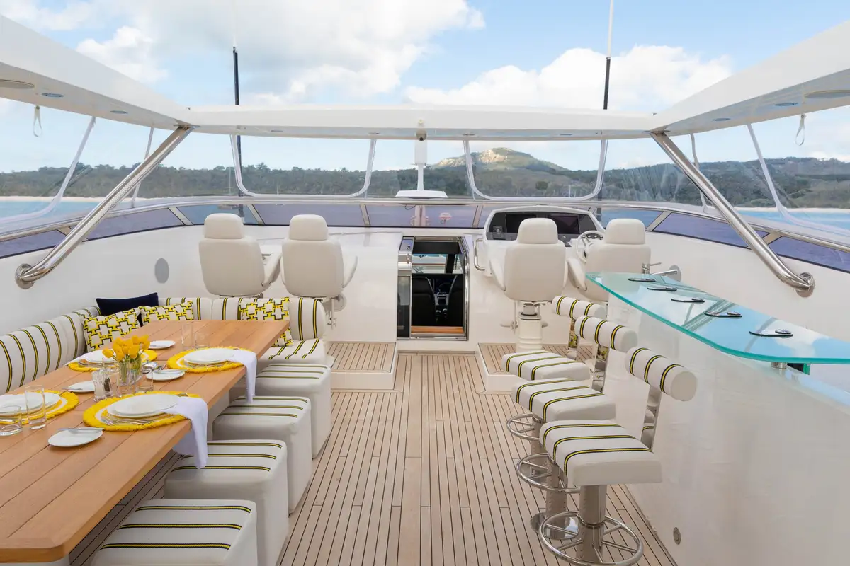 Up on the flybridge are two helm positions, upgraded custom bar, ice maker, upgraded Jacuzzi with vast surrounding sunpad areas, seating and dining areas, sheltered by a retractable hard top.