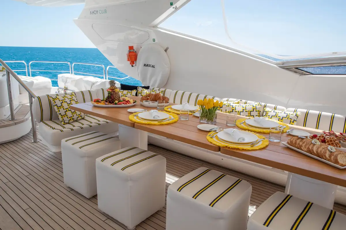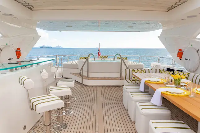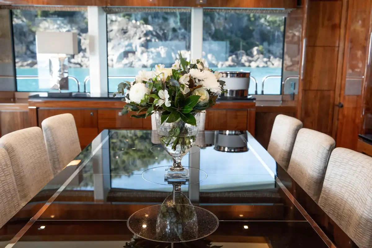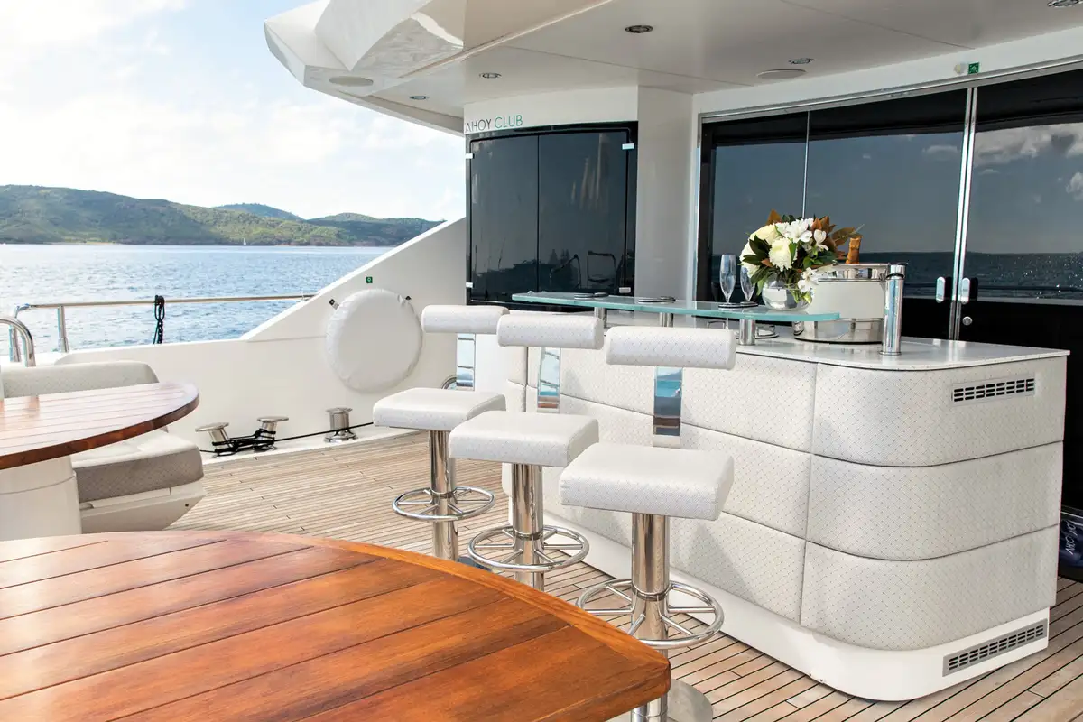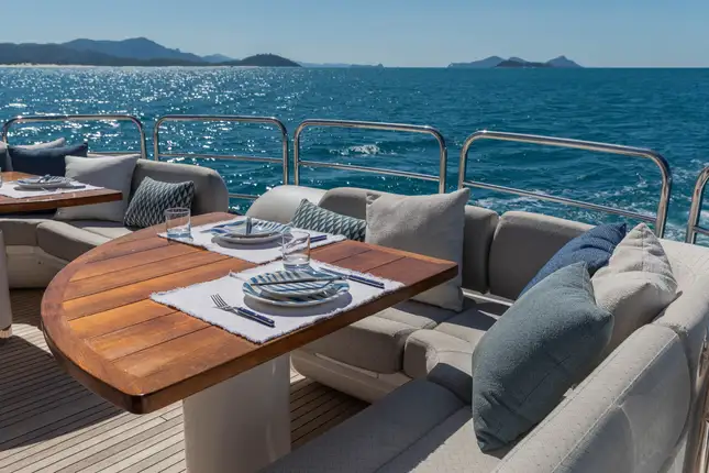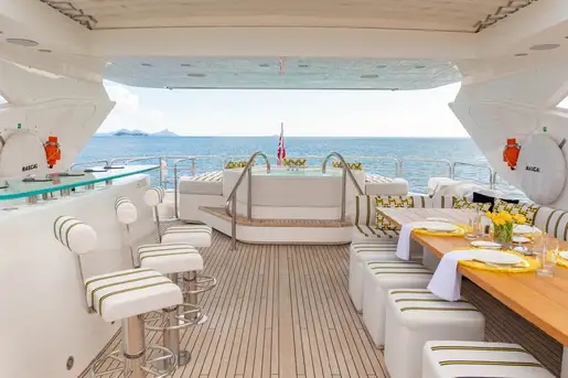Forward is a formal dining area with seating for up to 10 guests. The aft cockpit is fitted with everything needed for al fresco entertaining and dining including built-in bench seating and a table and chairs along with a full wet bar and ice maker.
