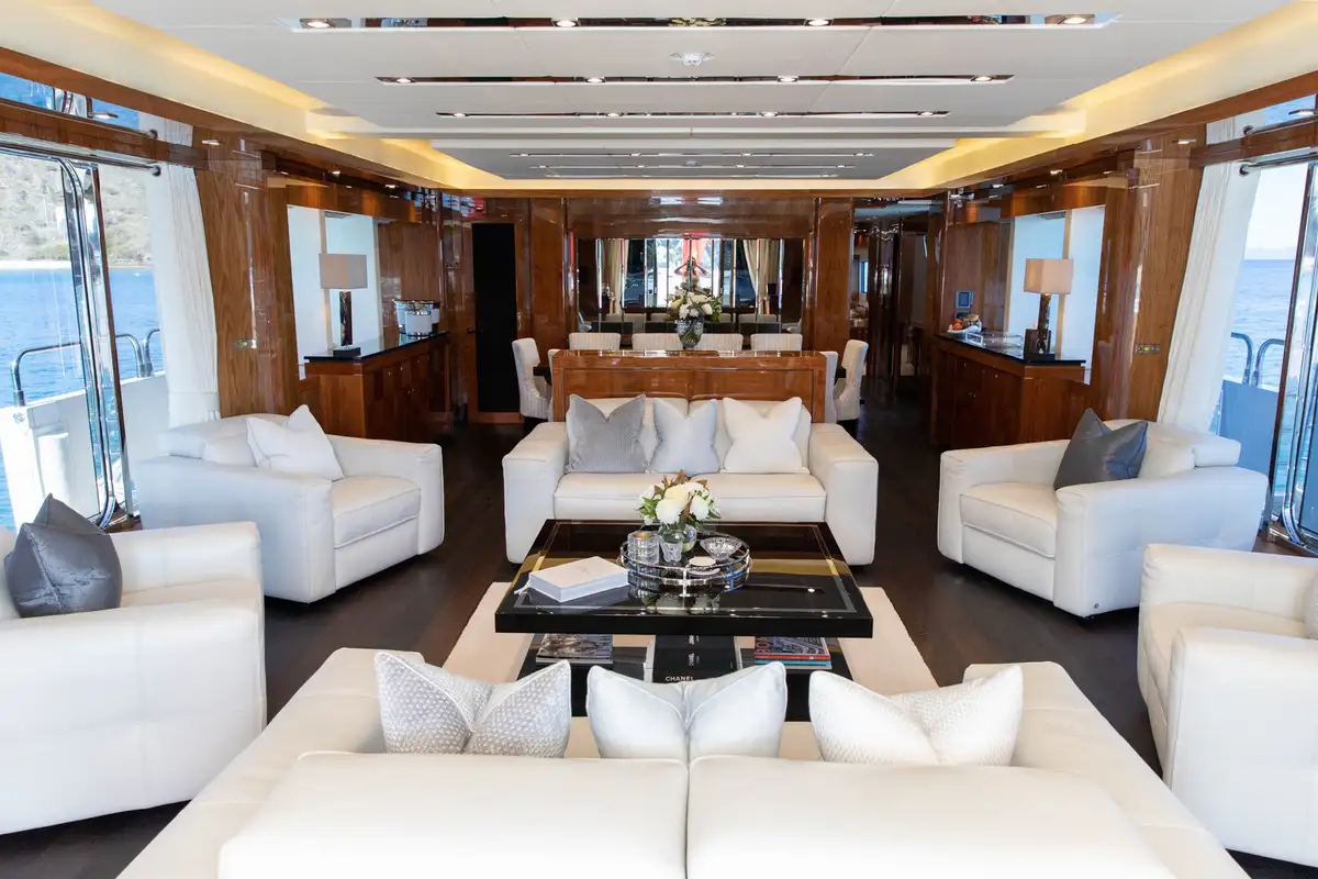 The open-plan saloon has extensive seating, a full wet bar and an entertainment centre including a 55-inch television screen and a System Orca sound system.