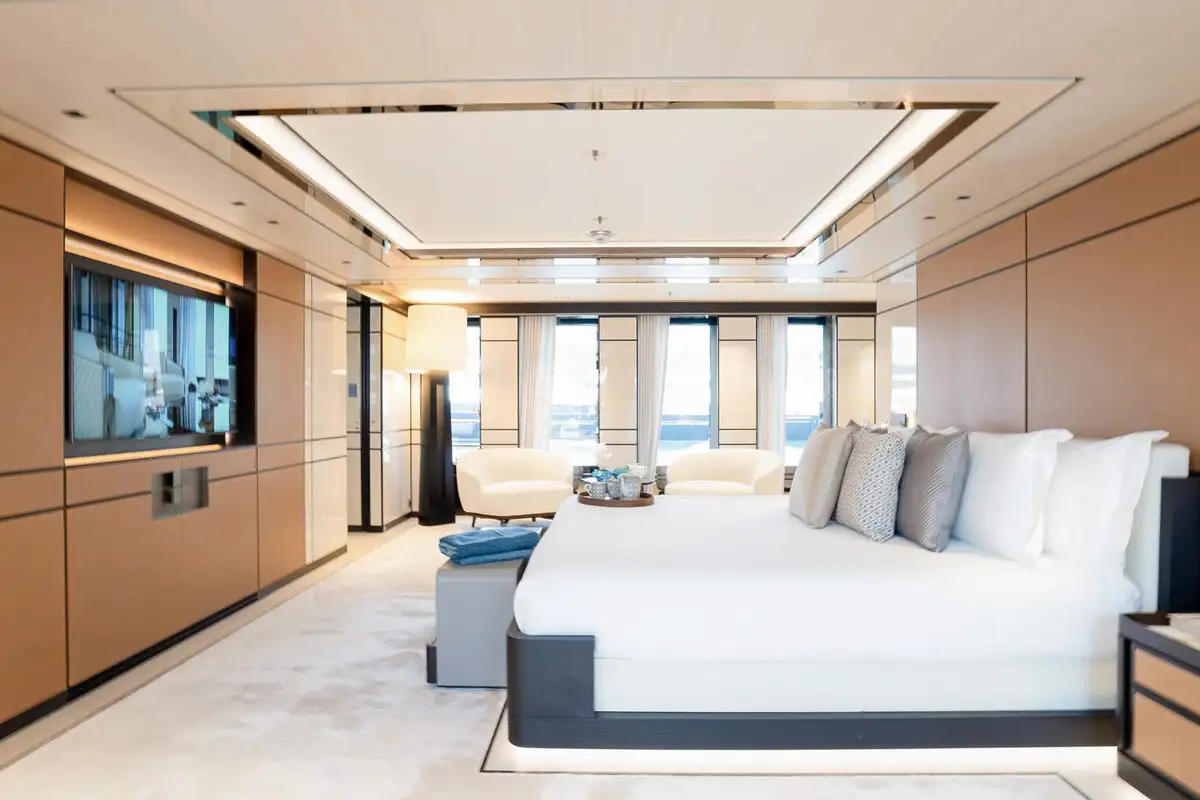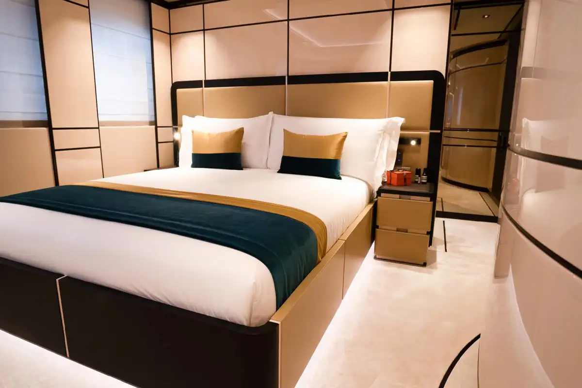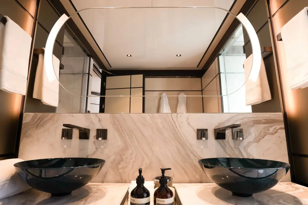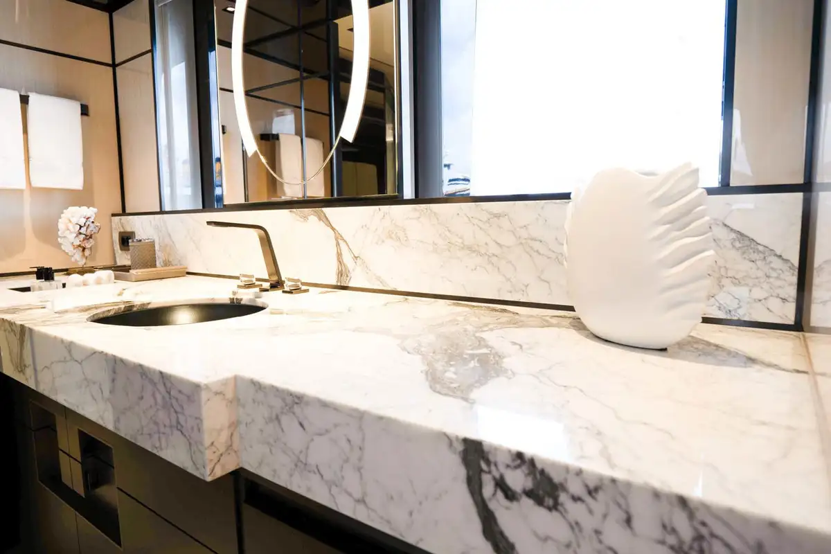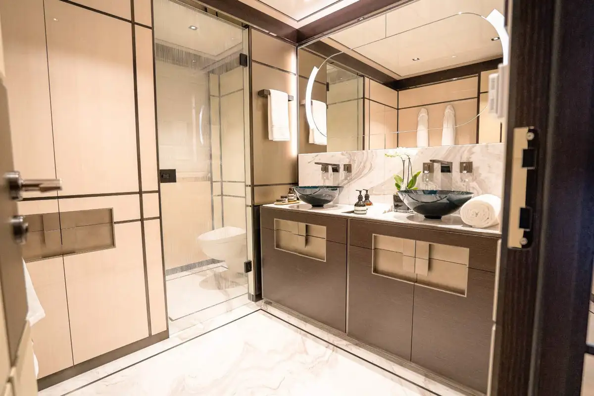 As attractive as the social guest areas are, it’s the privacy of the guest suites that highlight RELIANCE’s beauty. No better is this shown than the palatial full-beam master suite. Lines of vertical windows allow light to fill the space, and give you amazing views out, while, the geometric craftsmanship works to create a soothing sanctuary. At the head of the suite is the glorious full-beam marble-lined his and hers en suite bathroom. The veining of the marble pattern has been used to divide this space (and his and hers showers and sinks) coming together at the centreline bath.