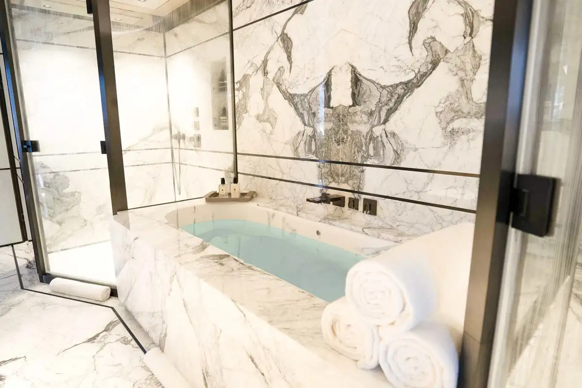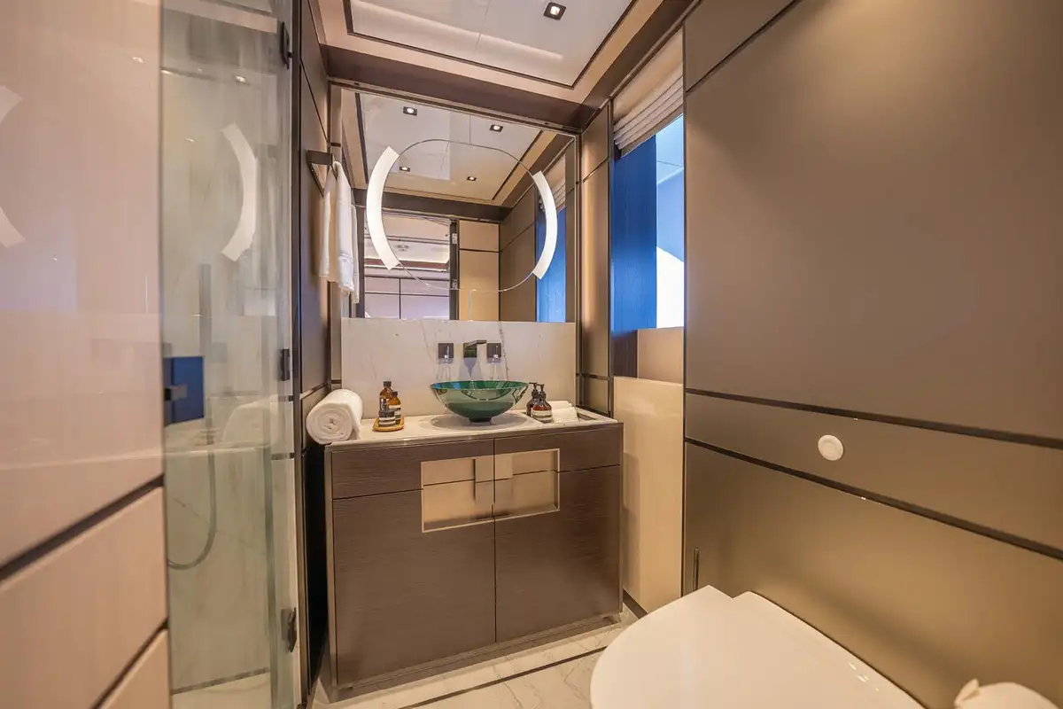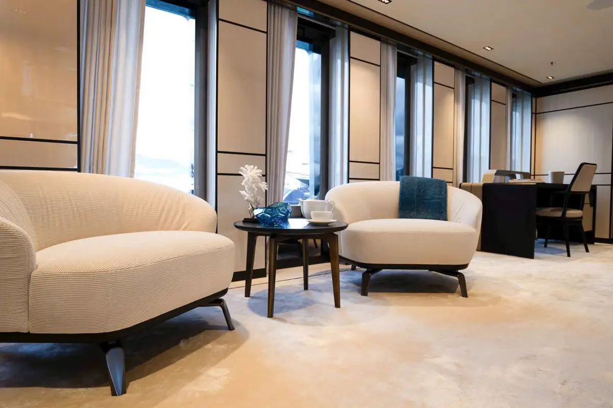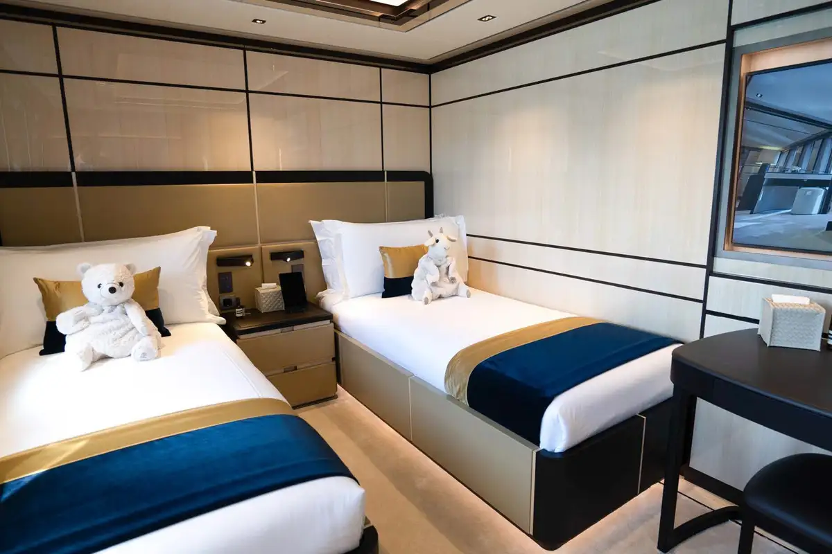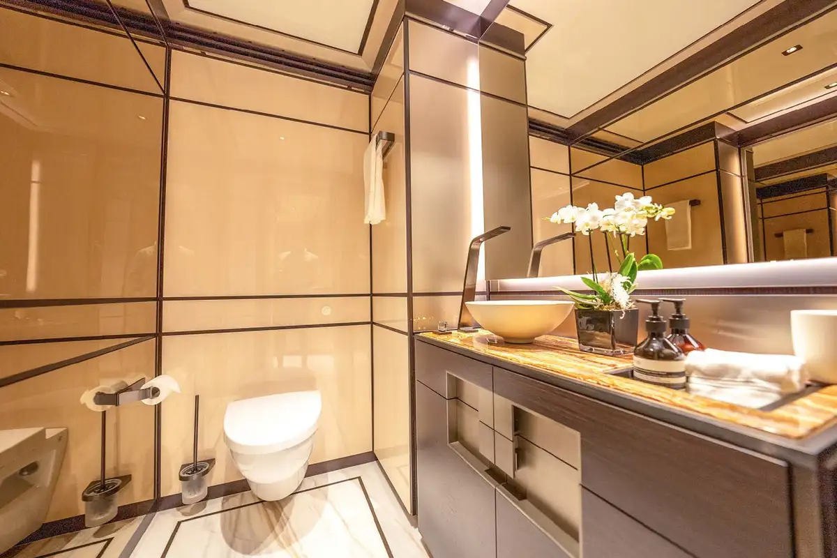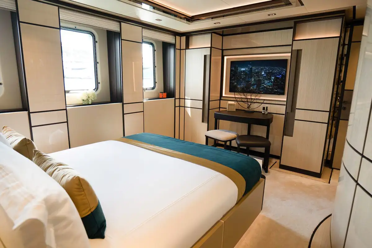 As attractive as the social guest areas are, it’s the privacy of the guest suites that highlight RELIANCE’s beauty. No better is this shown than the palatial full-beam master suite. Lines of vertical windows allow light to fill the space, and give you amazing views out, while, the geometric craftsmanship works to create a soothing sanctuary. At the head of the suite is the glorious full-beam marble-lined his and hers en suite bathroom. The veining of the marble pattern has been used to divide this space (and his and hers showers and sinks) coming together at the centreline bath.