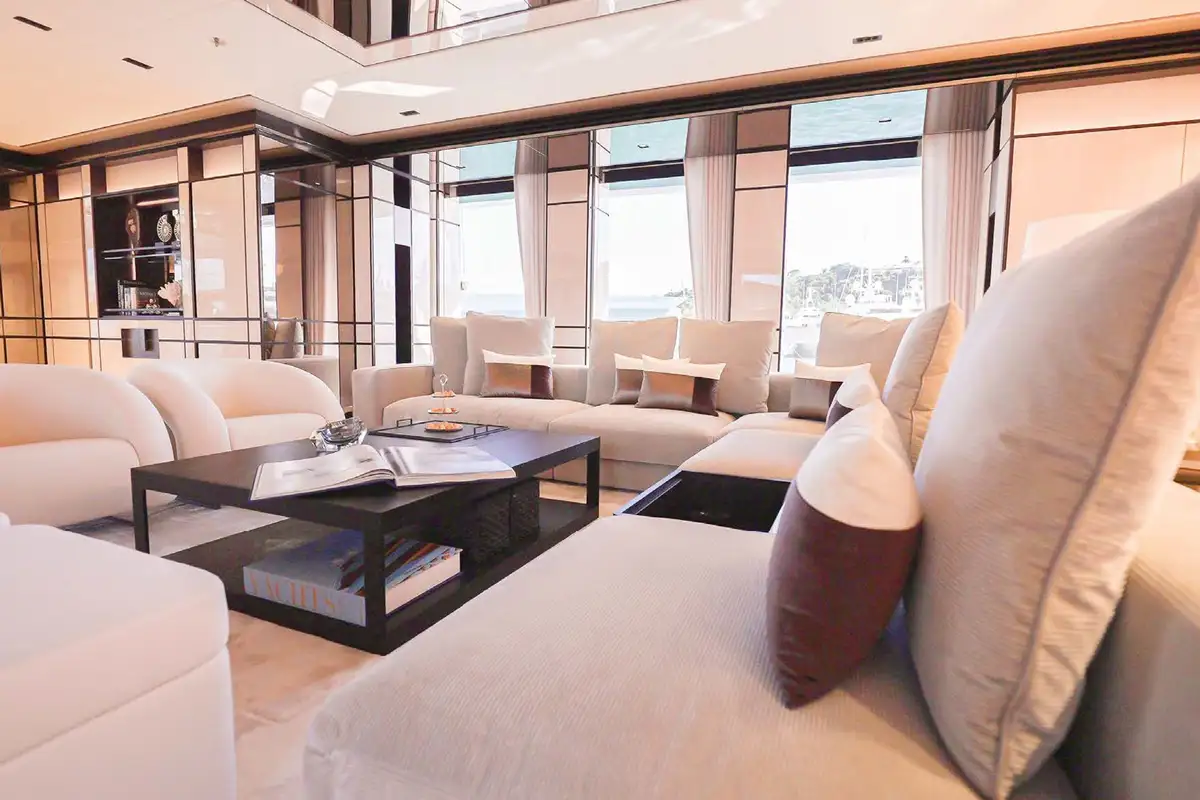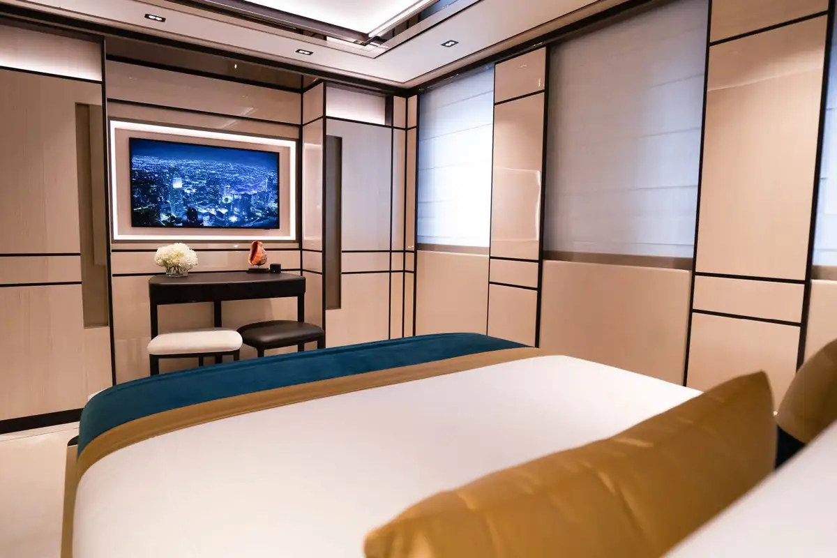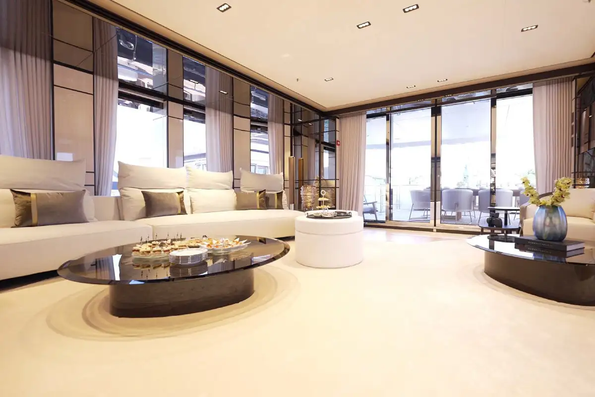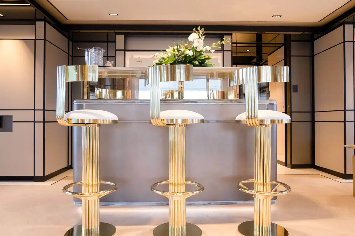 Also on the upper deck, you’ll find the stunning sky lounge and bar area. floor-to-ceiling windows, a central cocktail bar, and a B&O Beovision Harmony that is poised to unfold into life when you need it.