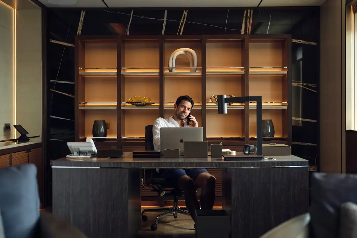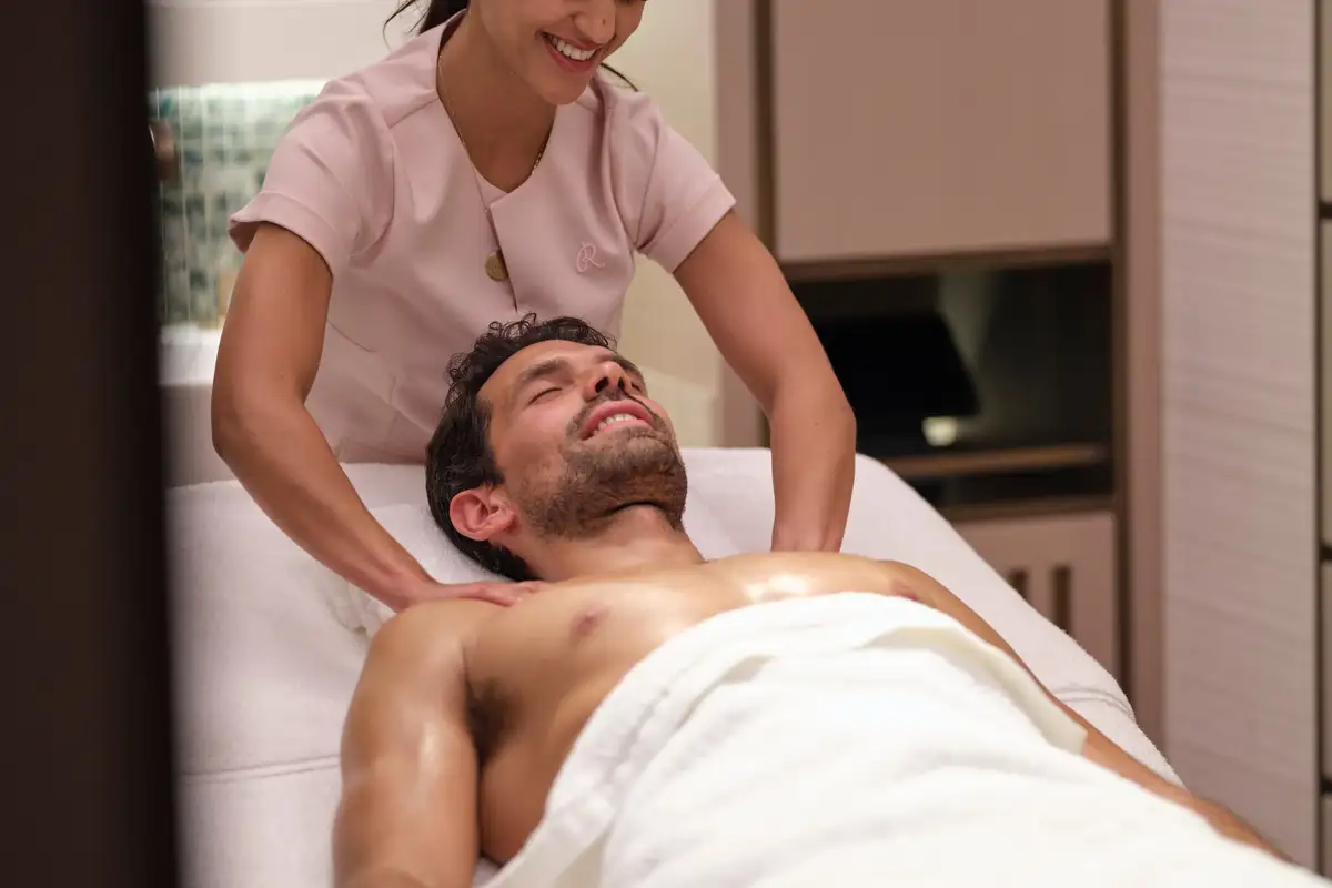 The spa deck is a true revelation. The fitness centre houses a vast gym with an extensive equipment list that would impress even elite athletes. A ballet bar and mirror are provided for stretches, with yoga areas both inside and out. Guests can indulge in hot and cold plunge pools, unwind in the steam room and sauna, and relax on the balcony with ocean views. Two treatment rooms, along with hair and beauty salons, complete the spa experience.