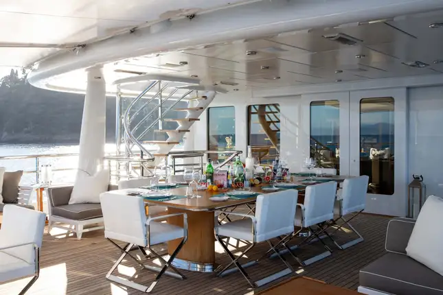 Her beautifully appointed interior layout offers six cabins that sleep up to 12 guests, including a full-beam master suite with private lounge/study, en suite and walk-in wardrobe. A further twin cabin located aft of the master suite provides an ideal sleeping arrangement for charters with children or staff. A further four cabins are situated on the lower deck, comprising a VIP stateroom, double cabin and two convertible cabins with pullmans. She is also capable of carrying up to 14 crew onboard to ensure a relaxed luxury yacht charter experience whatever your destination.