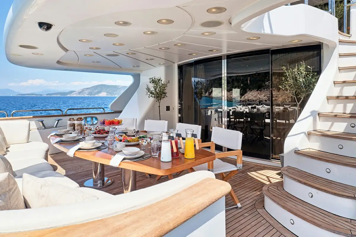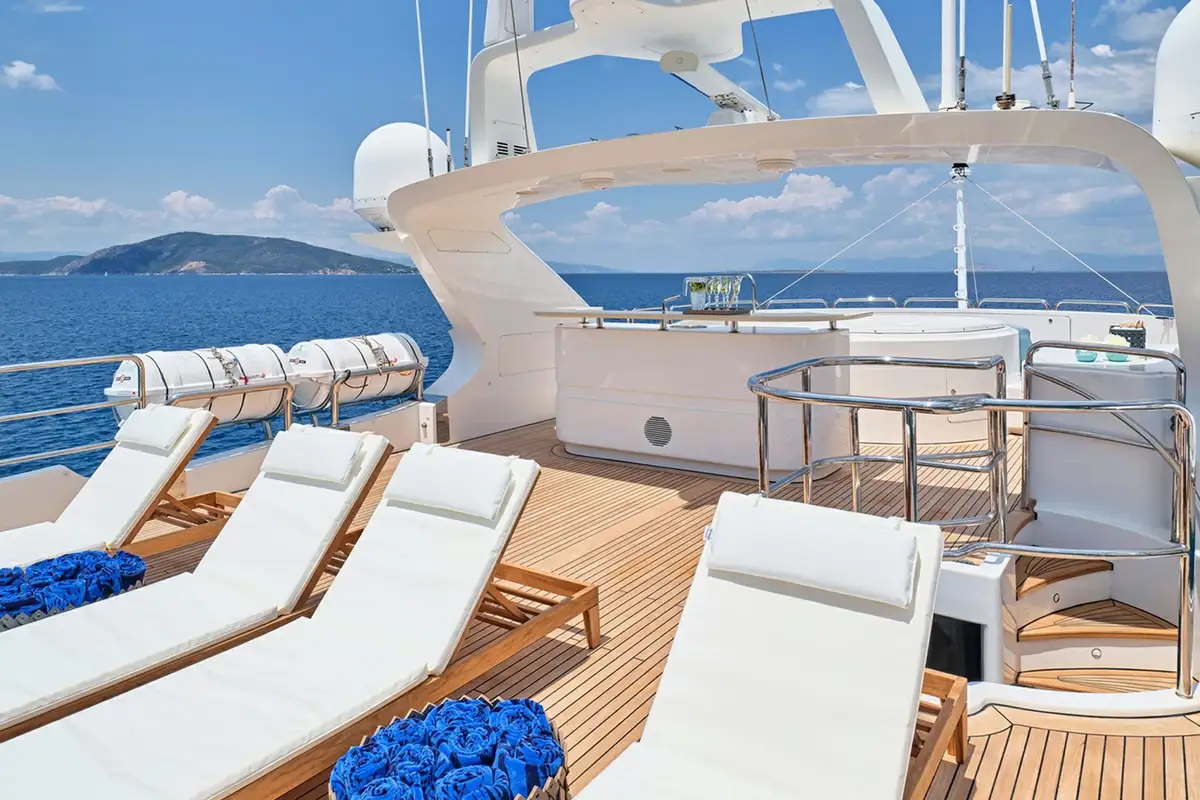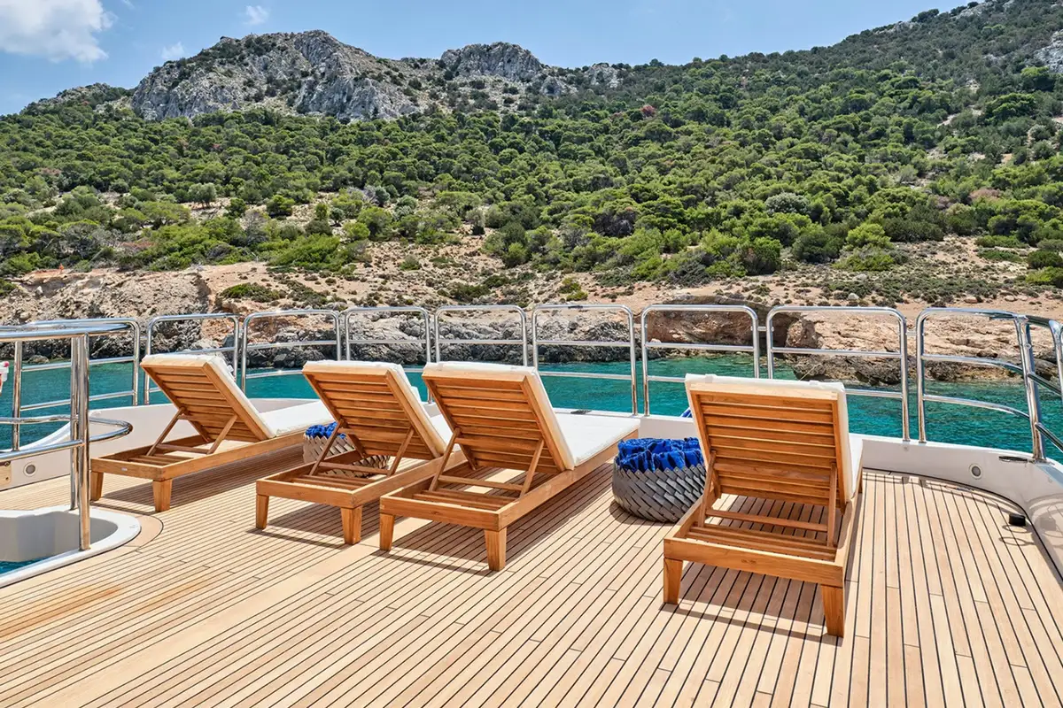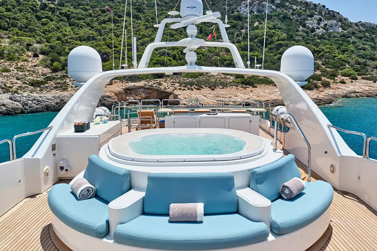 The large jacuzzi pool at the forward end of the sun deck is one of her key exterior features. There’s also a bar up there, plenty of sun loungers and a BBQ grill. The upper and main aft decks provide two further expanses of open-air living spaces for dining and reclining, so guests have a nice variety of places to gather together or relax and unwind.