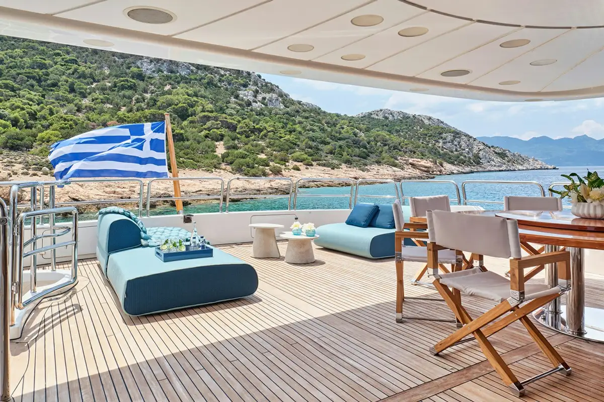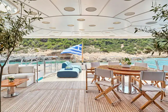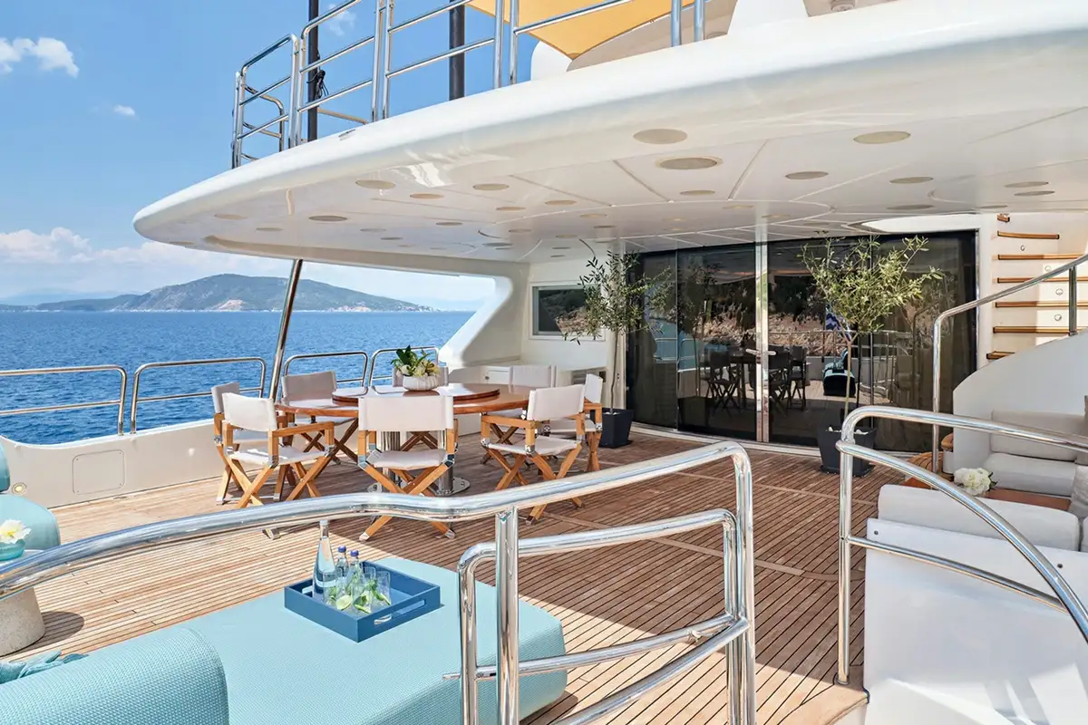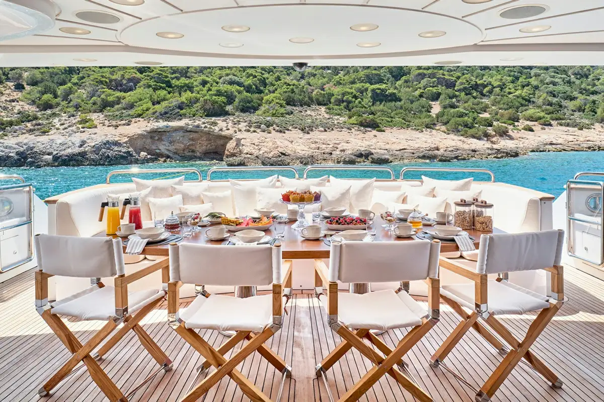 The large jacuzzi pool at the forward end of the sun deck is one of her key exterior features. There’s also a bar up there, plenty of sun loungers and a BBQ grill. The upper and main aft decks provide two further expanses of open-air living spaces for dining and reclining, so guests have a nice variety of places to gather together or relax and unwind.