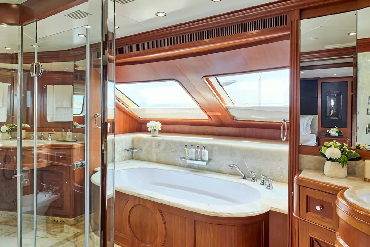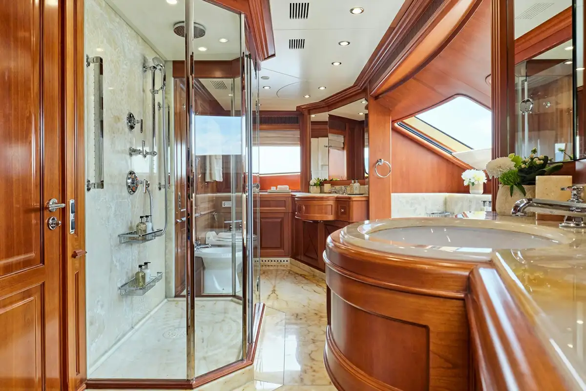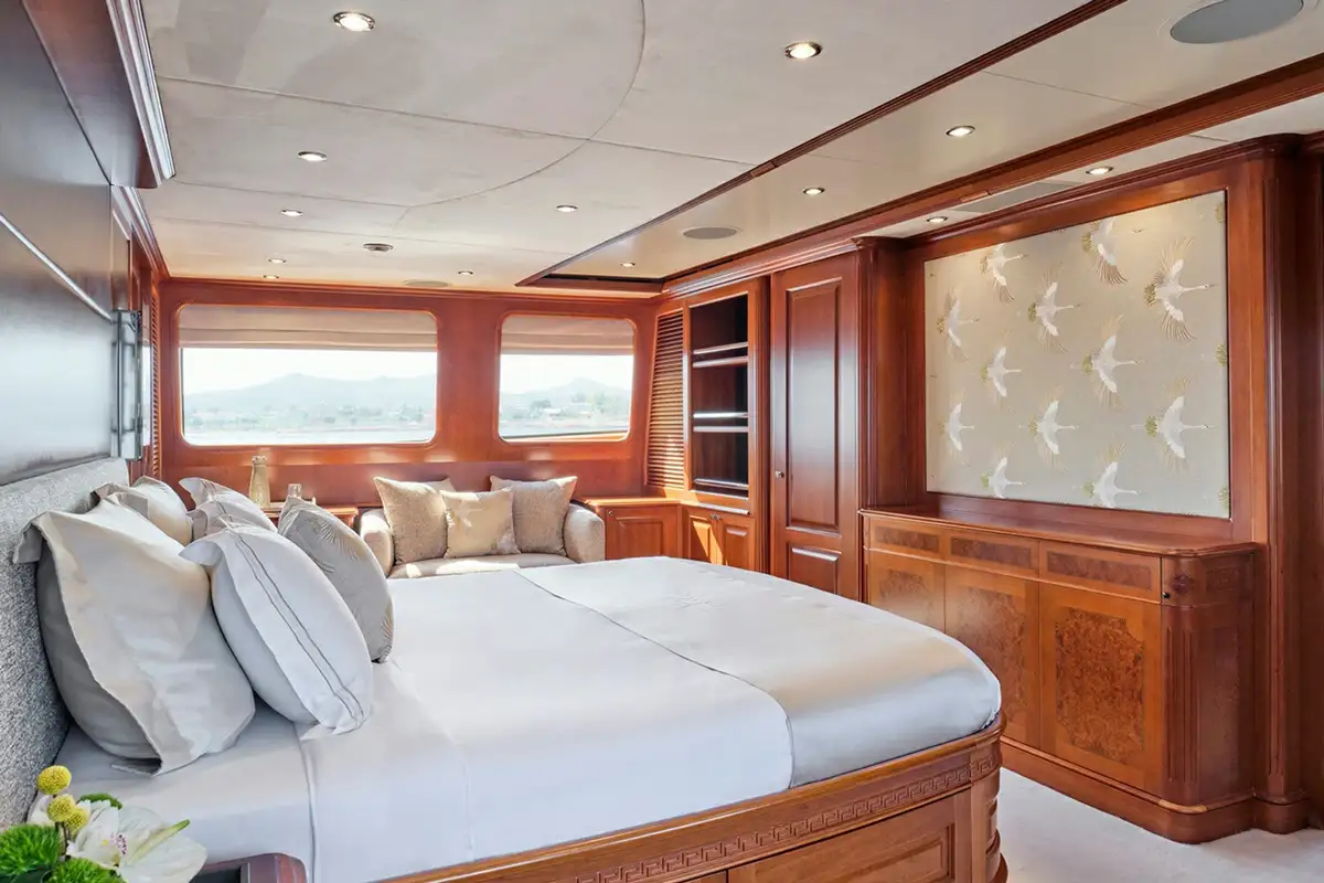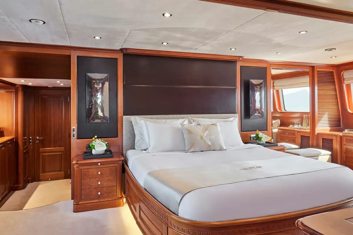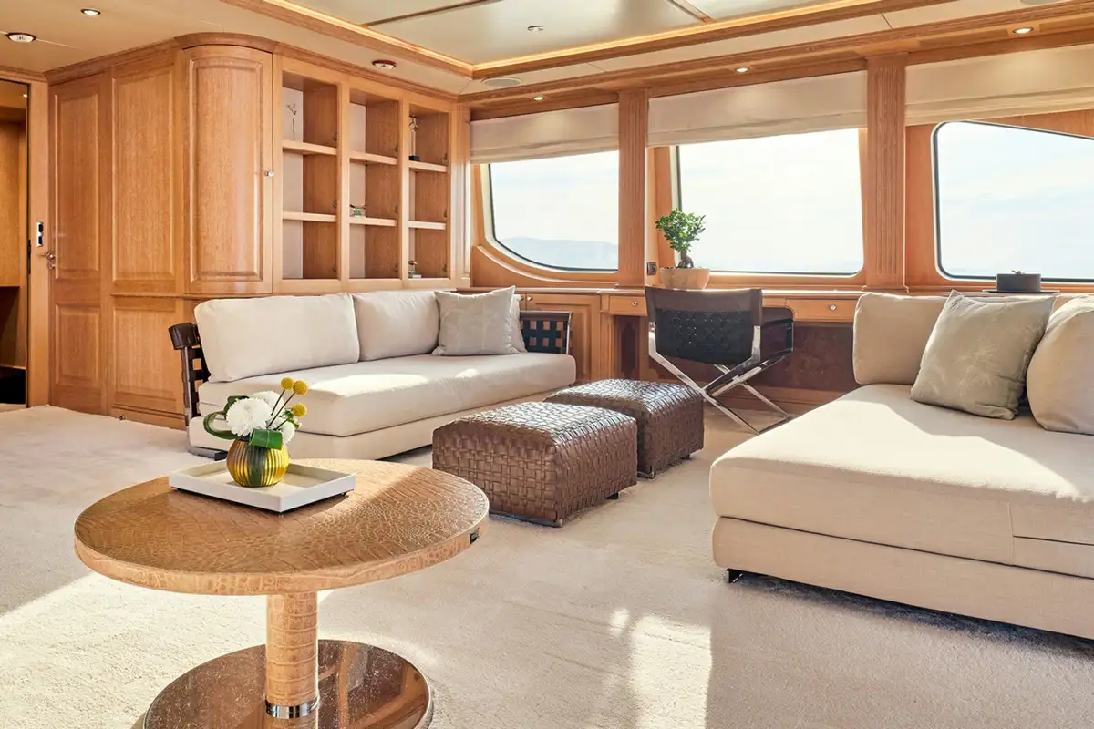 Her main deck lounge is iinviting and bright, with sweeping views of the seascape from both the comfortable lounge and elegant dining area. Directly above it, the upper deck lounge is a spacious living room, also with excellent views, plenty of natural light and a soothing, easygoing vibe. There’s an almost seamless flow between of these lounges and the open-air decks astern.