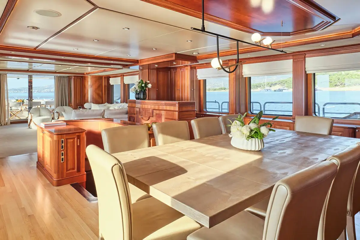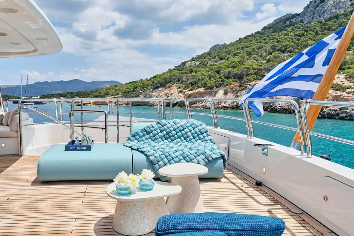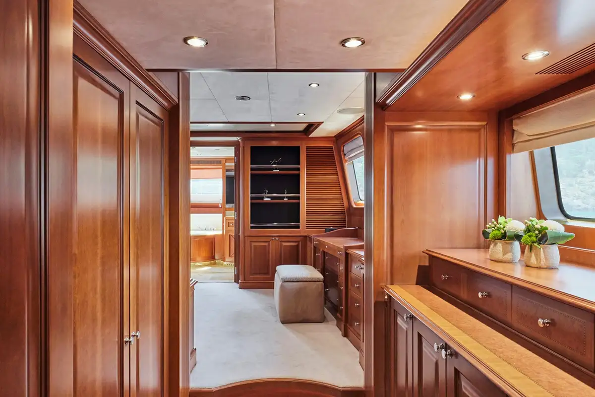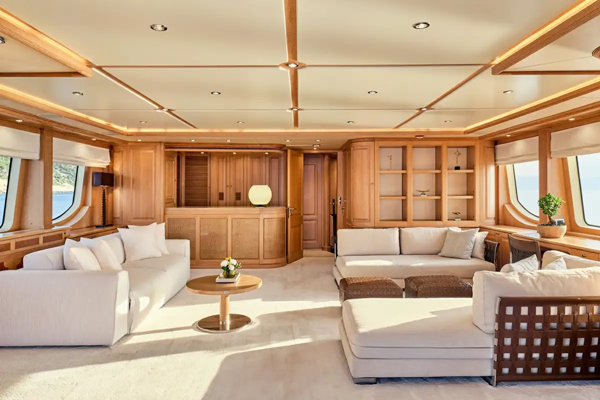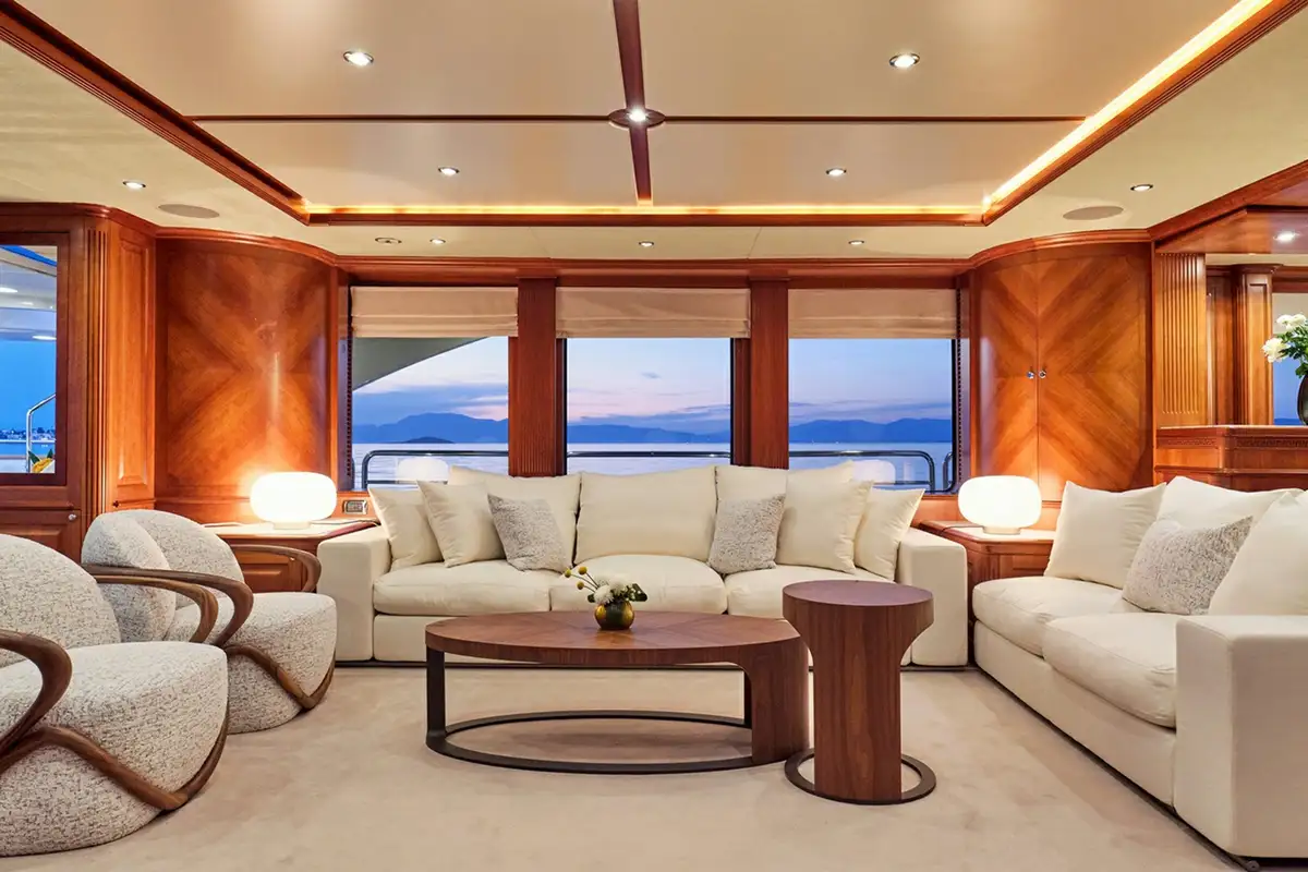 Her main deck lounge is iinviting and bright, with sweeping views of the seascape from both the comfortable lounge and elegant dining area. Directly above it, the upper deck lounge is a spacious living room, also with excellent views, plenty of natural light and a soothing, easygoing vibe. There’s an almost seamless flow between of these lounges and the open-air decks astern.