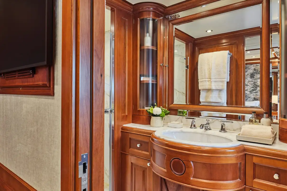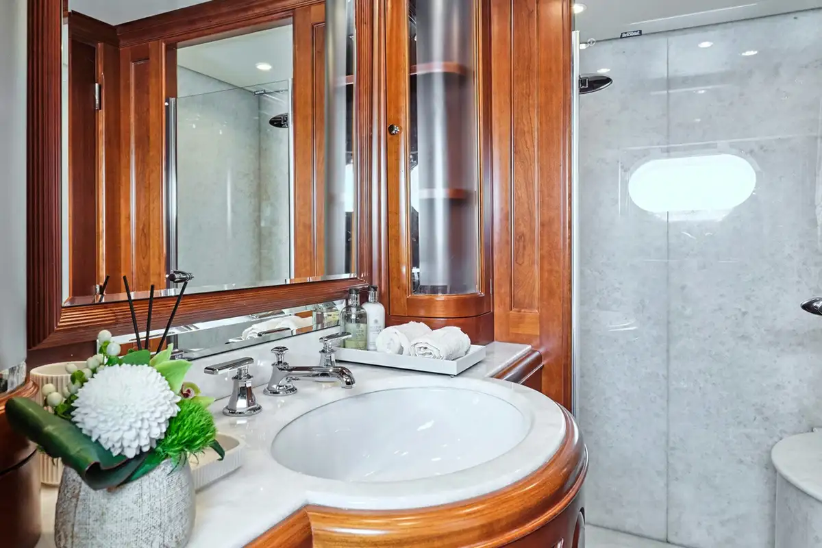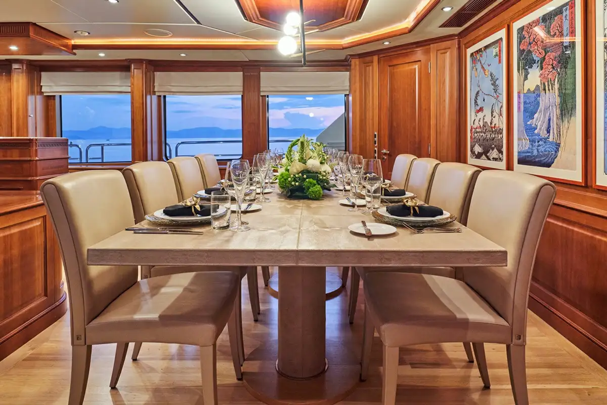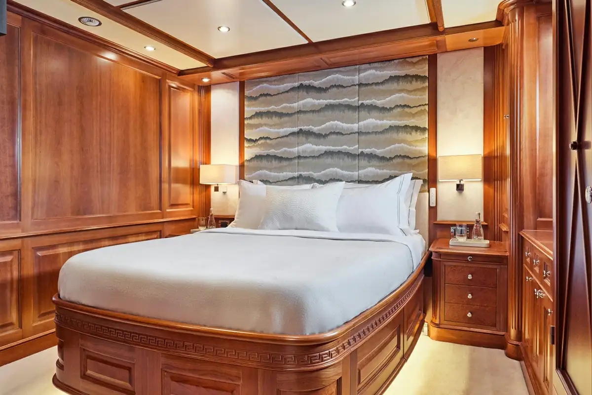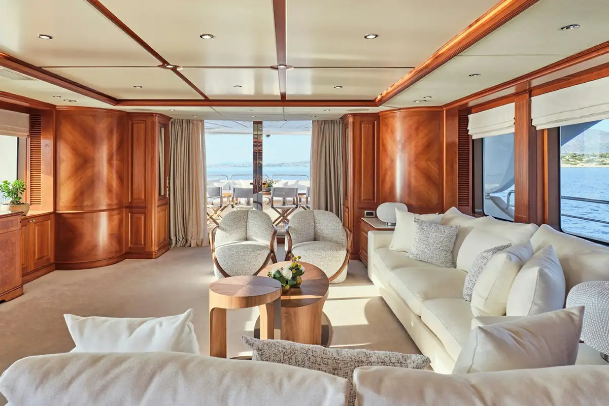 Her main deck lounge is iinviting and bright, with sweeping views of the seascape from both the comfortable lounge and elegant dining area. Directly above it, the upper deck lounge is a spacious living room, also with excellent views, plenty of natural light and a soothing, easygoing vibe. There’s an almost seamless flow between of these lounges and the open-air decks astern.