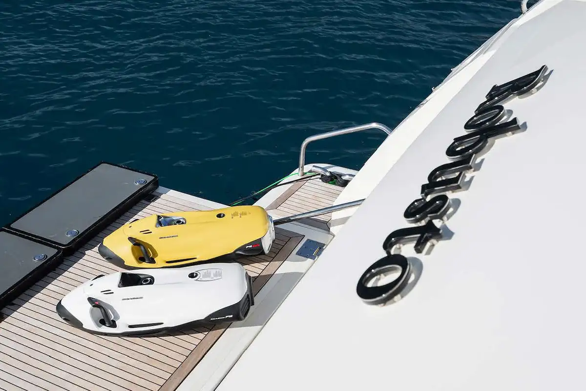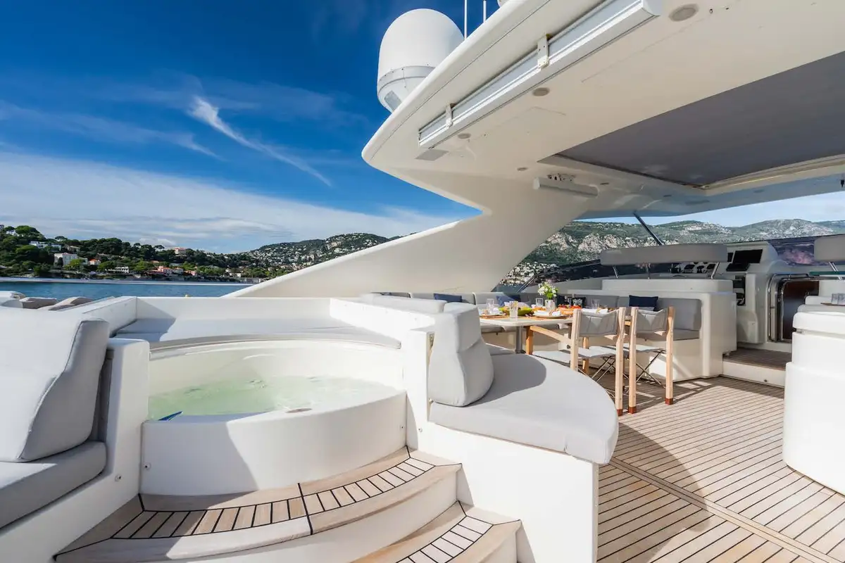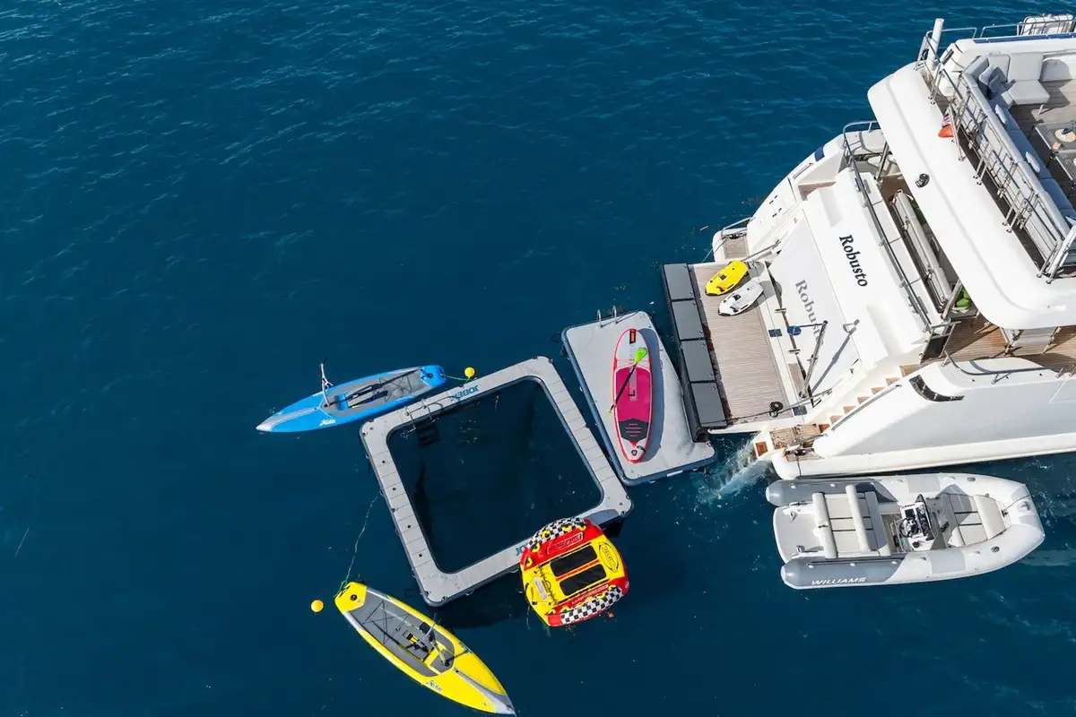 For entertainment, a generous living area awaits on the interior with a lounge and dining table, which seats up to 8 guests. The large flybridge with a shallow jacuzzi has seating, sun pads, a bar area with BBQ and a small area to enjoy al fresco dining under shade if you wish. On the rear deck a comfortable sofa area is laid out, perfect for drinks in the evening. The swim platform, created when the garage door is open, offers a great area for everyone on board to enjoy life by the sea. For those requiring stability entering the water from ROBUSTO, she has a solid staircase which enters the water from the swim platform.