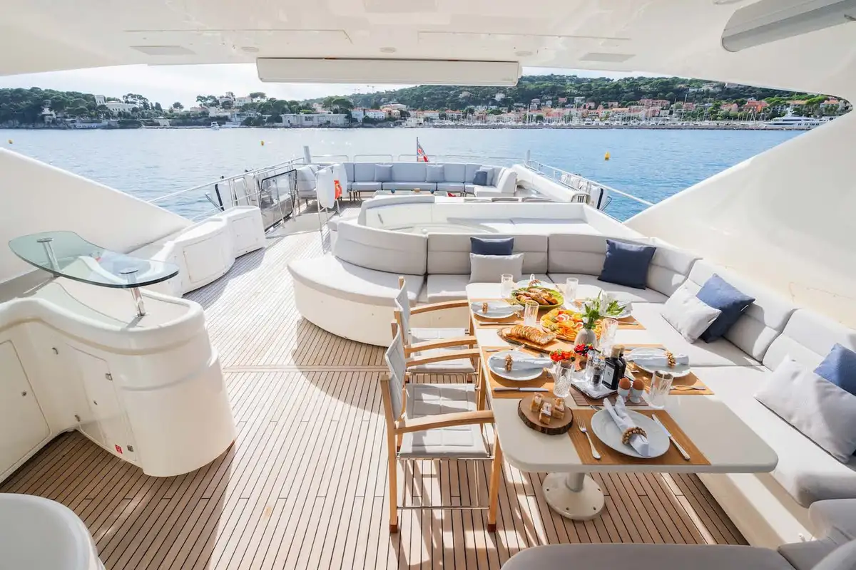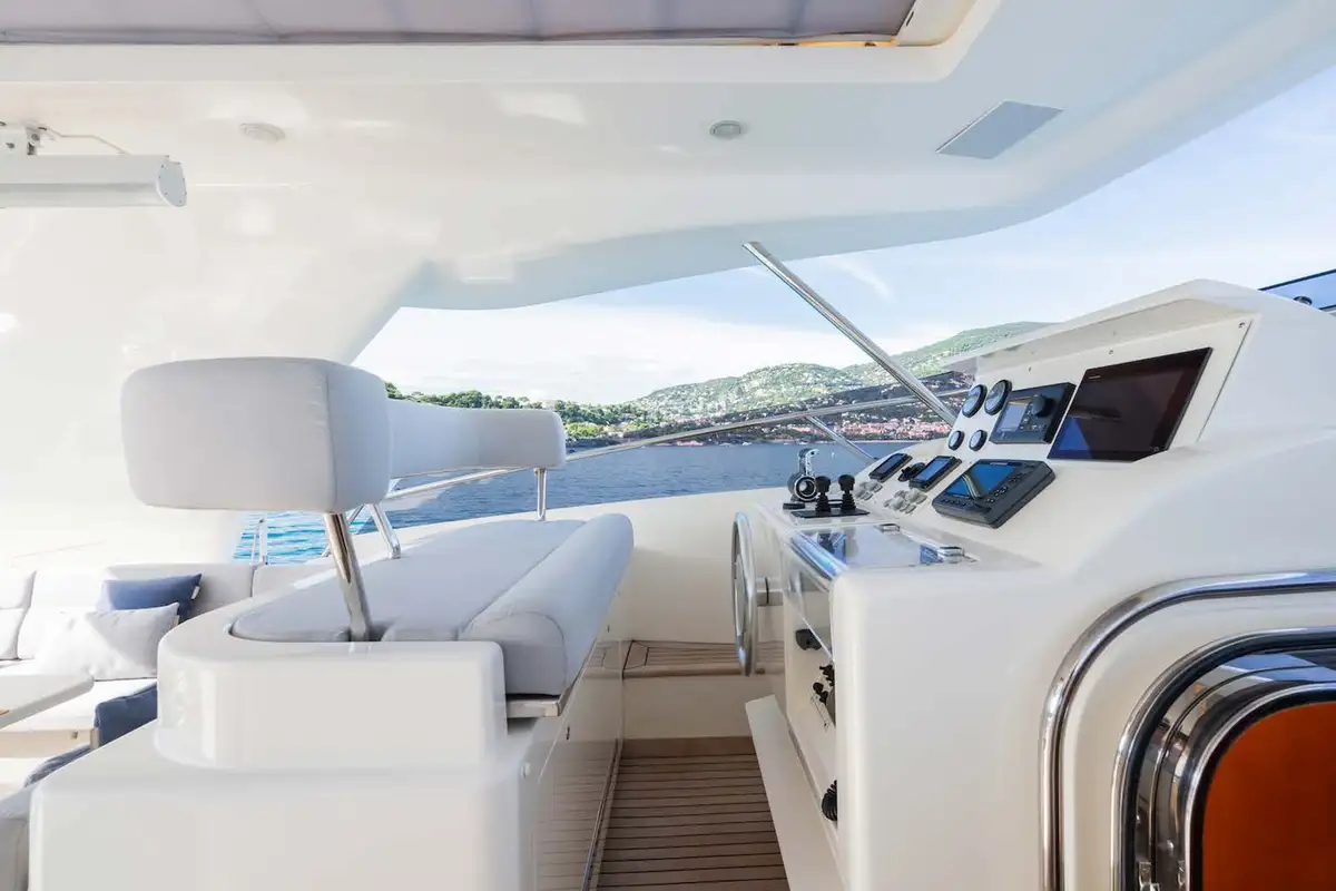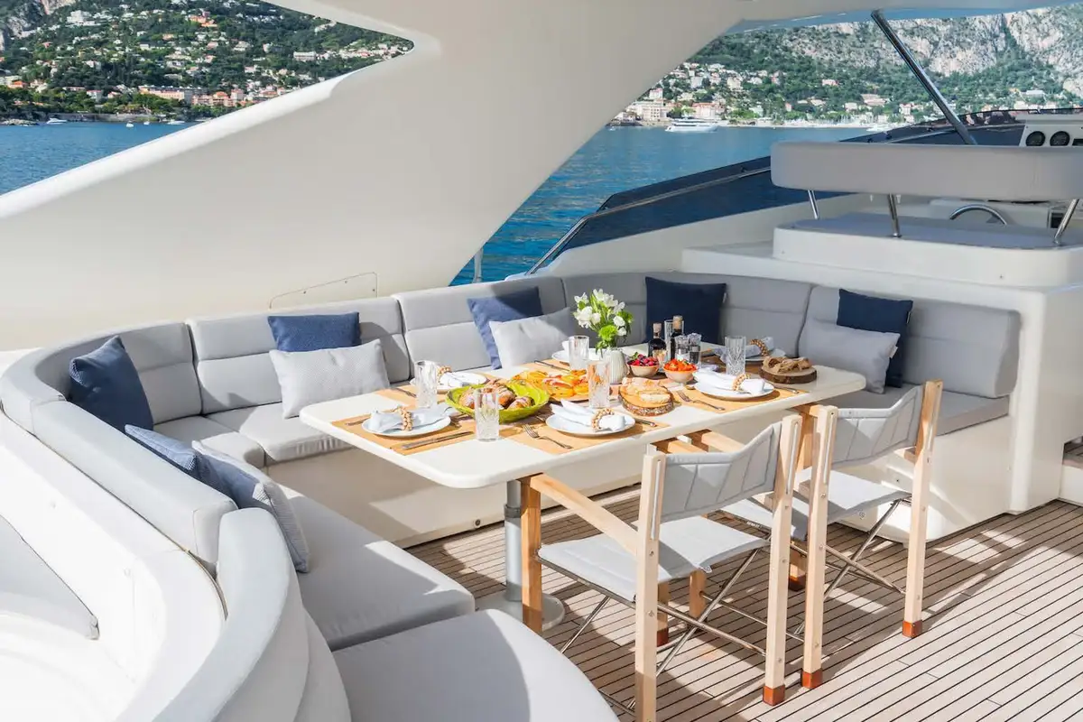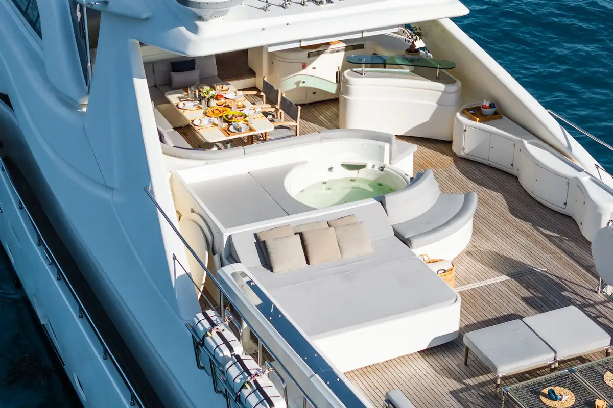For entertainment, a generous living area awaits on the interior with a lounge and dining table, which seats up to 8 guests. The large flybridge with a shallow jacuzzi has seating, sun pads, a bar area with BBQ and a small area to enjoy al fresco dining under shade if you wish. On the rear deck a comfortable sofa area is laid out, perfect for drinks in the evening. The swim platform, created when the garage door is open, offers a great area for everyone on board to enjoy life by the sea. For those requiring stability entering the water from ROBUSTO, she has a solid staircase which enters the water from the swim platform.