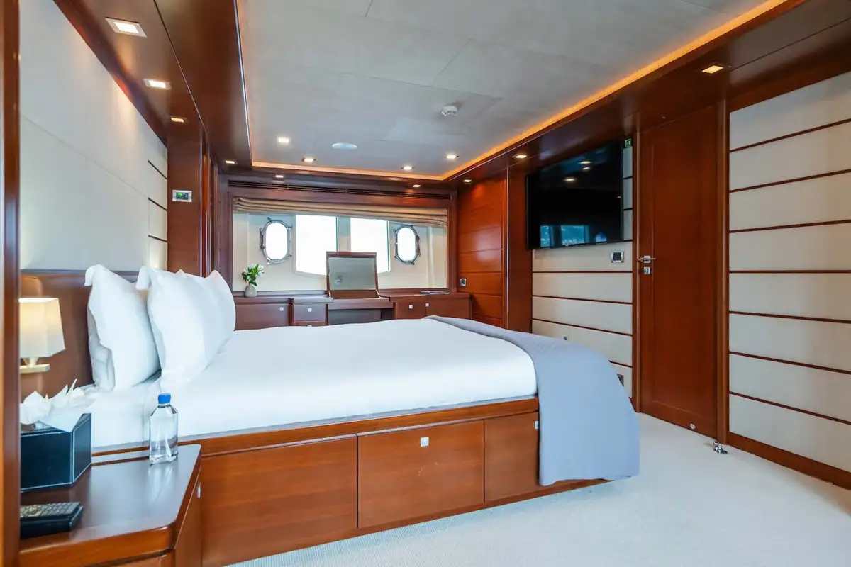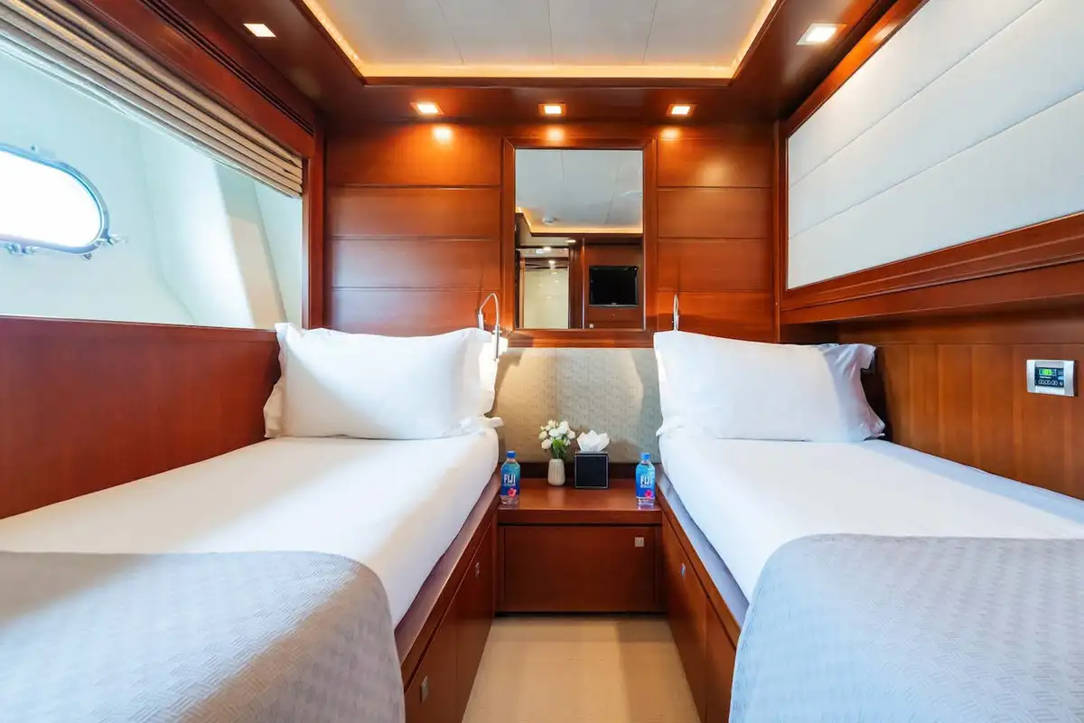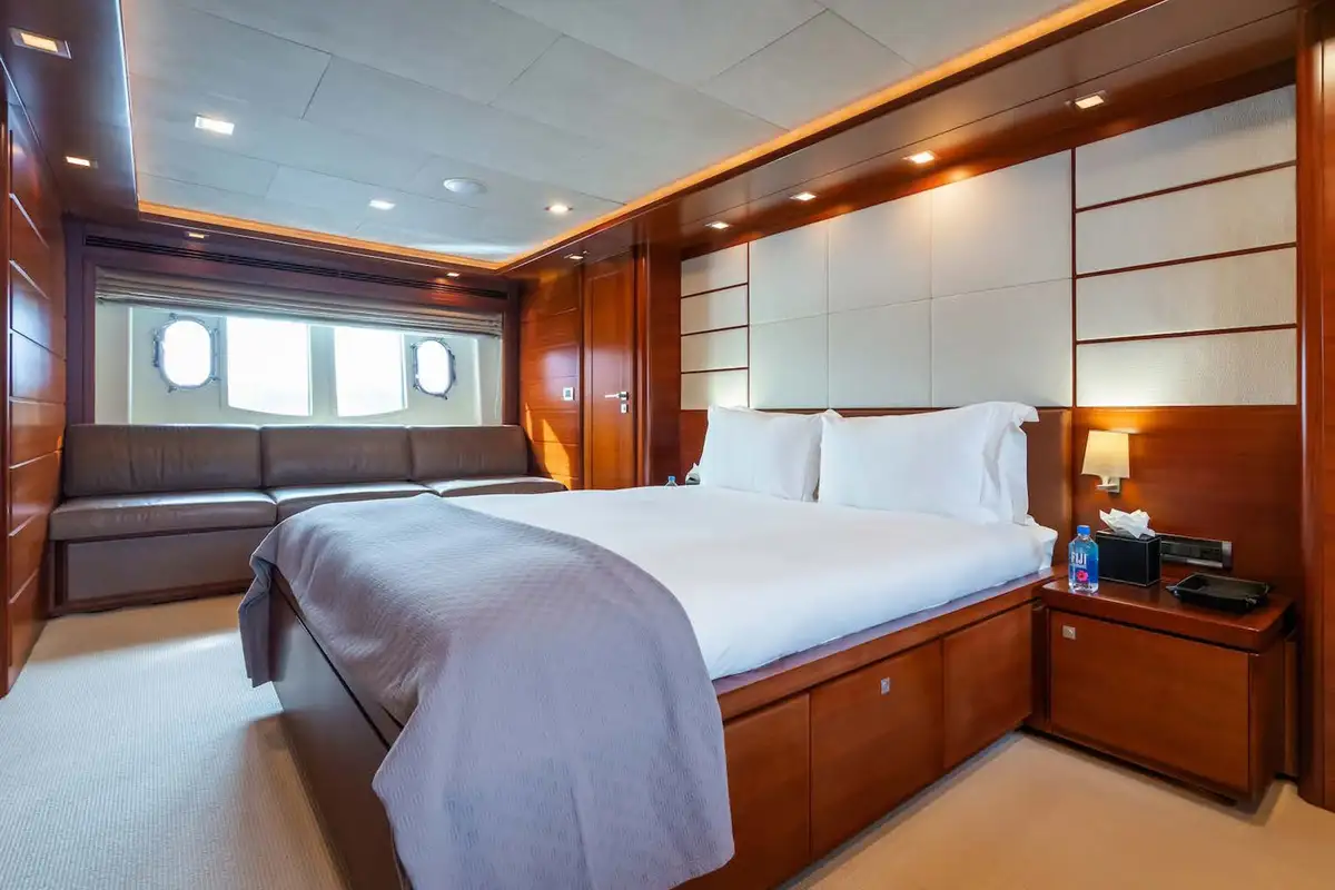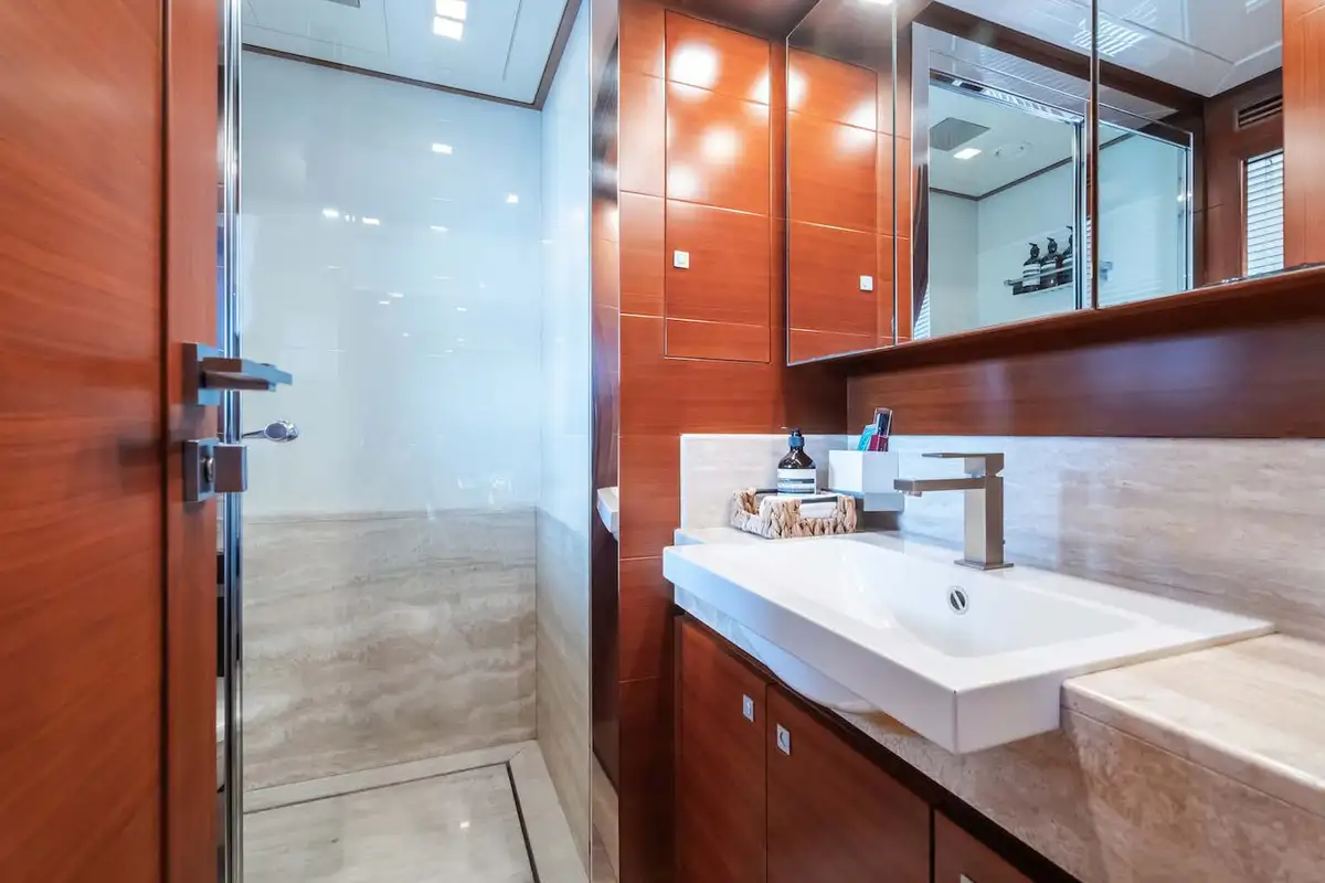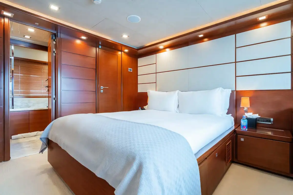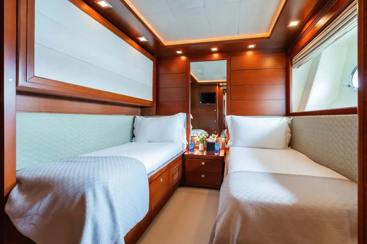 The full beam master cabin, complete with an en suite, is situated on the main deck. The guest cabins situated on the lower deck benefit from large windows bringing in natural light. The large VIP cabin could also be used as a second master cabin for charter. Alongside the VIP and master, there is a guest double cabin with ample space and the two twin cabins. Both twin cabins come with the option of pullman berths available for children’s use only.