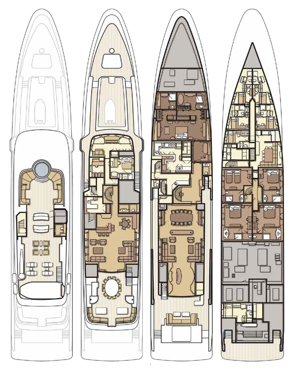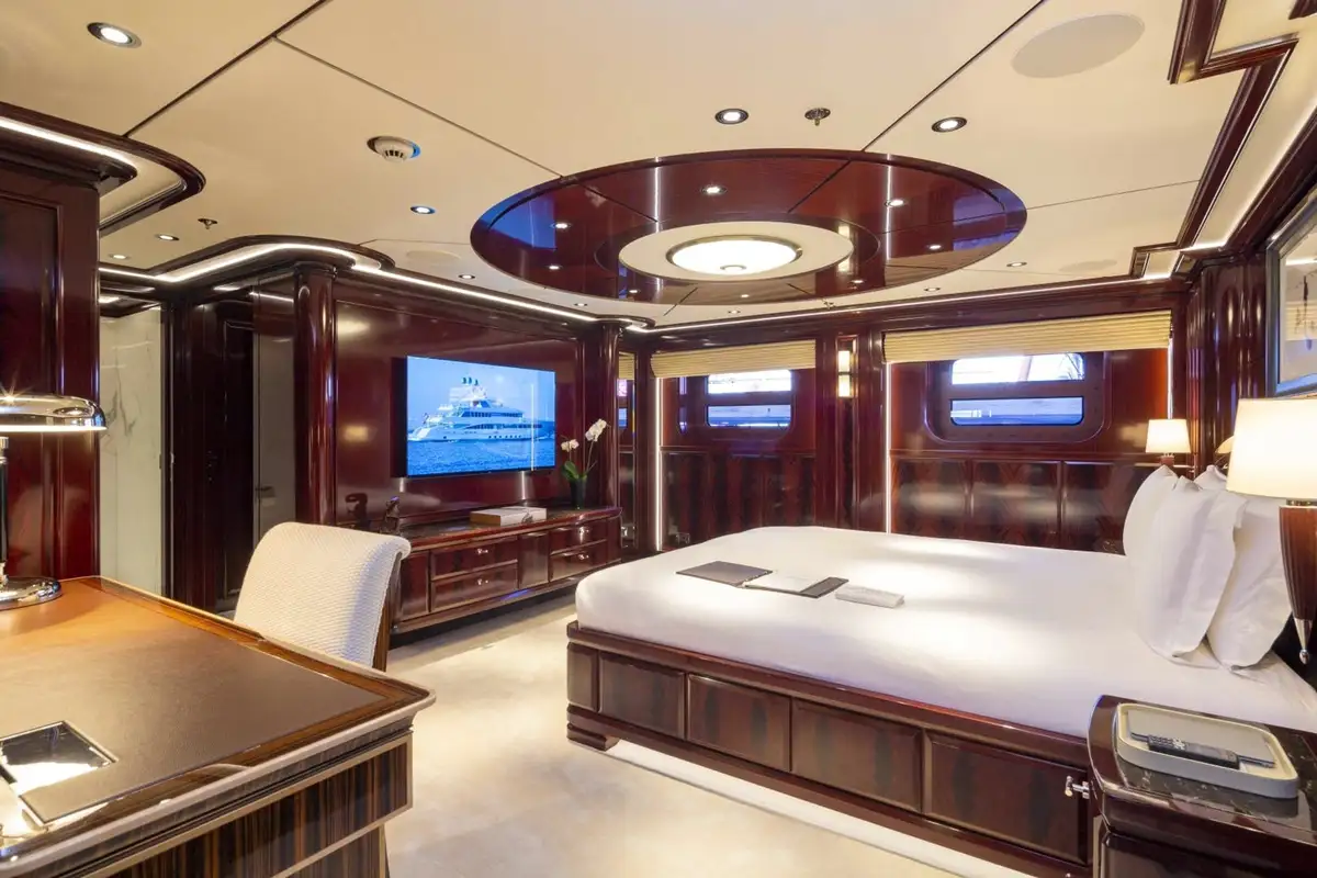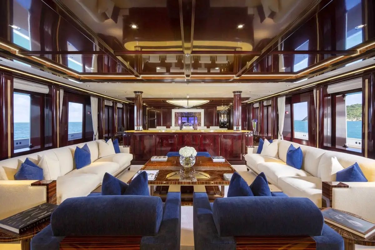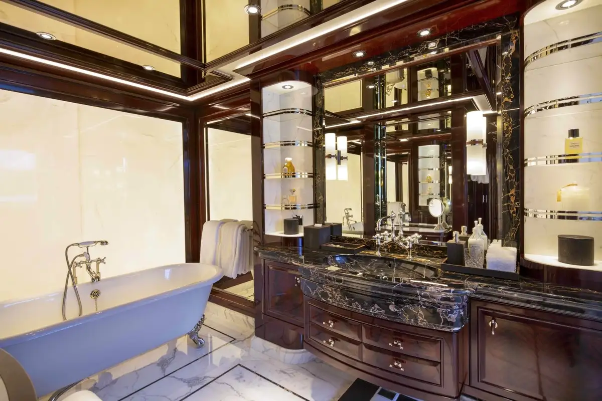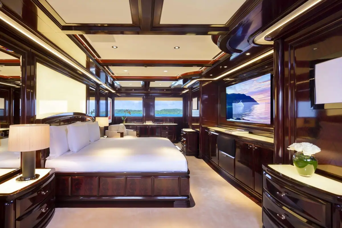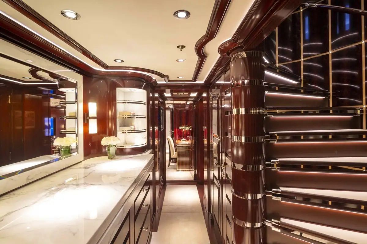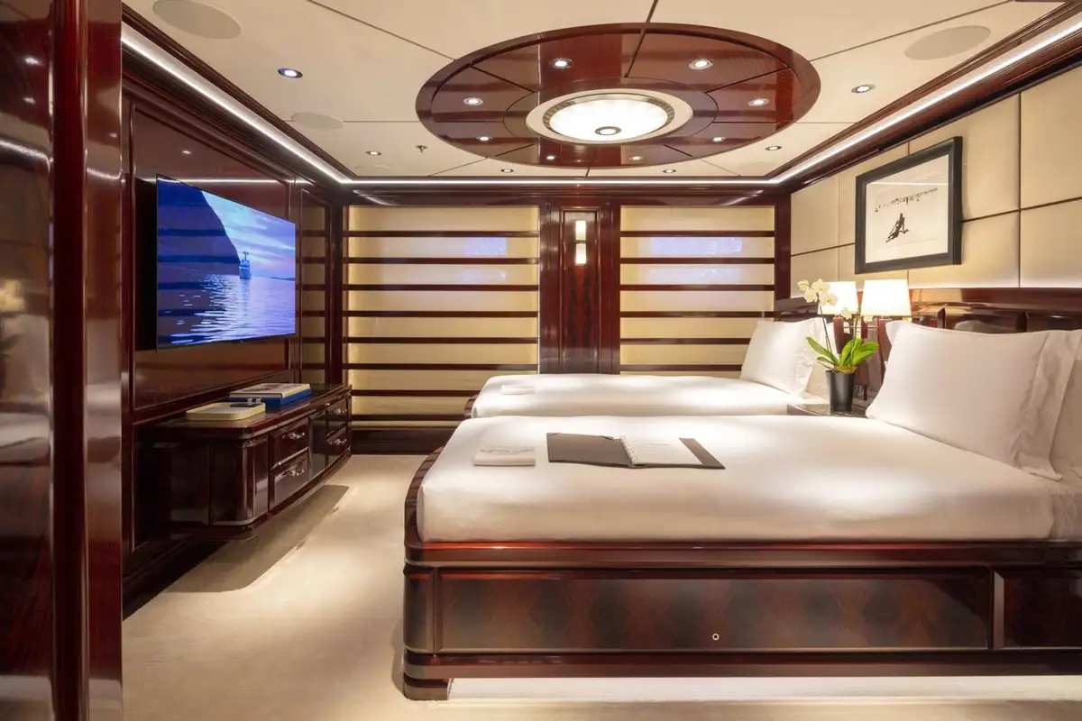 Offering so much choice from accommodation to entertainment, her interior combines classic styling with contemporary furnishings and state of the art AV and IT systems. Both the main deck lounge and sky lounge are decorated with glossy and veneered wood with light stones and backlit pure white onyx, creating a warm and relaxing ambience. Guest accommodation is for 10 guests in five luxurious cabins, including a master cabin on the main deck. Three doubles and one twin cabin, all en suite, are located on the lower deck with plush soft furnishings.