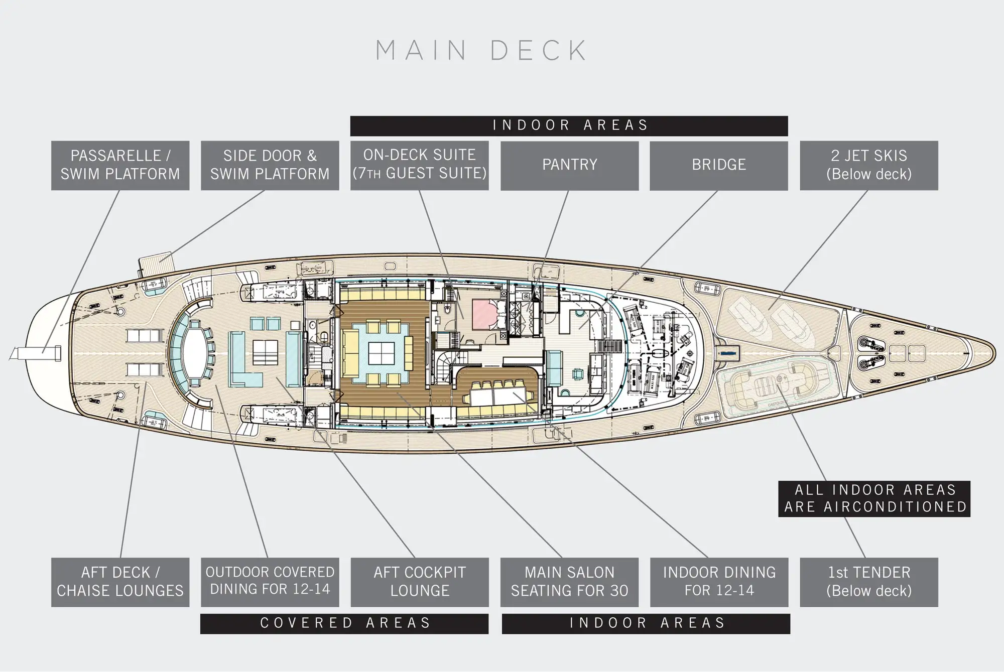 There’s a huge choice of seating and lounging areas inside and out, with a proper superyacht sundeck up top featuring a heated jacuzzi, spacious sunpads and shaded al fresco dining. When the anchor goes down there are vast swathes of open-air deck space to enjoy, with plenty of intimate nooks from bow to stern. She becomes a cool oasis in the heat of the midday sun with ample shade from umbrellas and awnings, plus the fully shaded aft deck dining and lounge area with a 60-inch TV/cinema system. There’s also a full gym on board and two fold-down platforms give direct access to the sea. She’s also loaded small craft and toys: two jetskis, four SeaBobs, a flyboard, water skis, wakeboards and a beautiful 38ft classic speedboat for picnic excursions.