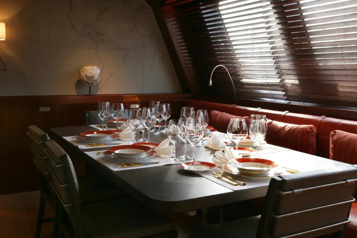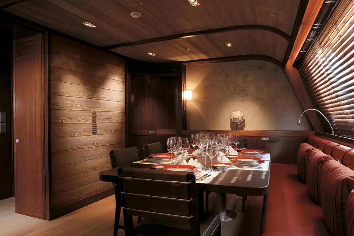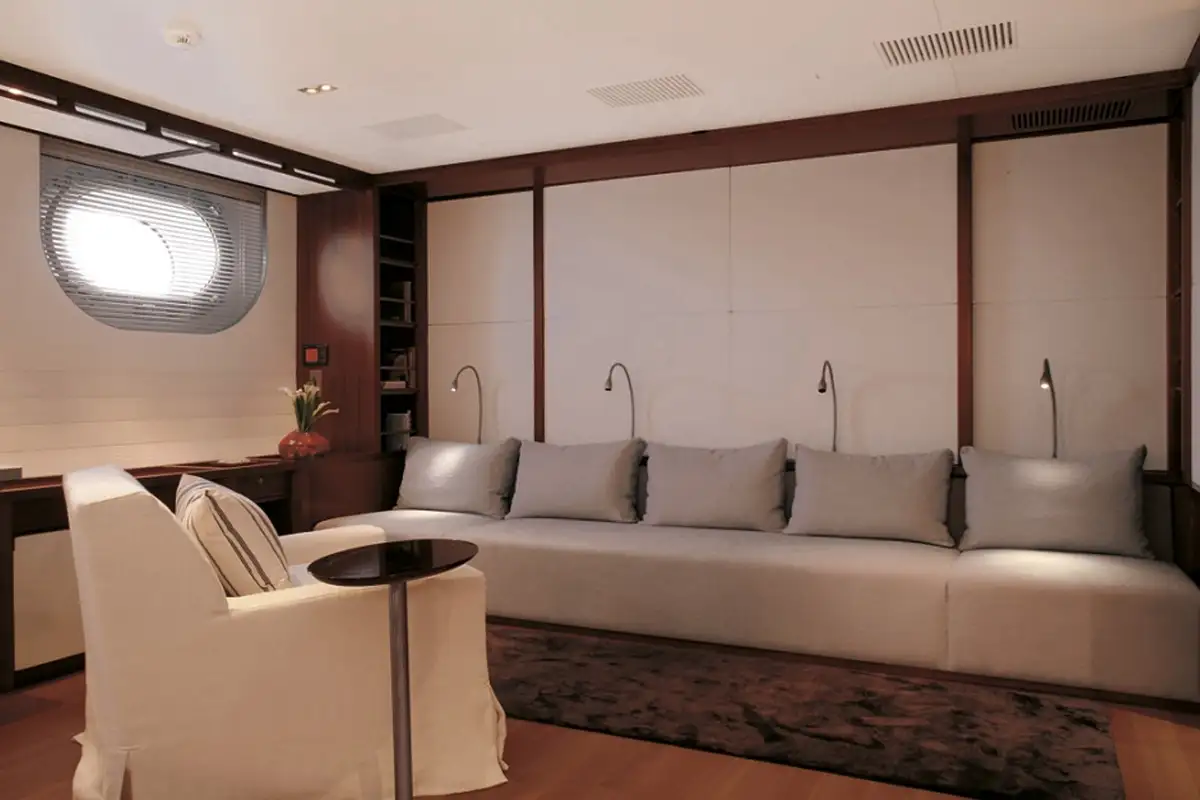 Step inside and you’re in for a treat. The huge main lounge – which can host a full-scale party with seats for 30 people – is a masterful fusion of classical marine tradition and contemporary elegance. Its stand-out features include crisp white linen sofas, Hermès leather banquettes and beautiful hardwood panelling. Uniquely in the Perini Navi fleet, there’s also an on-deck VIP cabin.
