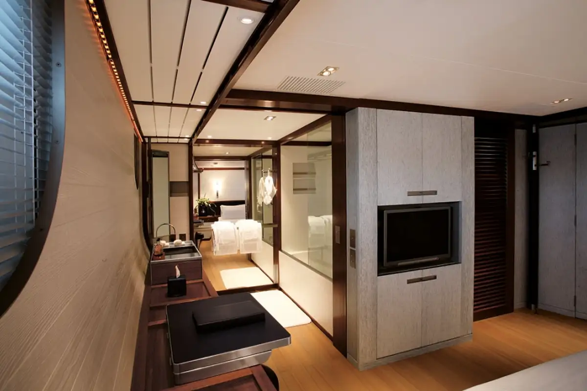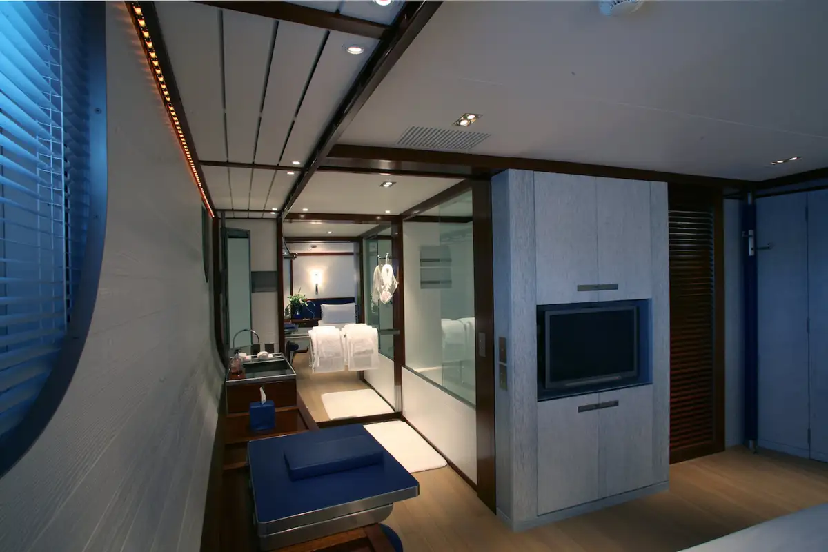 The lavish luxury continues on the lower deck, where you’ll find the full-beam master suite (with two separate bathrooms) plus five other notably stylish cabins including two double VIP suites.