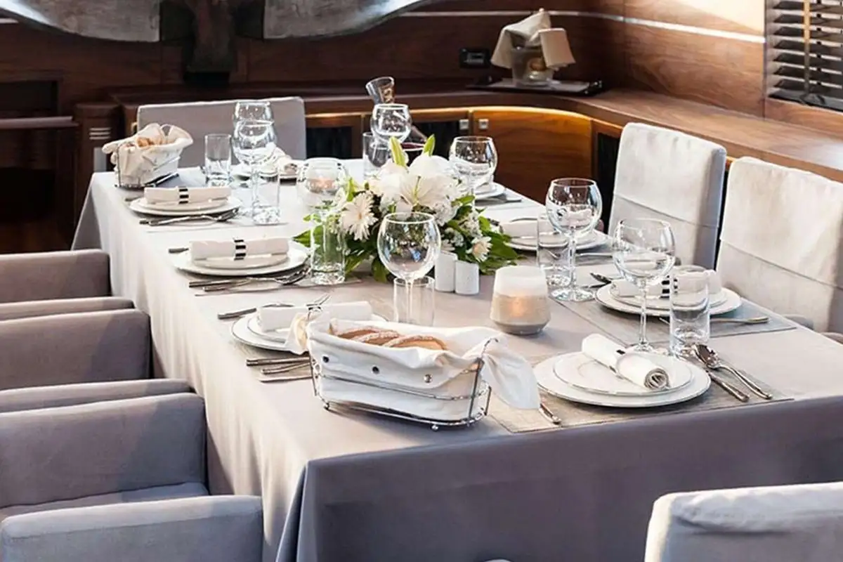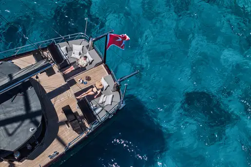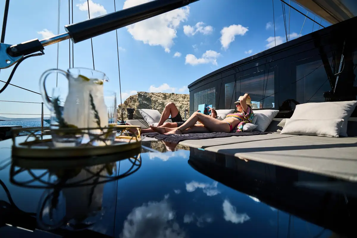 The afternoon offers a variety of options. Explore a charming port town or embark on a scenic clifftop hike, or simply unwind on the sun pads of the aft and the foredeck, enjoying a refreshing cocktail and the company of fellow guests. Escape the midday heat in the elegant lounge, relax with a drink at the sit-up bar, or engage in a friendly game of backgammon.
