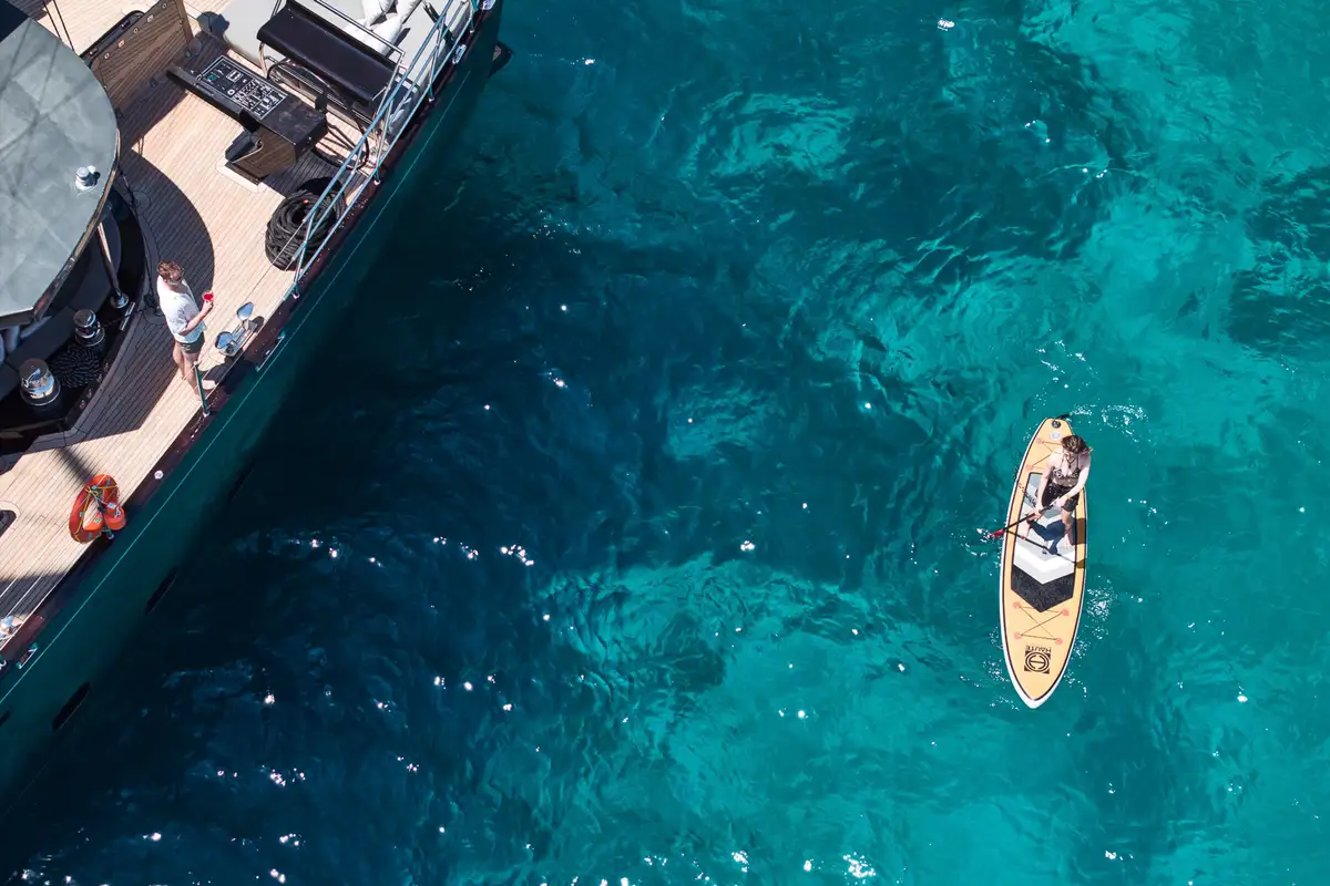 Begin your day with a refreshing swim off the stern, followed by a healthy al fresco breakfast in the spacious and comfortable cockpit dining area. The swim platform, which submerges a metre below sea level for easy access, serves as your gateway to a morning of fun on the water. Explore the surrounding areas with the available snorkelling gear, discover hidden coves by kayak or paddleboard, or experience the thrill of waterskiing and wakeboarding.