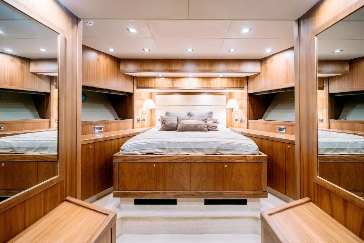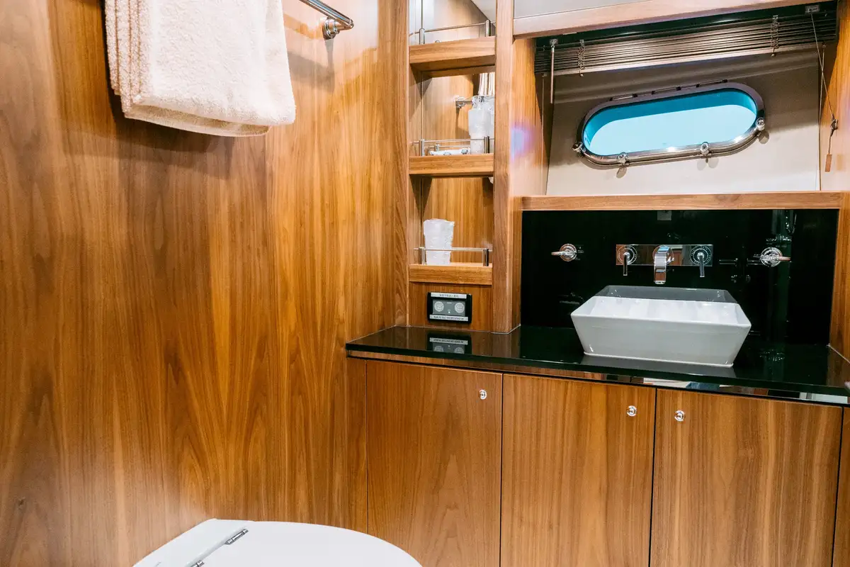 Guests can gather, recline and relax in two distinct social areas on her superb and spacious exterior decks, with easy access between them. For the very best view on board, the open foredeck lounge is the place to be. The snug and sheltered aft cockpit is ideal for elegant dining as well as it flows seamlessly into the comfortable main deck saloon. Here in this fully climate-controlled space – which can be completely enclosed when there’s a chill in the air outside – you’ll find plenty of stylish sofas and an inside dining table, with excellent views of the cityscape through panoramic windows wherever you choose to sit.