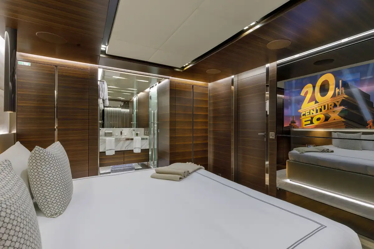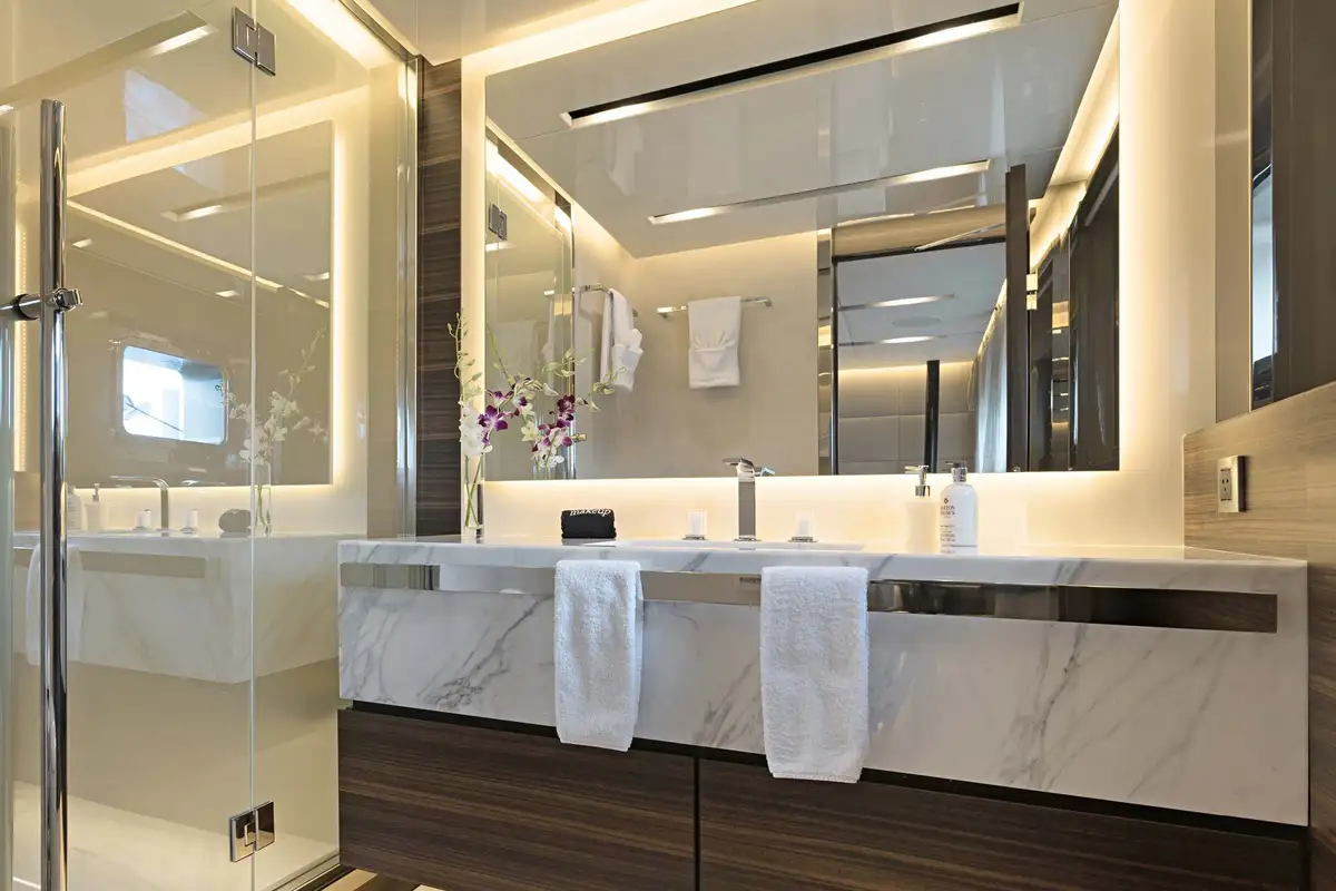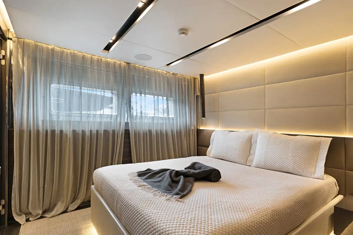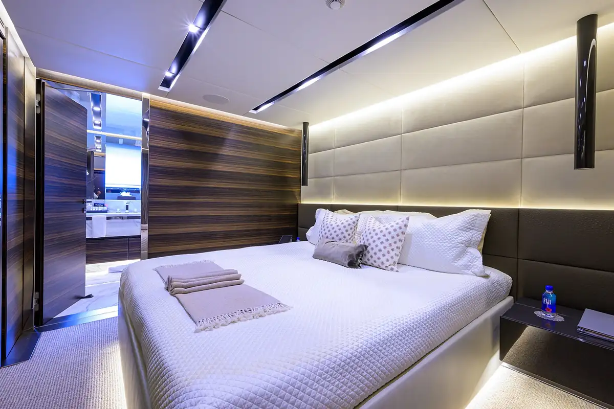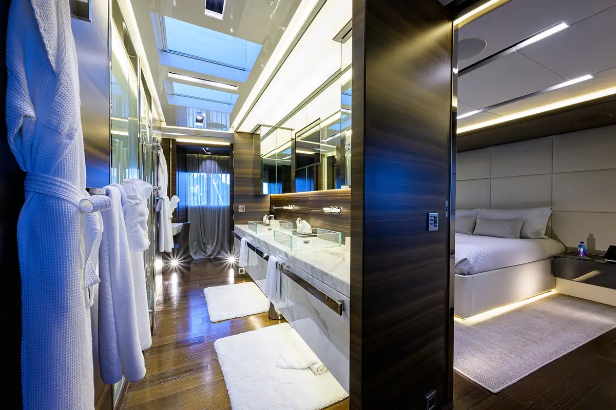 Back on board, you can watch movies and sports on the retractable TV in the lounge or in the comfort and privacy of your beautiful suite. The main deck master suite is accessed via a private office and one of two dressing areas, between them is the delightful en suite bathroom with his and hers sinks. On the lower deck, there are two full-beam double suites as well as a double and twin-berth suite.