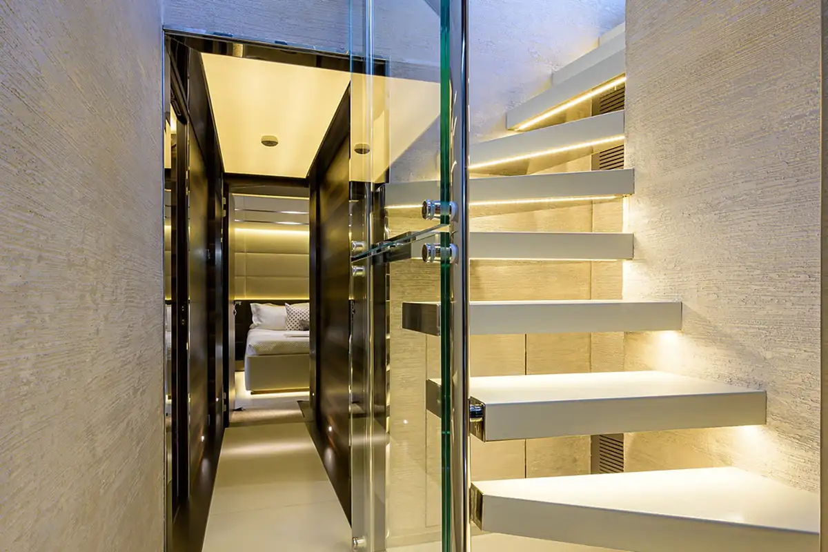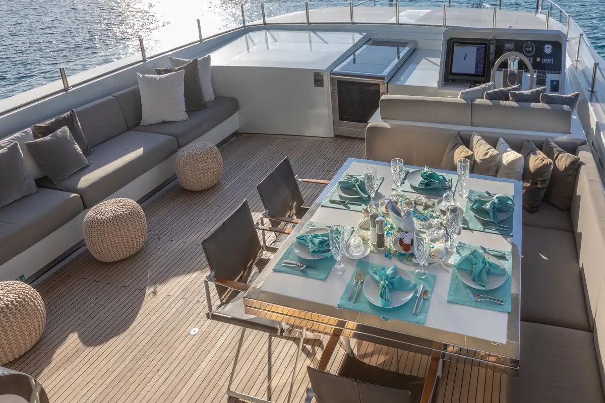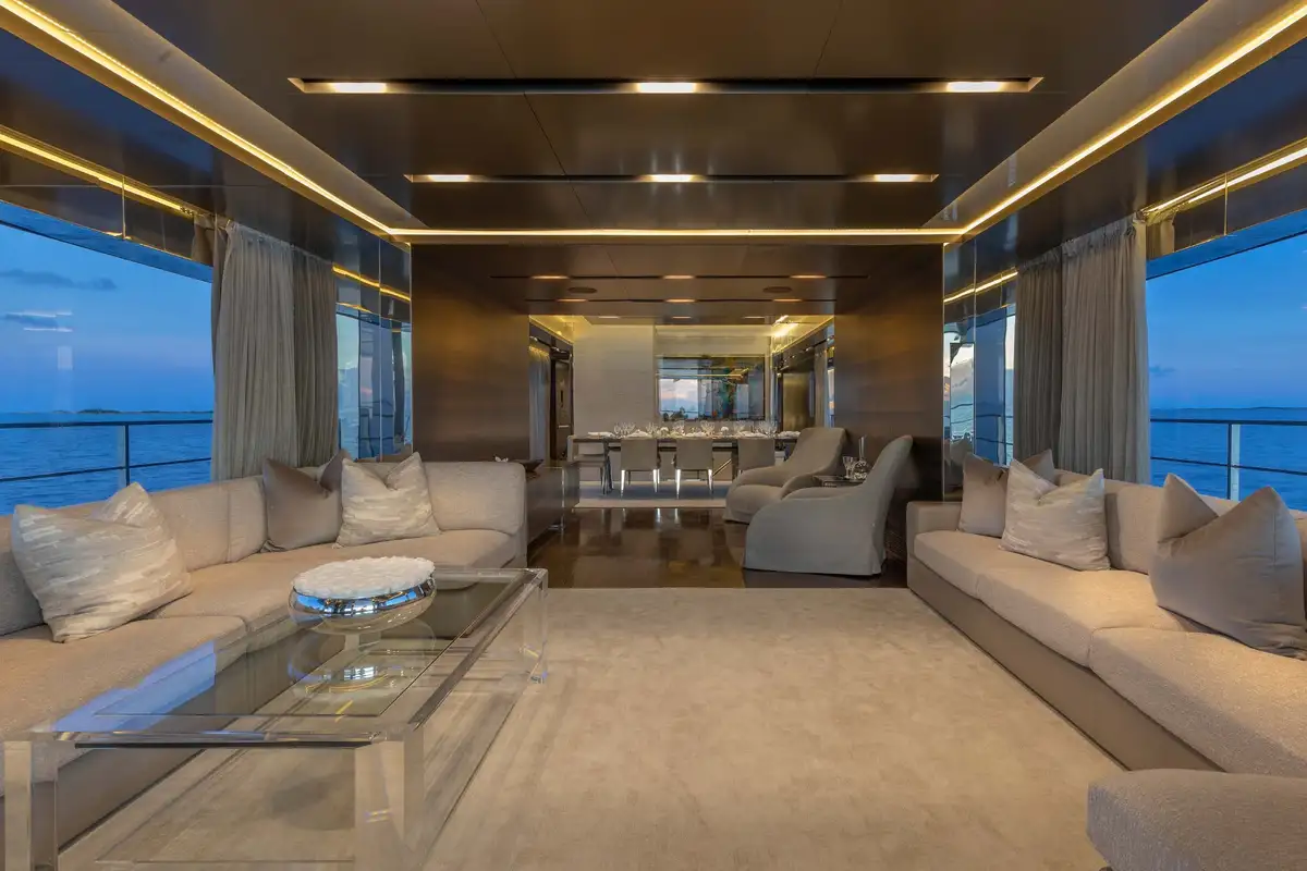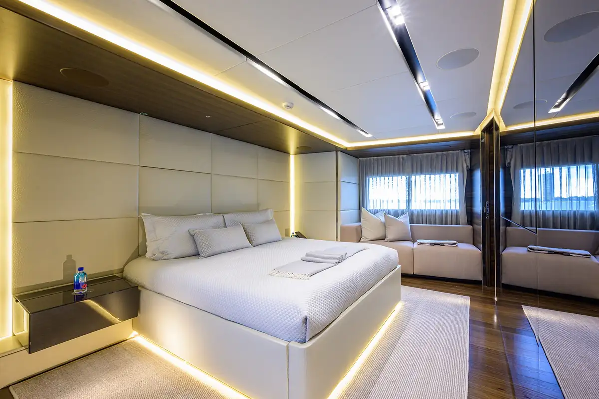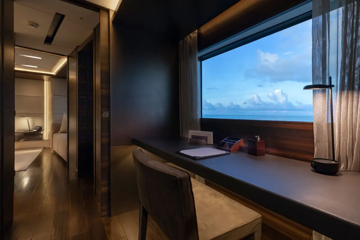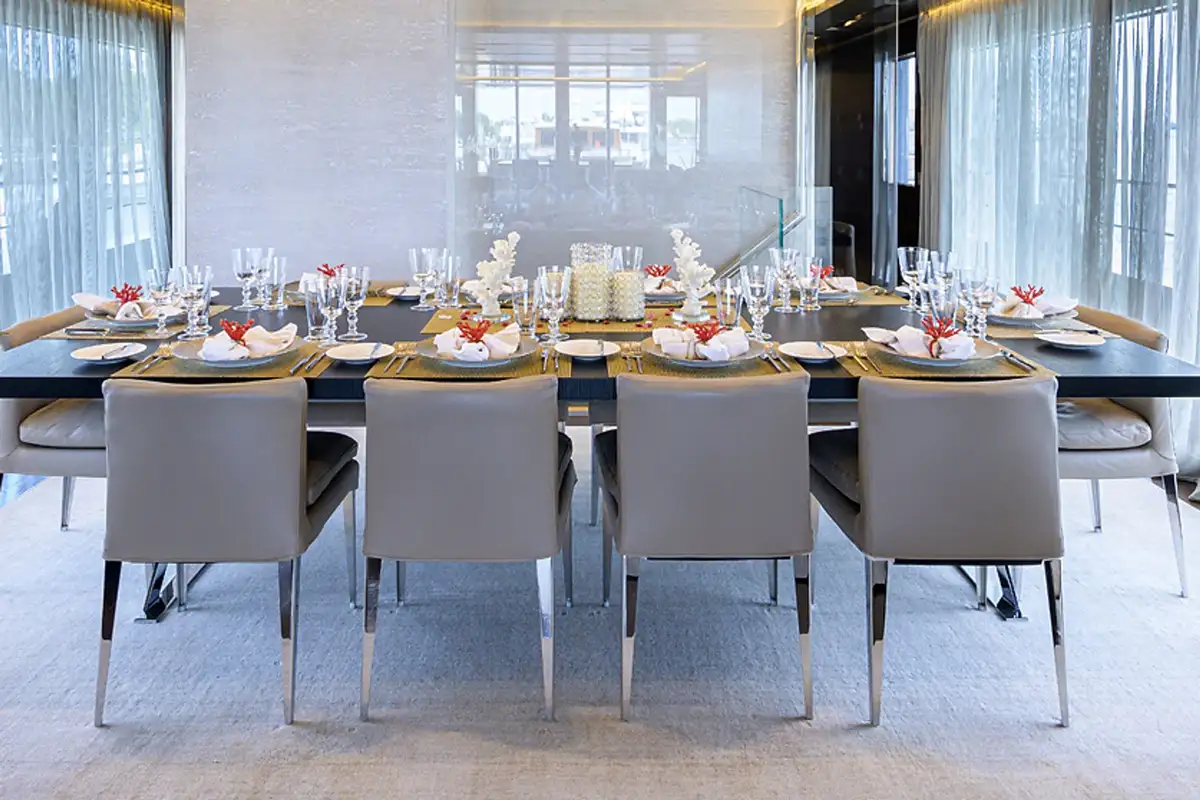 The decks of SAFE HAVEN are perfect for dining al fresco with friends and family, with a dining area on the sprawling sun deck and another shaded in the cockpit, you can delight in scents and views while enjoying memorable meals. For more sophisticated occasions, the formal dining area in the main lounge is the place to be. Floor-to-ceiling glazing can slide open to create an inside/outside space or be drawn close for comfort and privacy. One thing is for sure, whether you’re enjoying a sun-drenched BBQ or a five-course fine dining extravaganza, meals are a regular highlight on SAFE HAVEN.