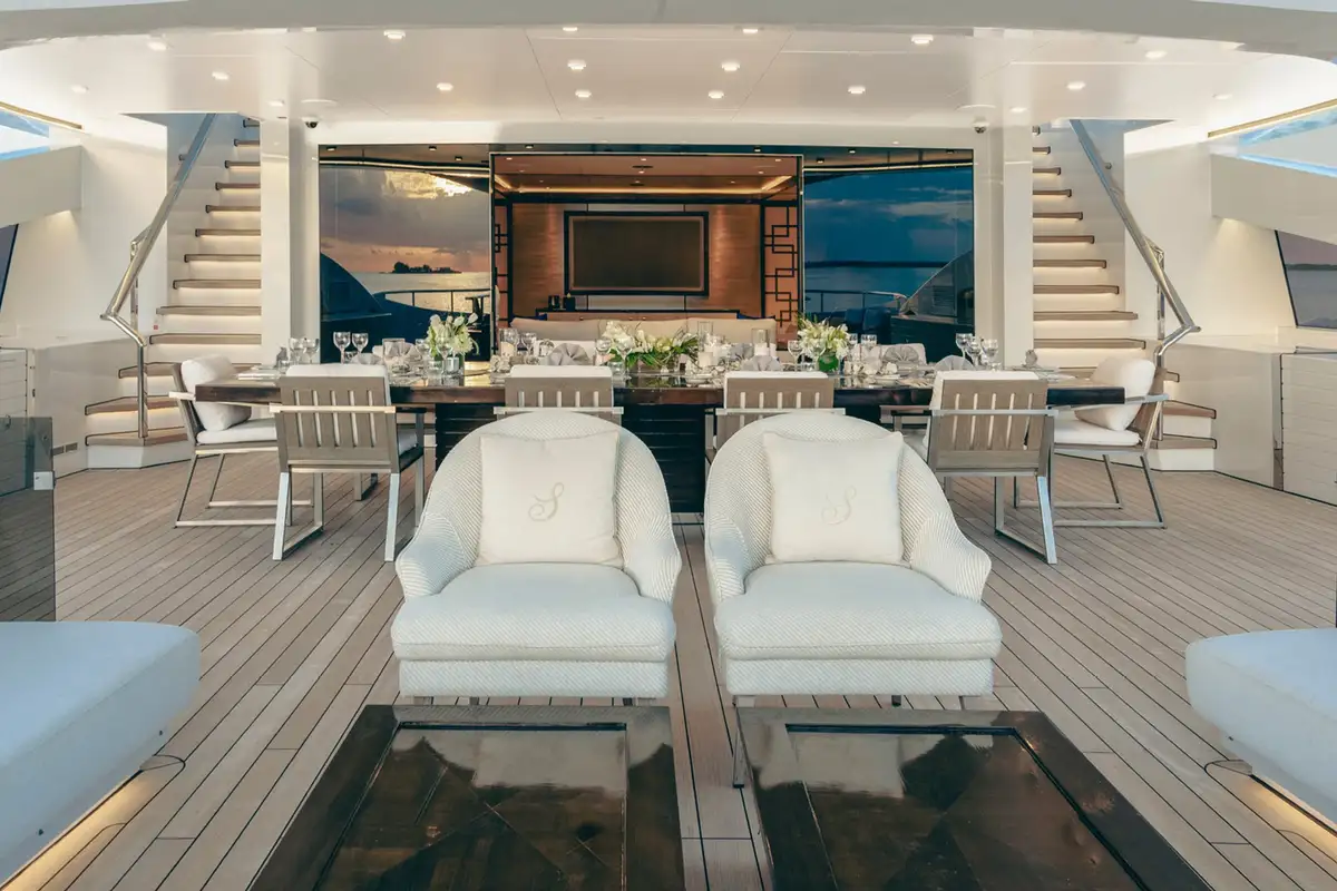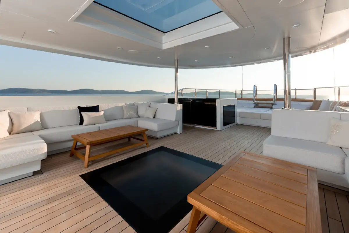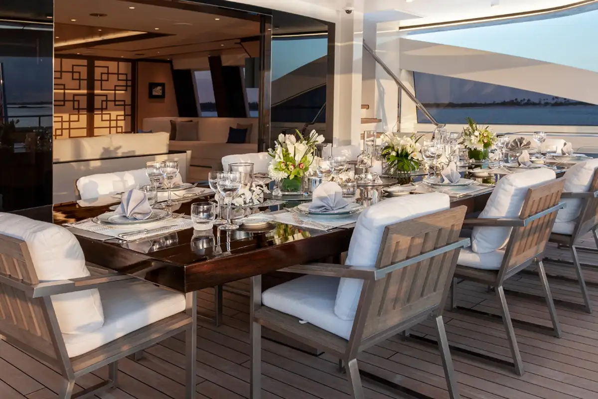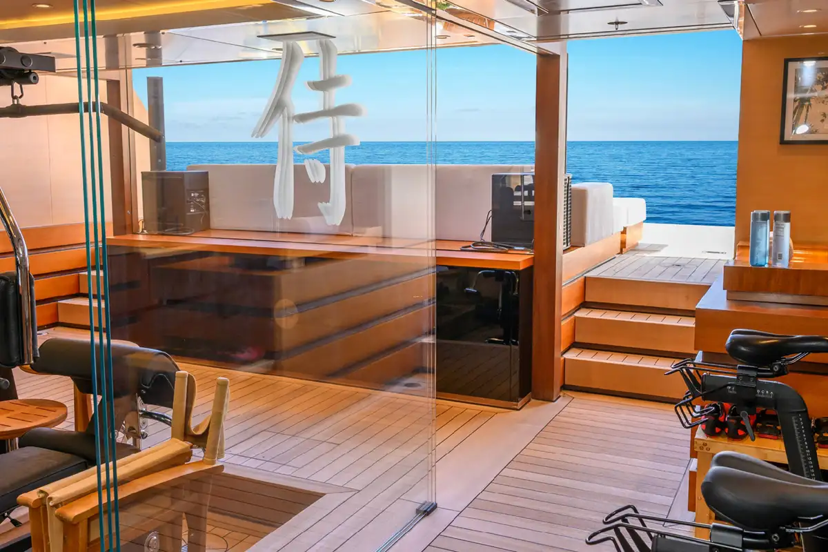 Kick off your morning on SAMURAI with a workout in the gym, which can be opened up to the elements or enclosed for climate control. Your appetite well earned, enjoy an al fresco breakfast on the bridge deck aft, with the inviting C-shaped sofa offering shade while you discuss the day’s plans with the captain.