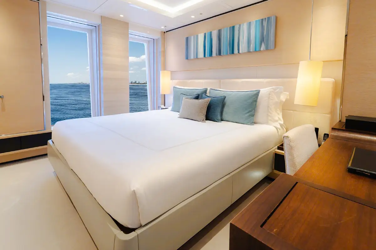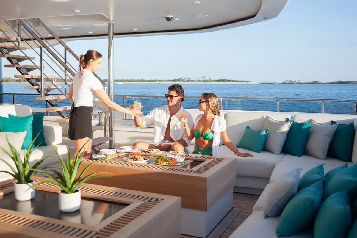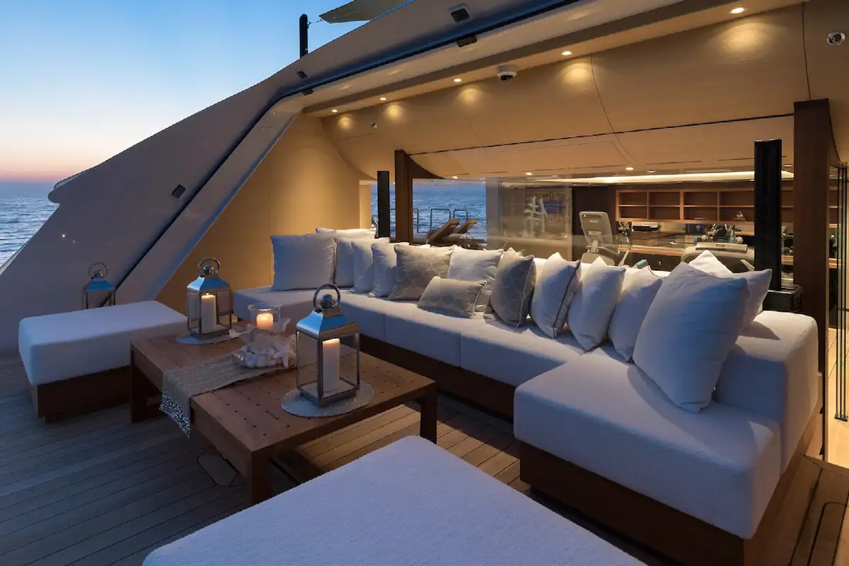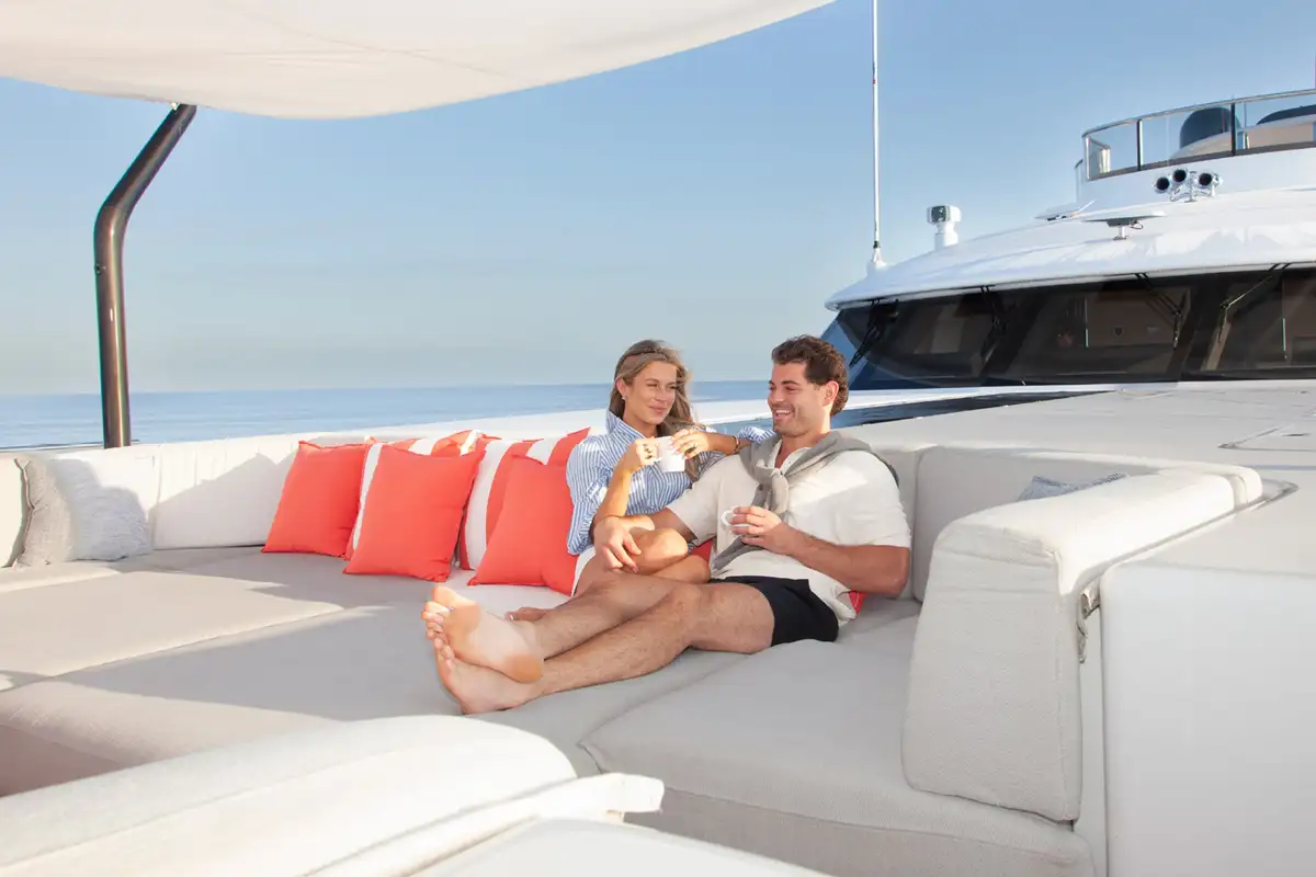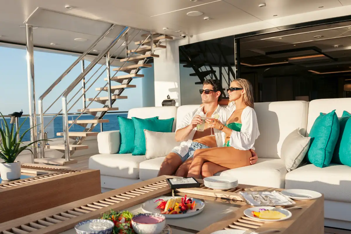 Kick off your morning on SAMURAI with a workout in the gym, which can be opened up to the elements or enclosed for climate control. Your appetite well earned, enjoy an al fresco breakfast on the bridge deck aft, with the inviting C-shaped sofa offering shade while you discuss the day’s plans with the captain.