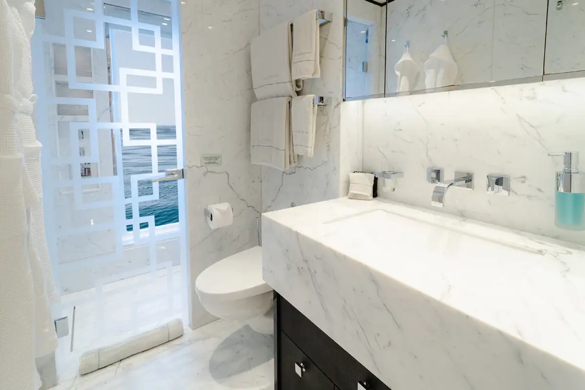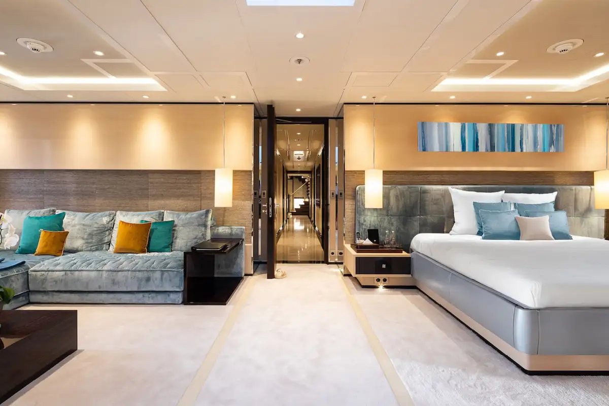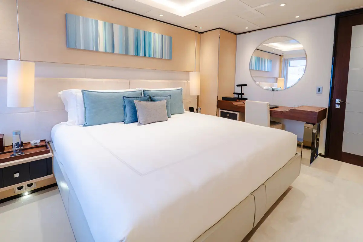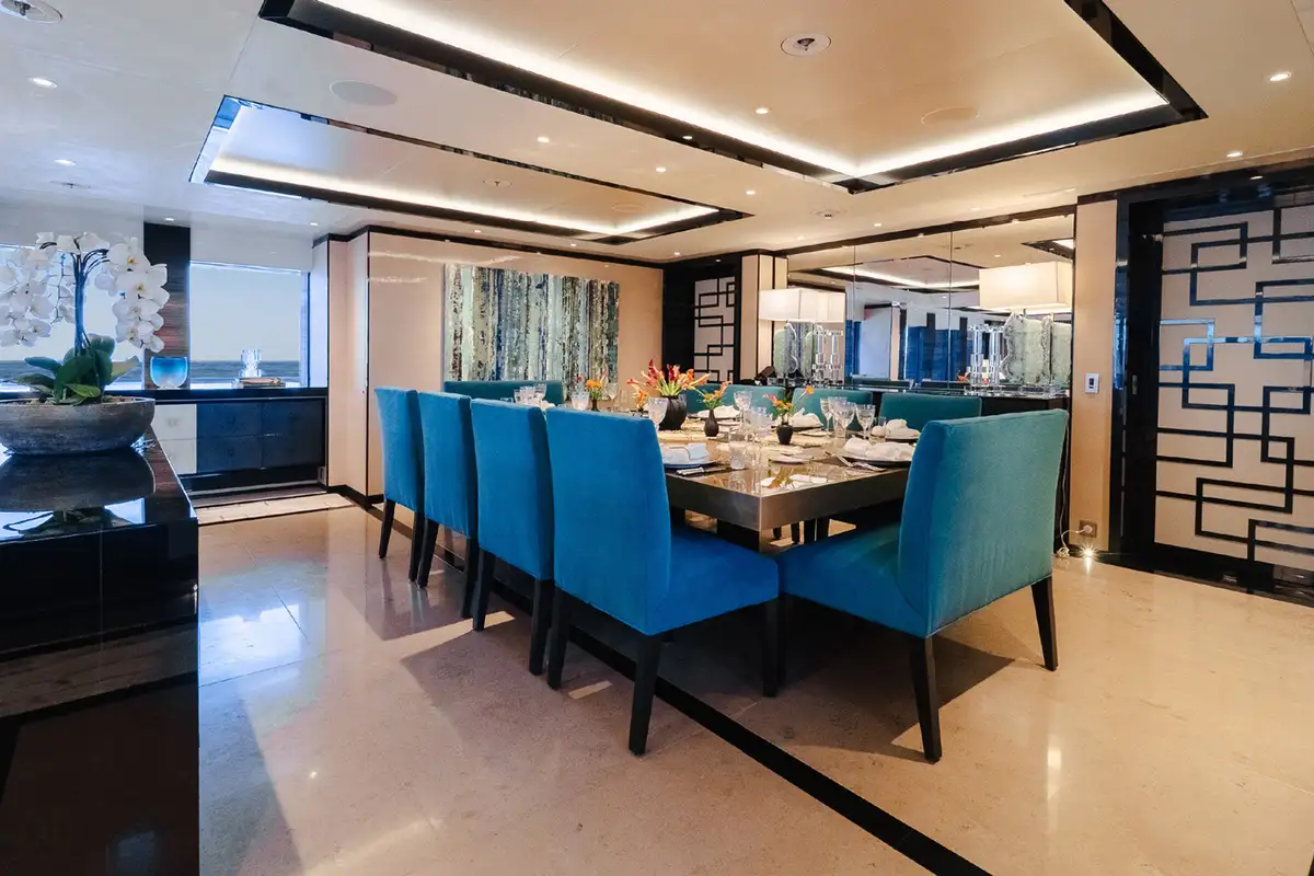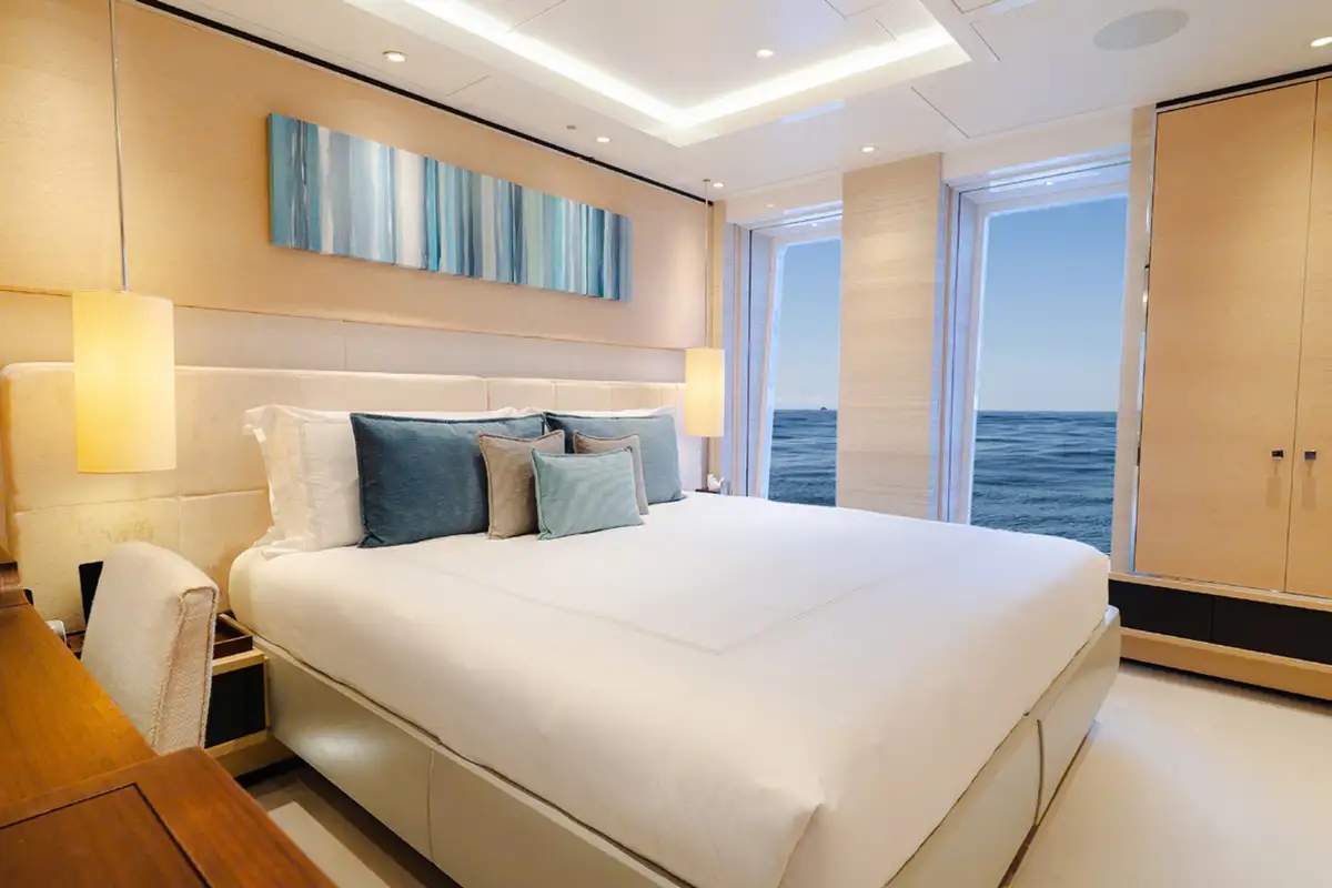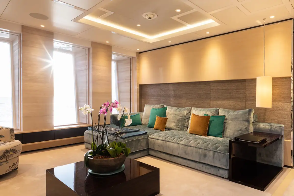 As her name suggests, SAMURAI has an Asian inspired décor, with calming cream tones accented by rich silks and velvets, and she sleeps up to 12 guests in six elegant cabins. The capacious master suite has a private lounging area, large walk in wardrobe and skylight. There are two doubles and two convertible twin/double cabins on the main deck, one of which transforms into a nursery, while there is a double cabin on the bridge deck.