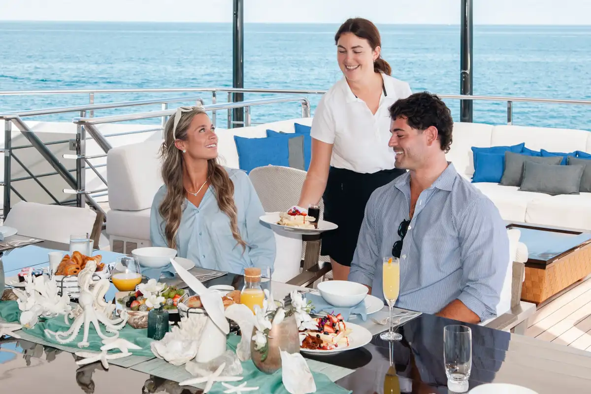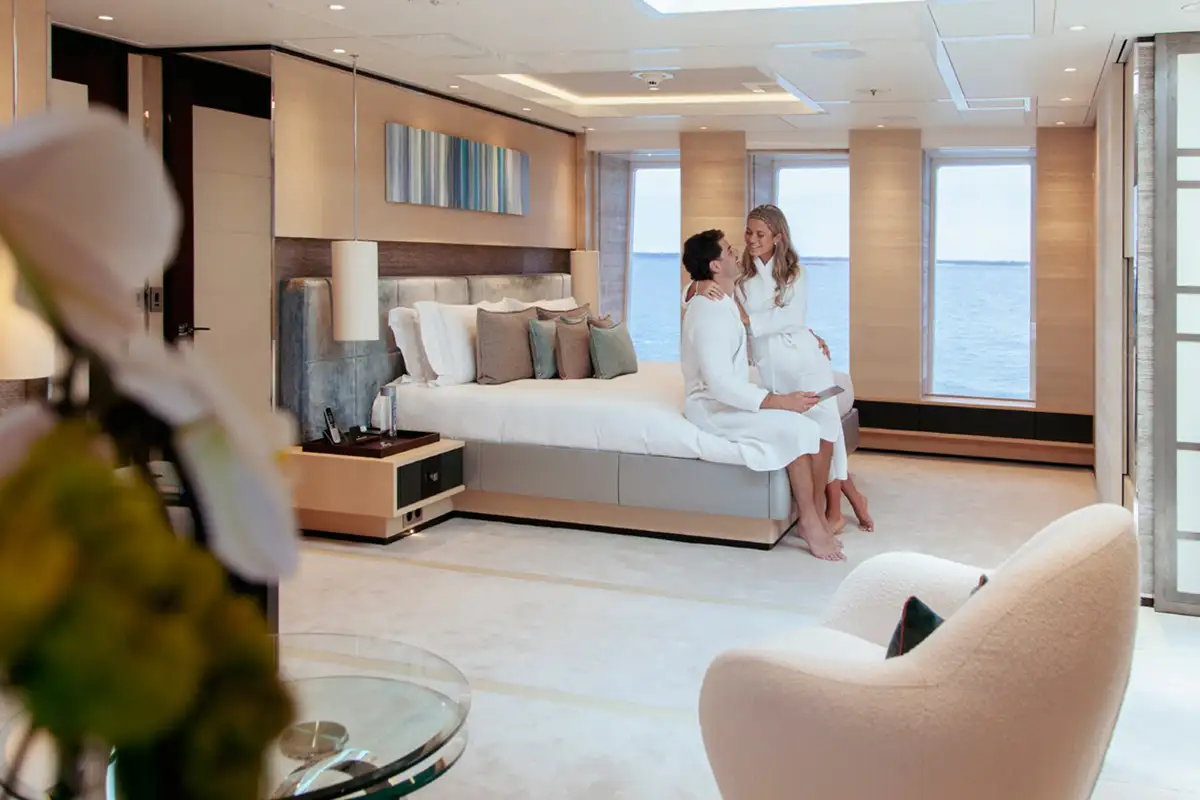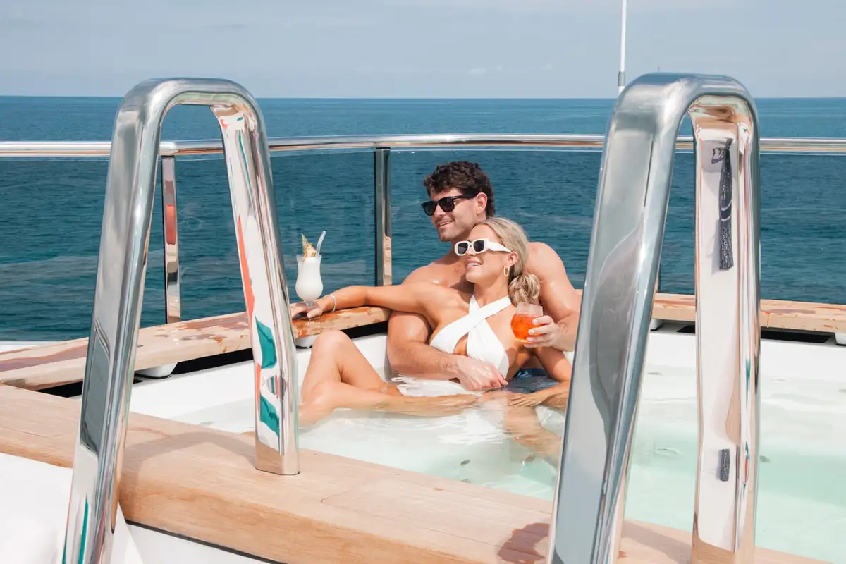 Cocktails are served in the candlelit beach club, before everyone feasts on an Asian fusion banquet in the dining room, seated at the decadent gilt table. You round off your day with a romantic nightcap back in the beach club, the water gently lapping at the hull while the shoreline’s lights twinkle in the distance.
