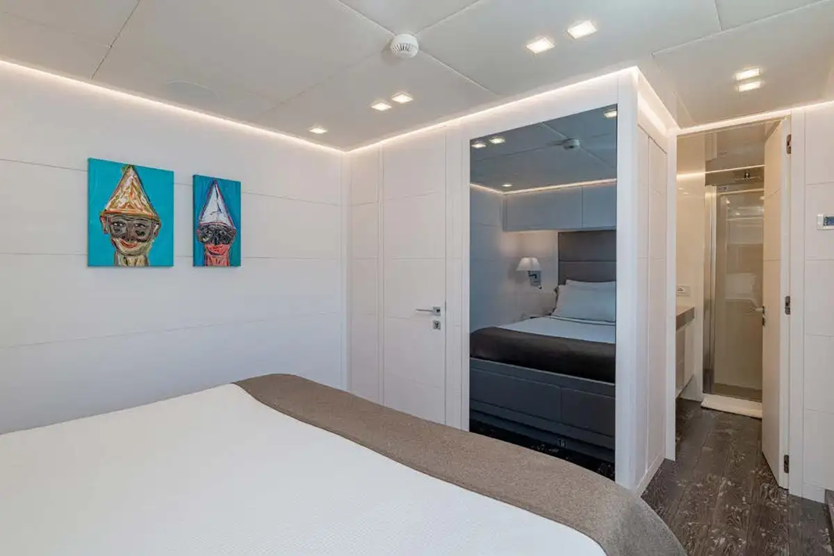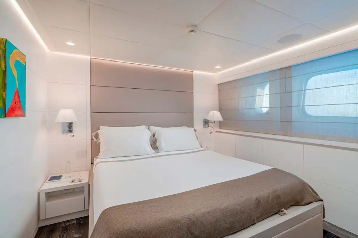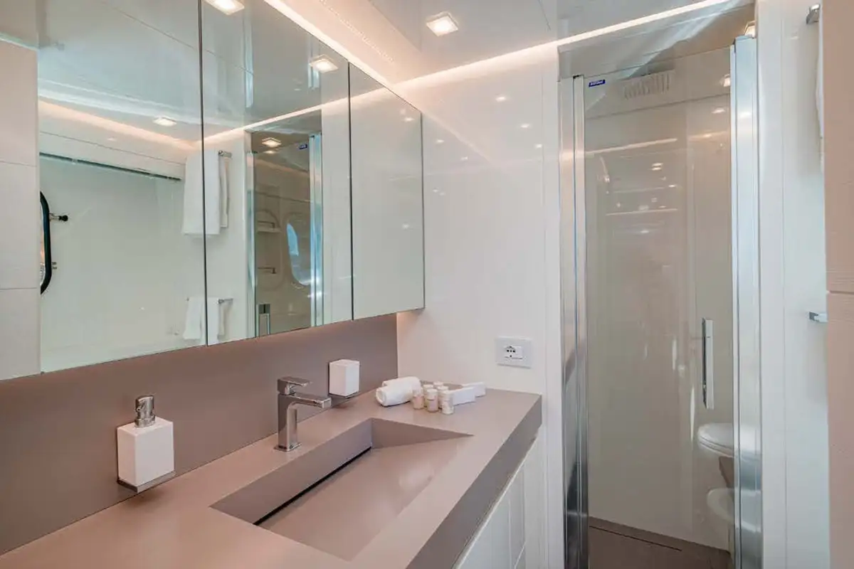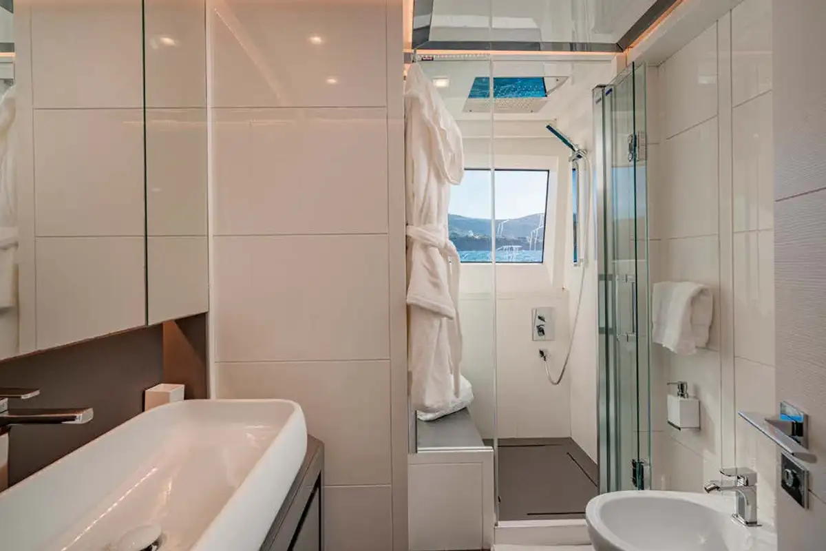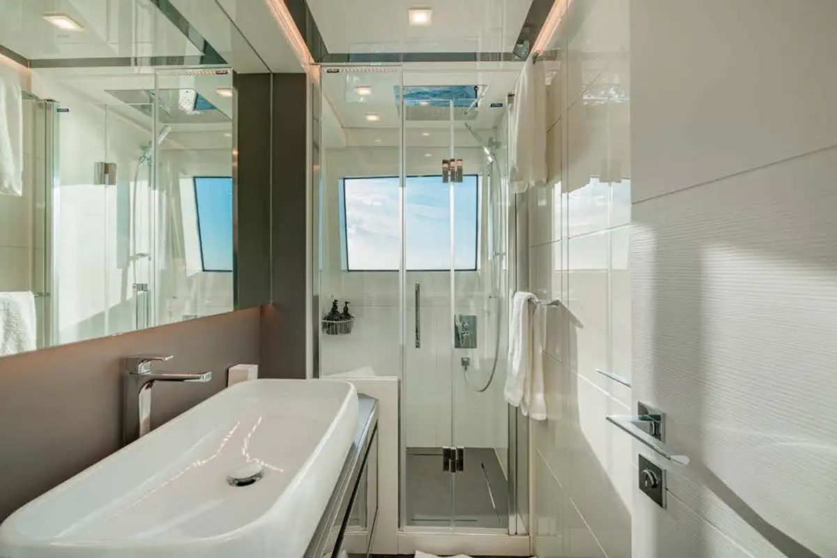 Most yachts have one VIP cabin but SANDS has two identical, luxurious VIP suites, one to port and the other to starboard. This makes her ideal for a charter holiday shared between two families – each couple gets their own master suite and there are four other large, stylish guest cabins on the lower deck, two doubles and two twins, all with private bathrooms and large windows that give good views out, while letting in plenty of natural light.