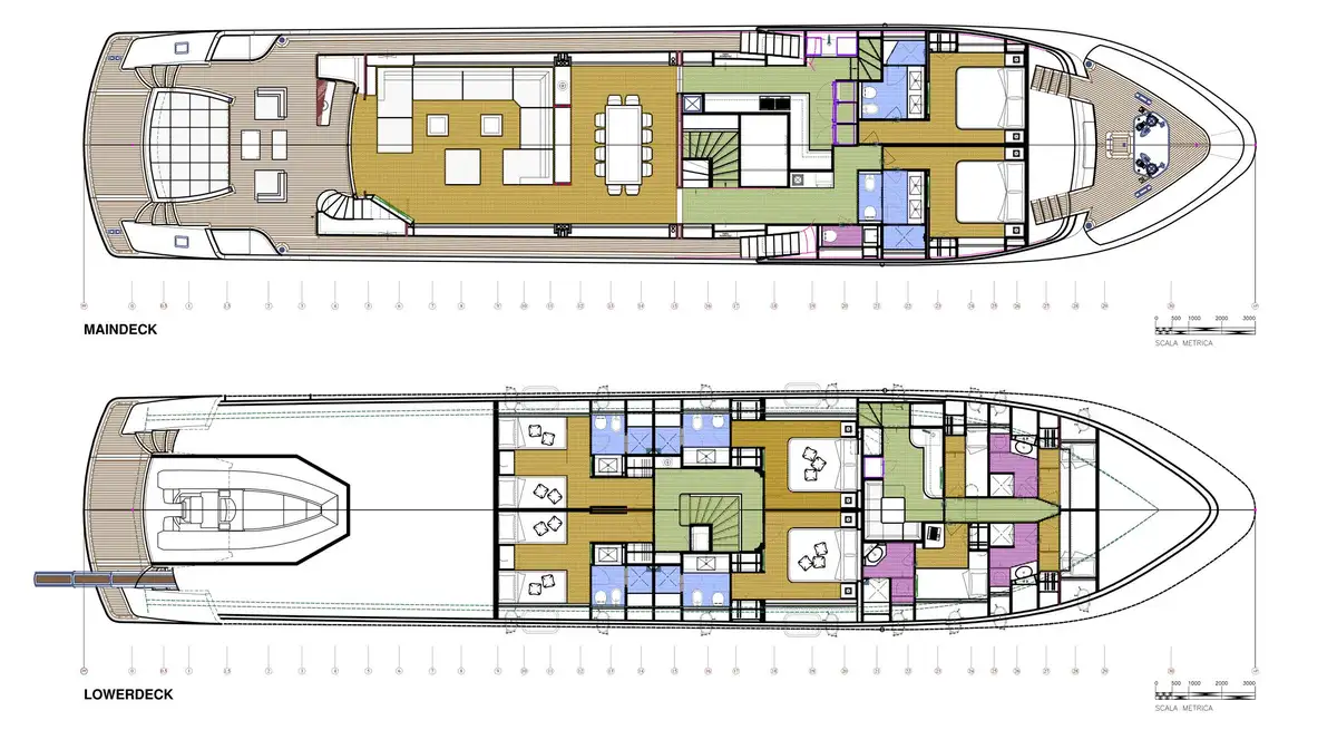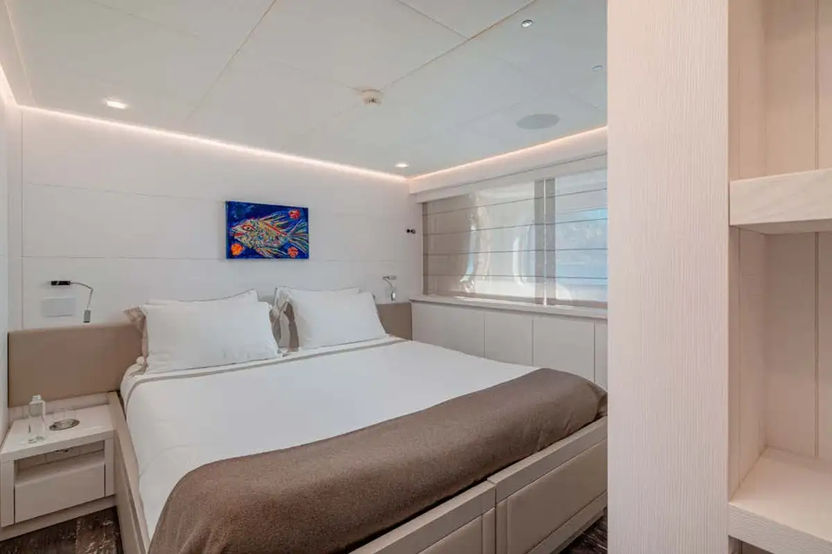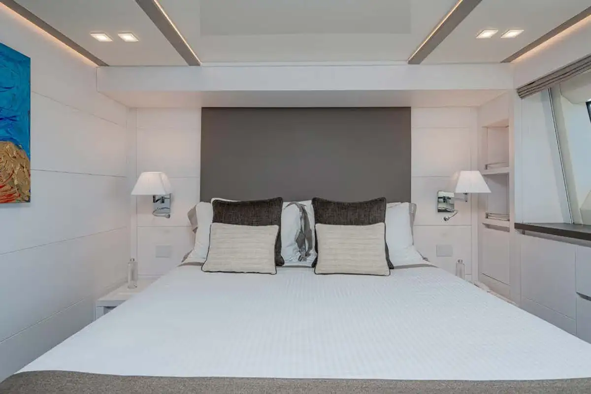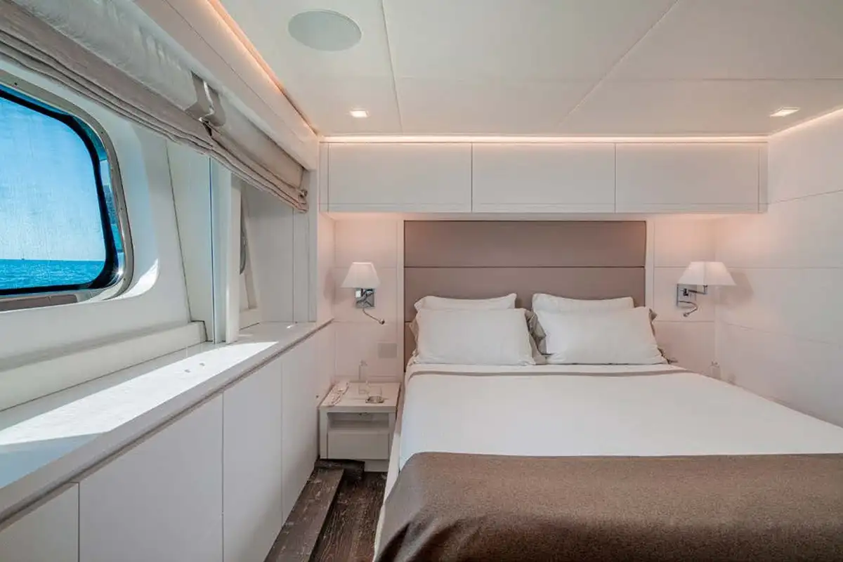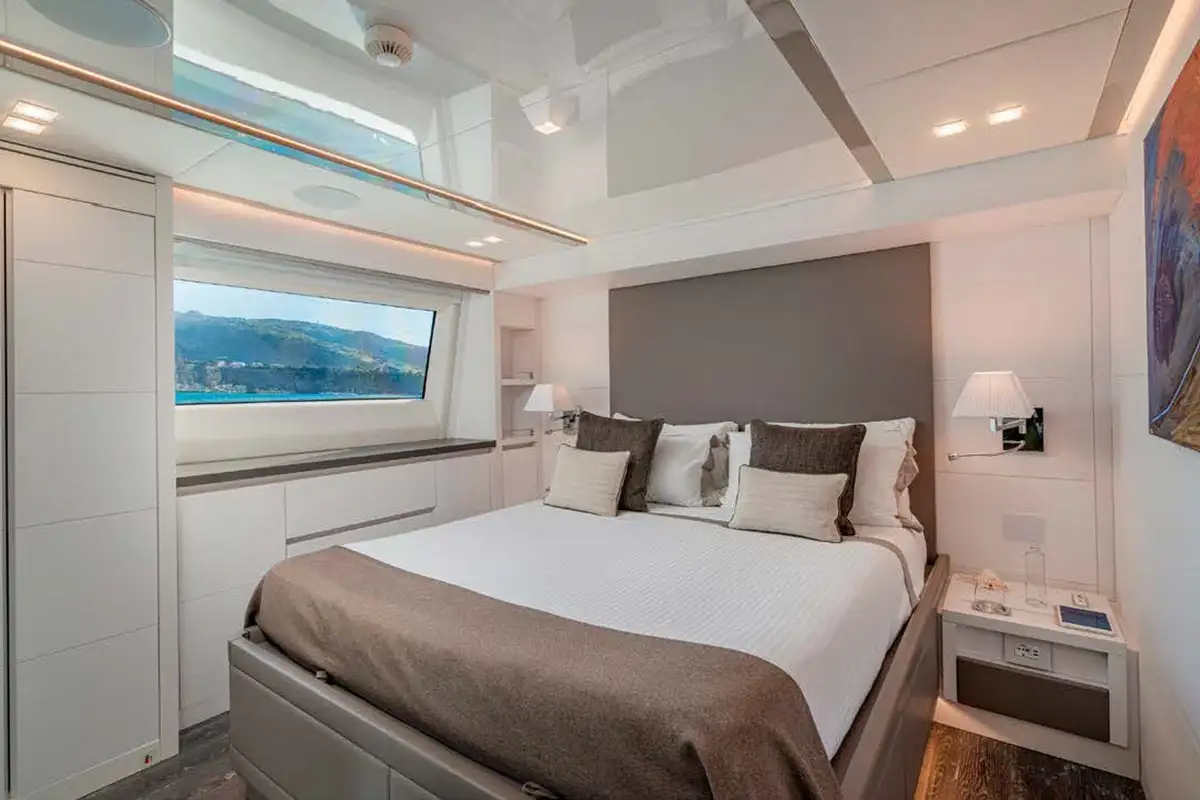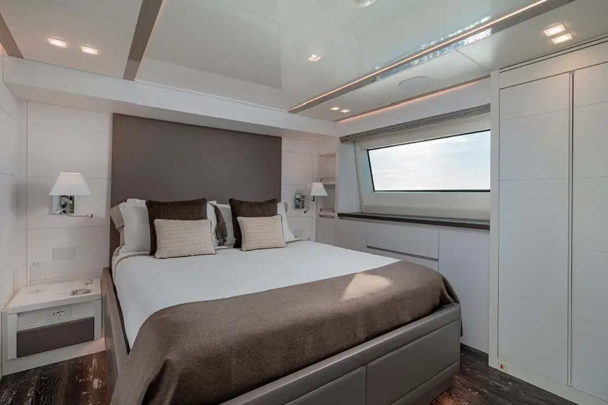 Most yachts have one VIP cabin but SANDS has two identical, luxurious VIP suites, one to port and the other to starboard. This makes her ideal for a charter holiday shared between two families – each couple gets their own master suite and there are four other large, stylish guest cabins on the lower deck, two doubles and two twins, all with private bathrooms and large windows that give good views out, while letting in plenty of natural light.