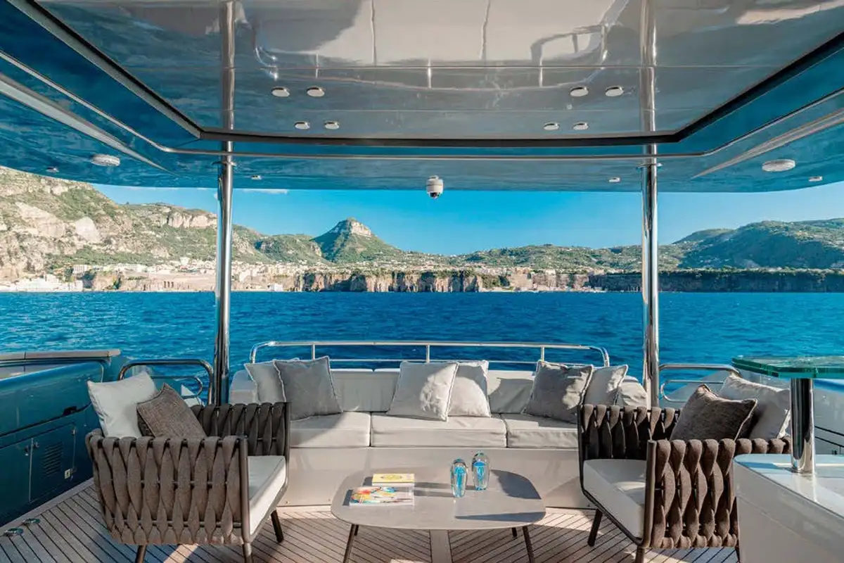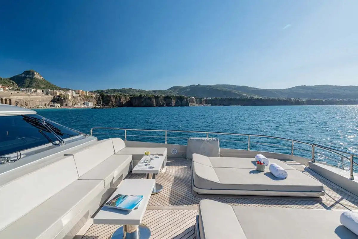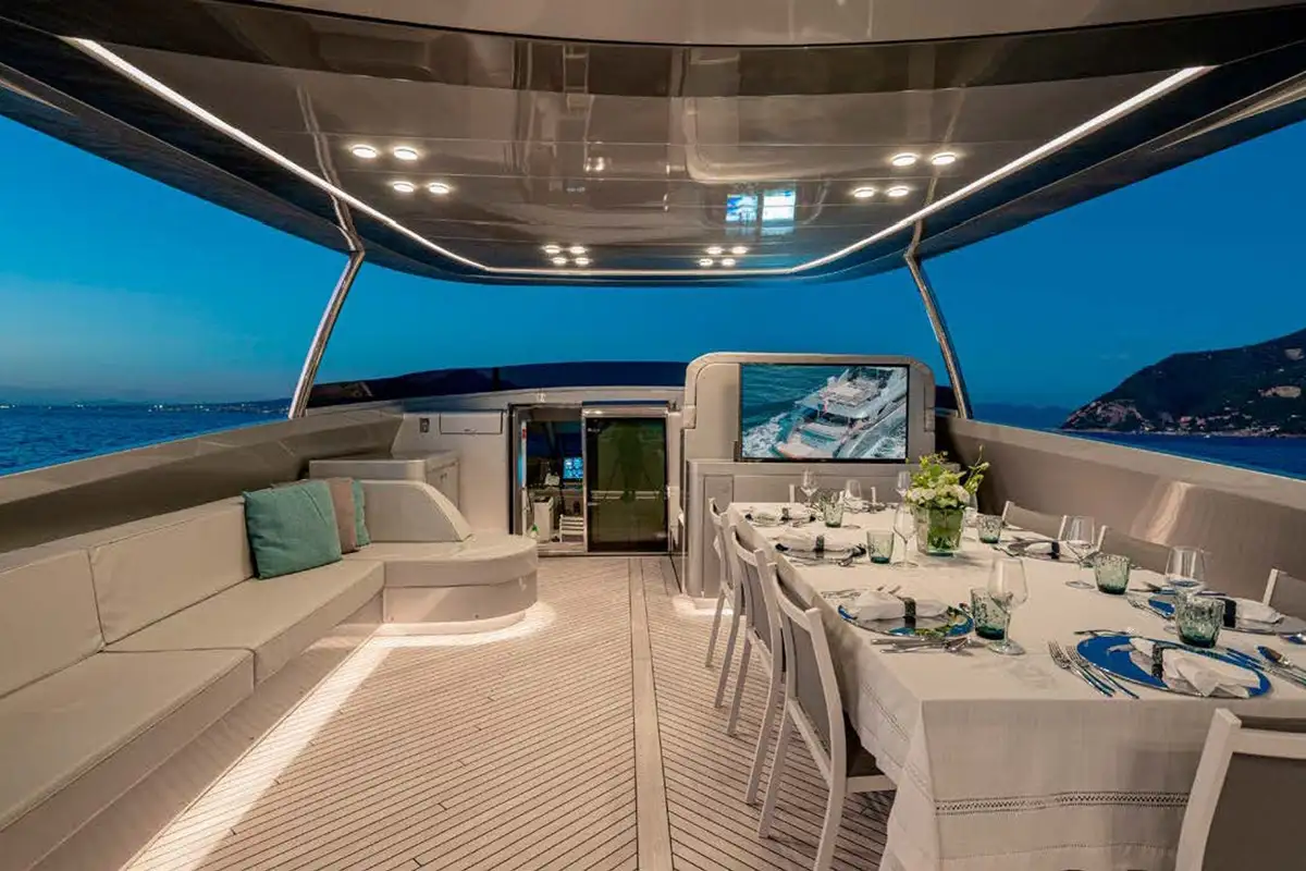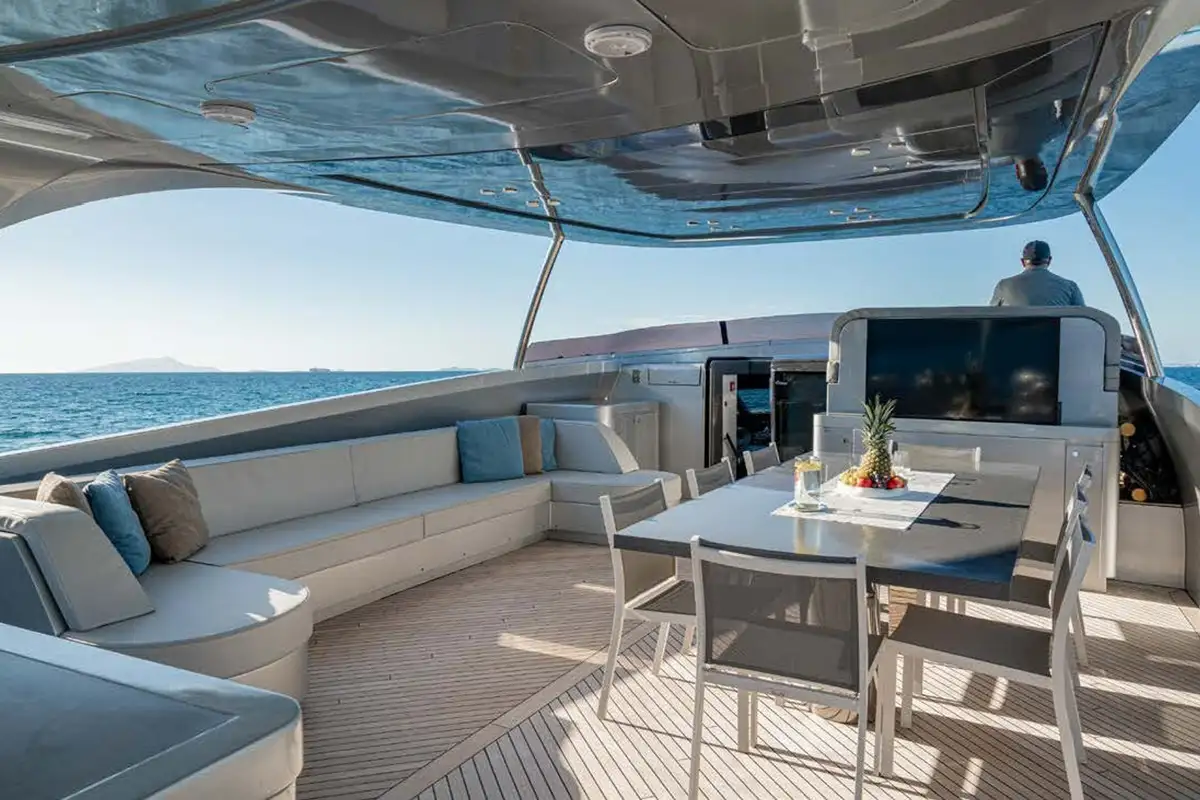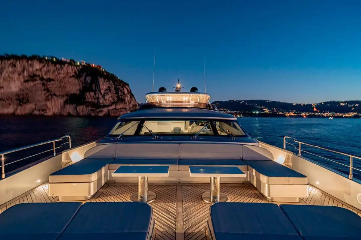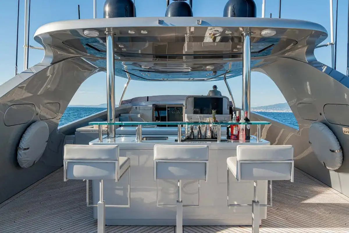 Experience the immense power of this super-sized sports yacht as you take the wheel at the flybridge helm – with the captain’s expert guidance – and carve a curved wake through the deep blue sea while the breeze races through your hair. Or, leave that to the professionals, as you relax on the spacious open-air foredeck en route to the anchorage you selected in the morning. You could even sip a cool cocktail at the sundeck bar, while the seascape flashes past.