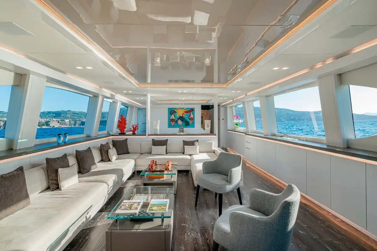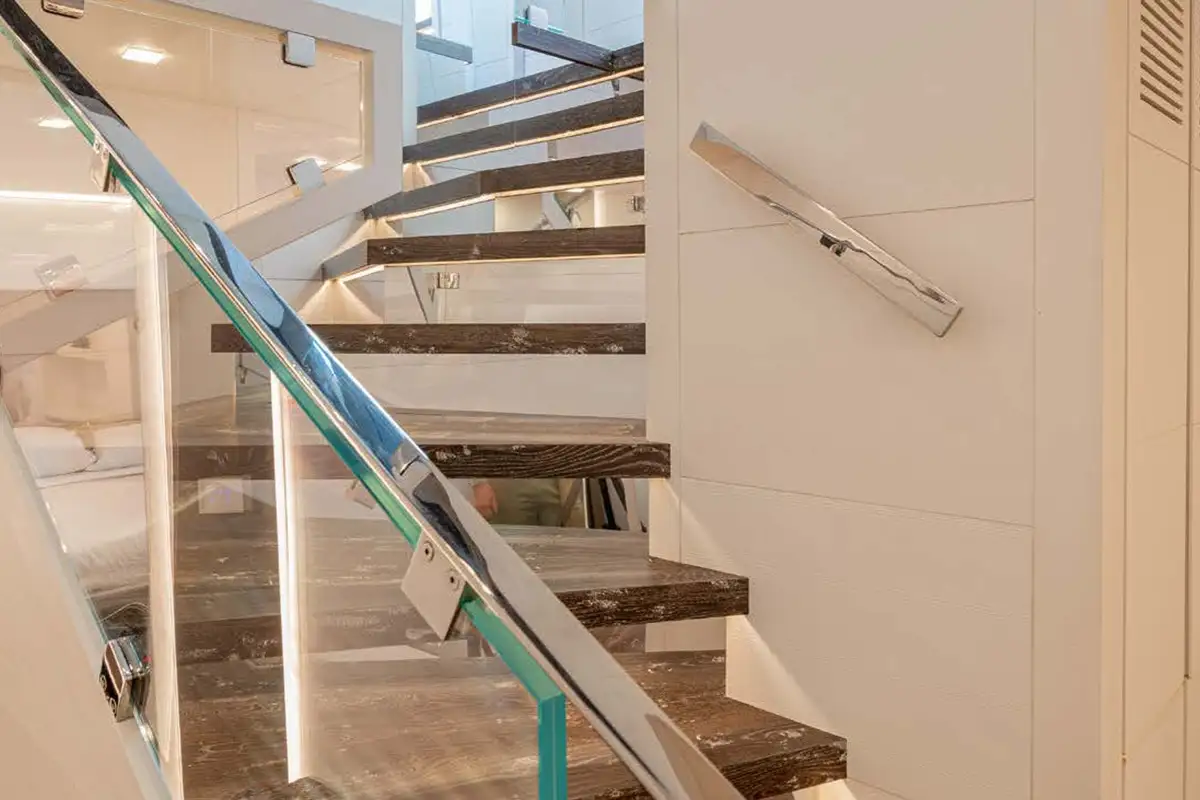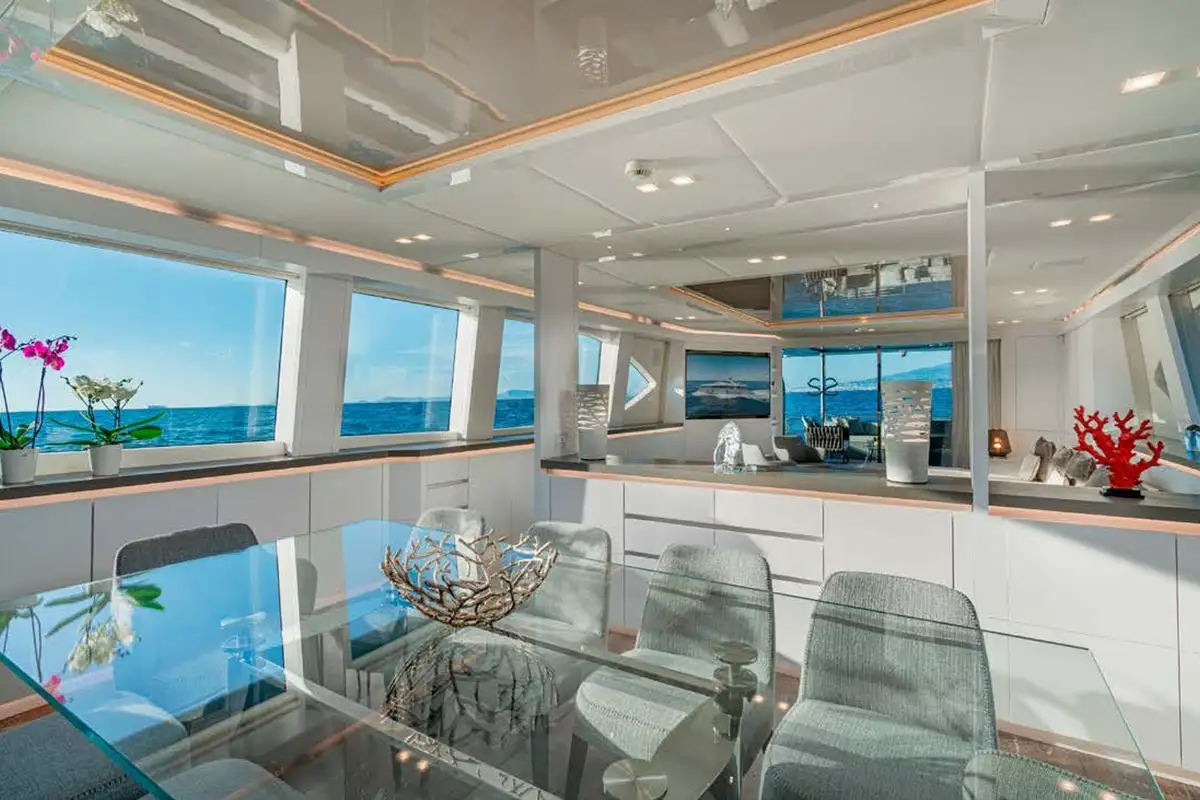 Step inside the main deck saloon and you enter a large, comfortable lounge with a clean, contemporary look. Sink into the luxurious sofas and gaze out through the big picture windows on both sides and soak up the magnificent view. Watch a movie on the huge TV or enjoy an elegant meal around the formal dining table at the forward end of the saloon.