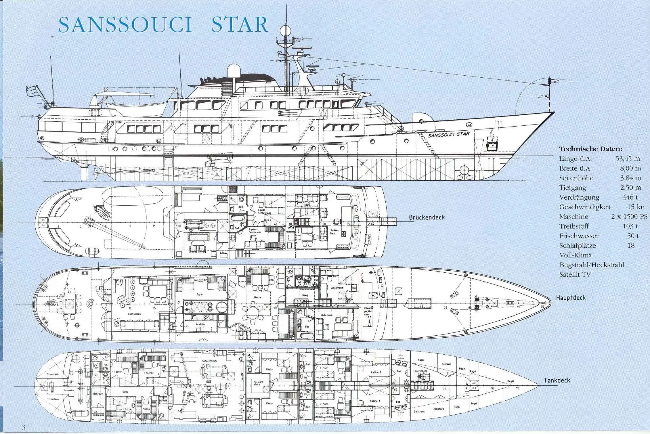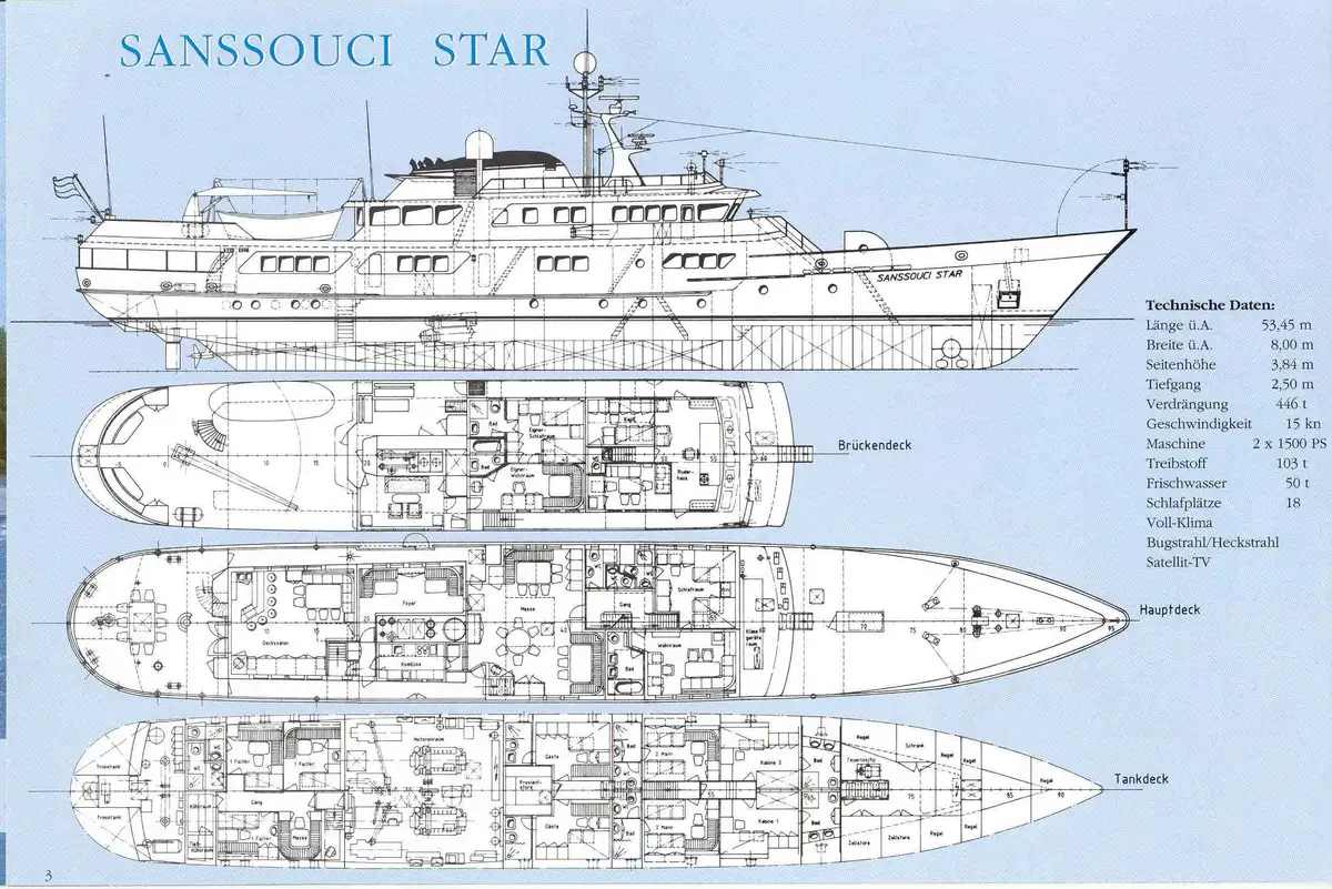 If you’re looking for a proper traditional superyacht, SANSSOUCI STAR is the real McCoy with sweet hull lines and vast amounts of interior living space on three main levels. She’s a 54-metre (176ft) vessel designed to host up to 12 guests in seven cabins, including a big master suite with a separate office on the upper deck. With two main deck VIP suites and four cabins that convert from doubles to twins, her versatile accommodation can be configured to suit your guests.