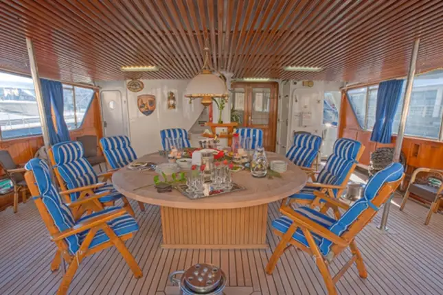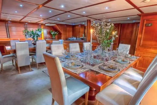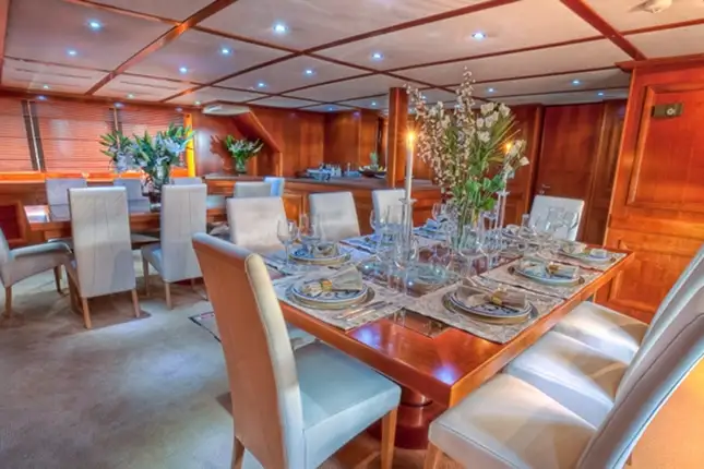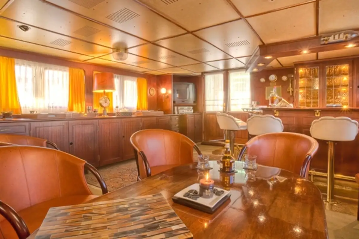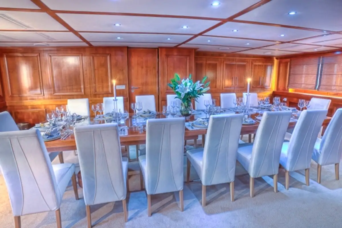 Interior highlights include a splendid formal dining room with classic nautical wood panelling, a gym with big windows and exercise machines, a sit-up bar with a clubby atmosphere, several areas for games and activities, a snug sitting room next to the master cabin and a comfortable, sociable main deck lounge.