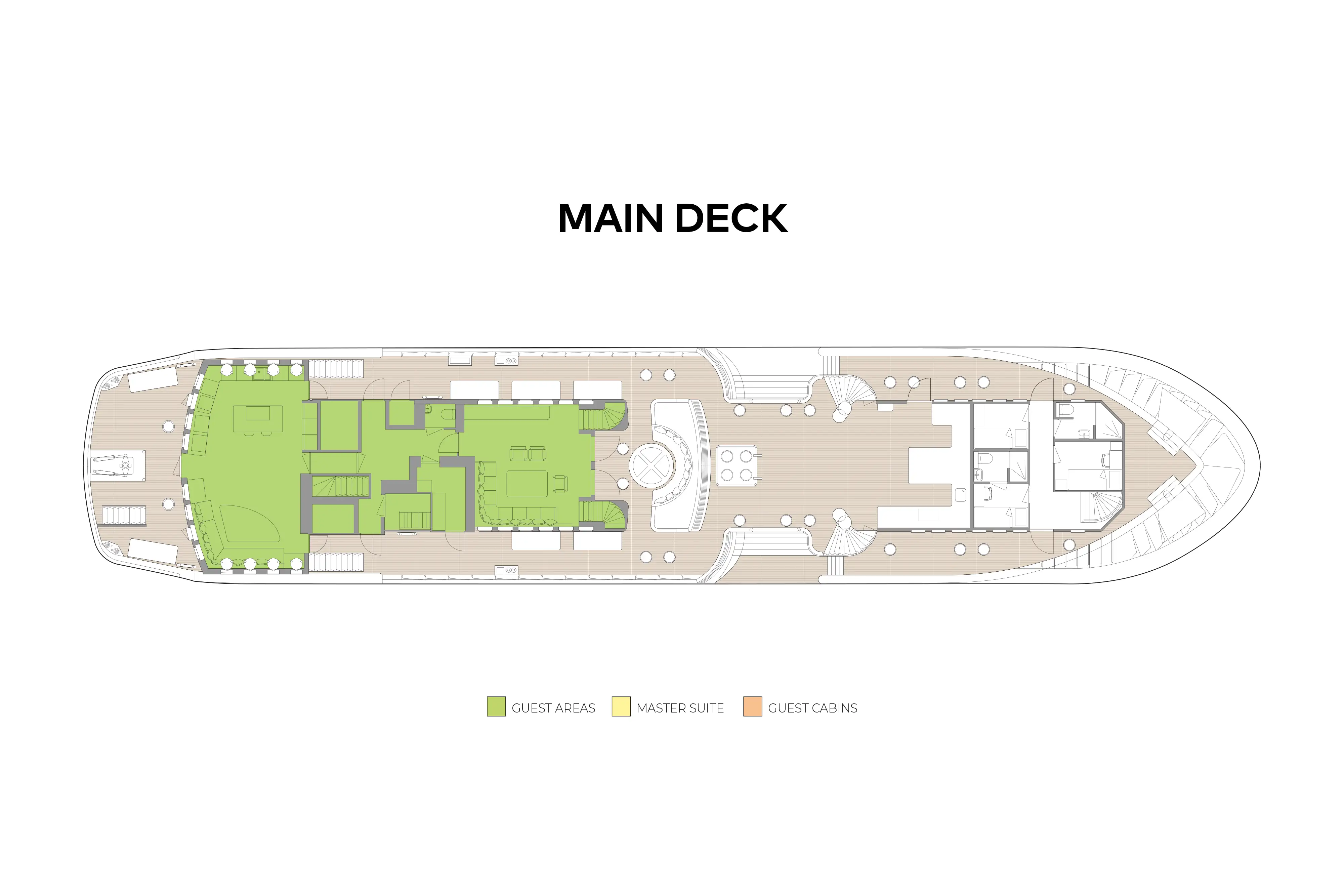 Also available for saleSCINTILLA MARIS boasts an open, bright, contemporary and comfortable interior, designed to accentuate daylight and connect guests with the yacht’s environment, including below deck. Her large master suite is located mid-ship on the lower deck and boasts a 1.5m diameter skylight and a 2.4m ceiling height. The configuration of the five guest staterooms – all with daylight - offers flexibility in adapting the guest / support staff ratio to the client’s wishes.