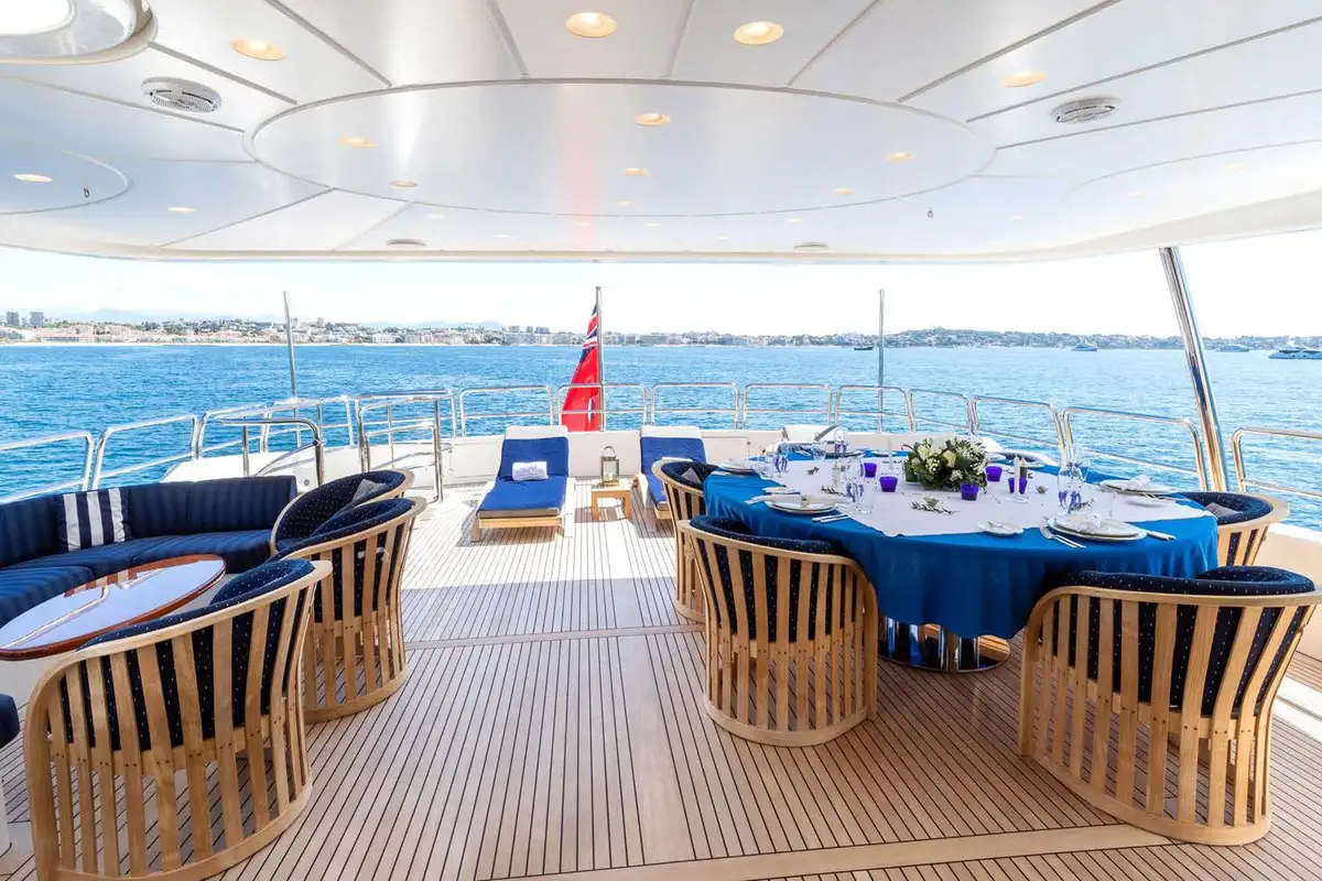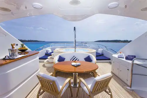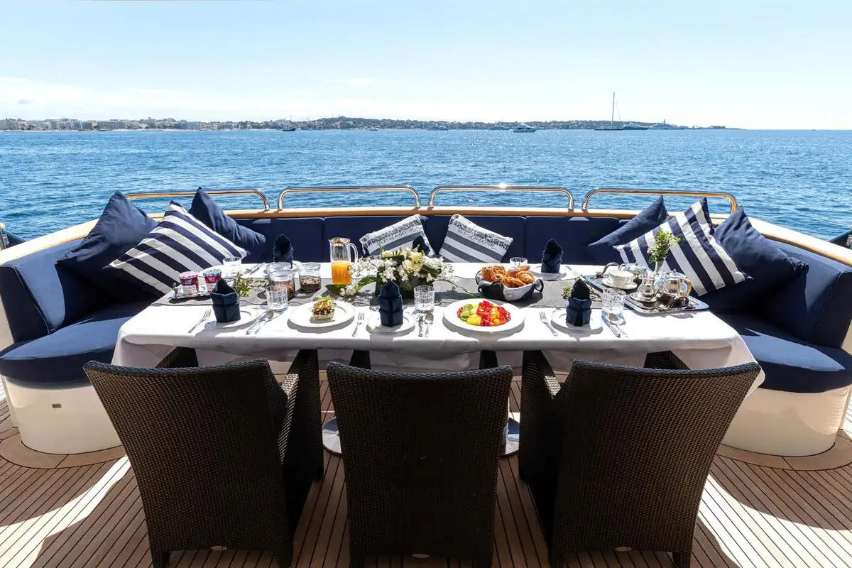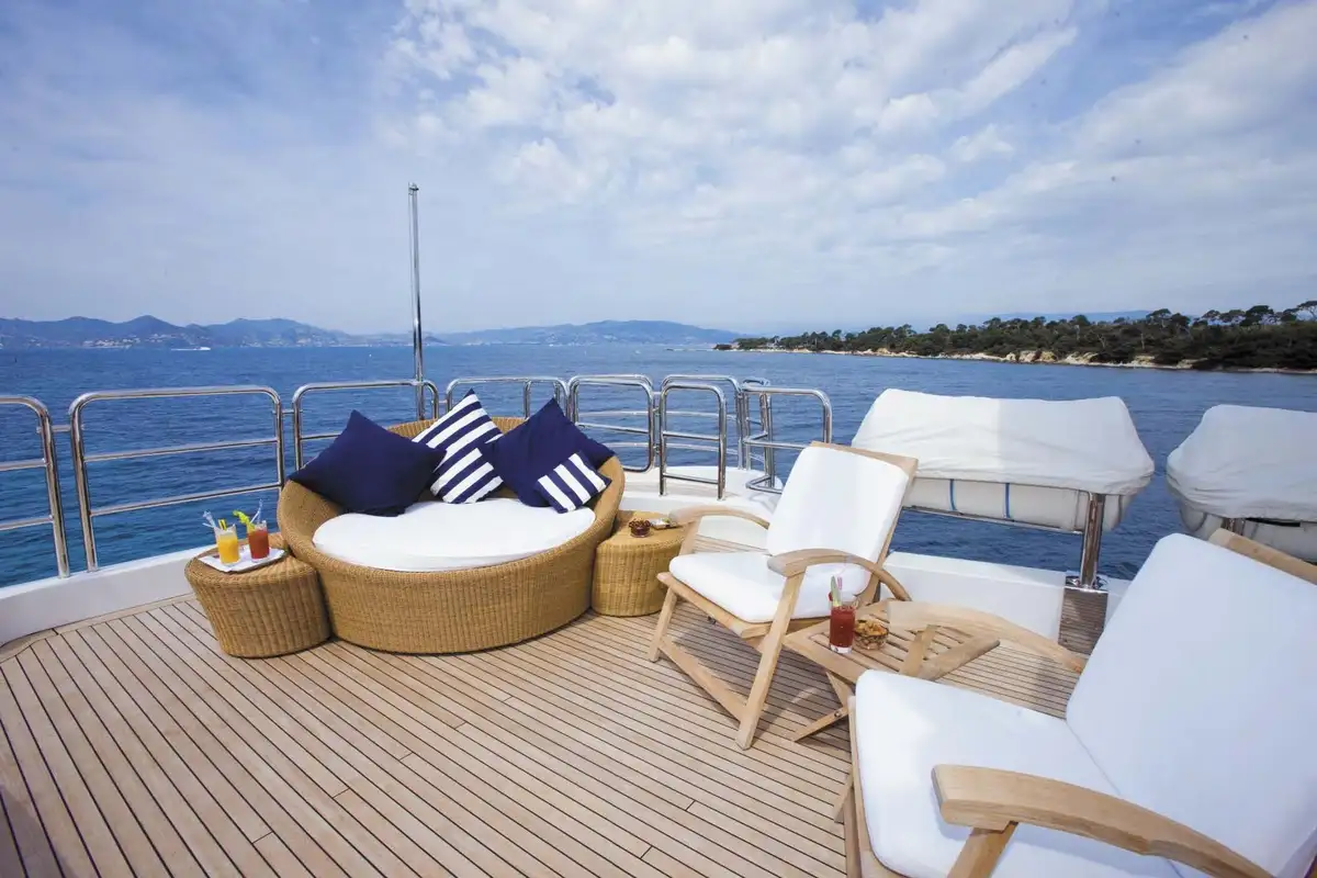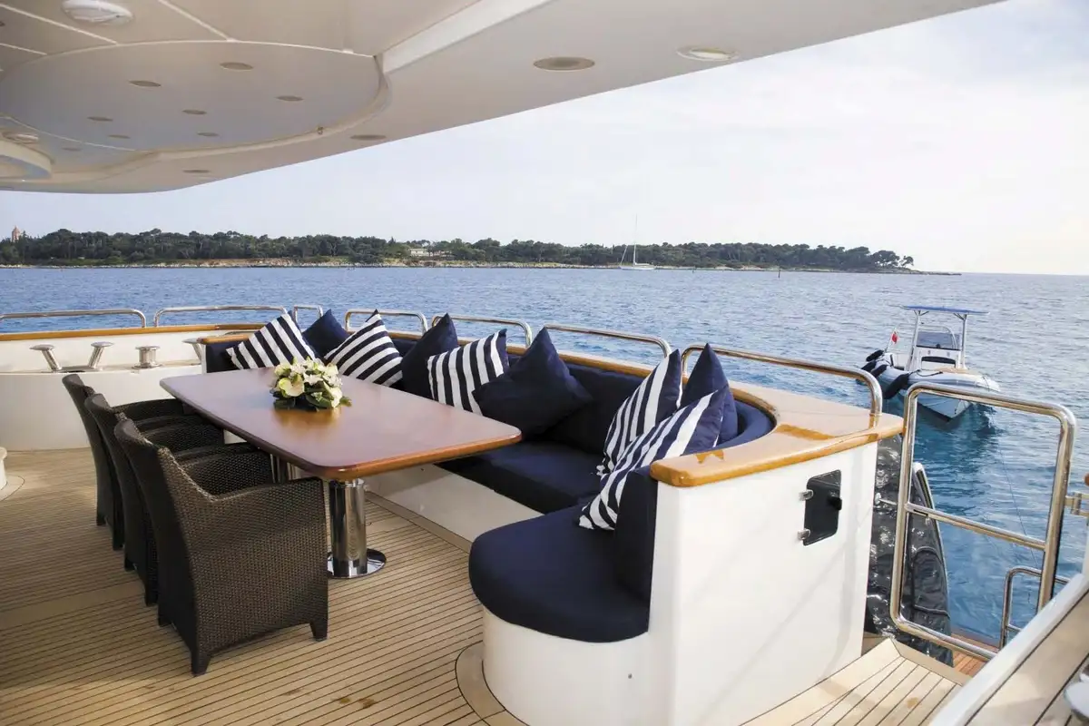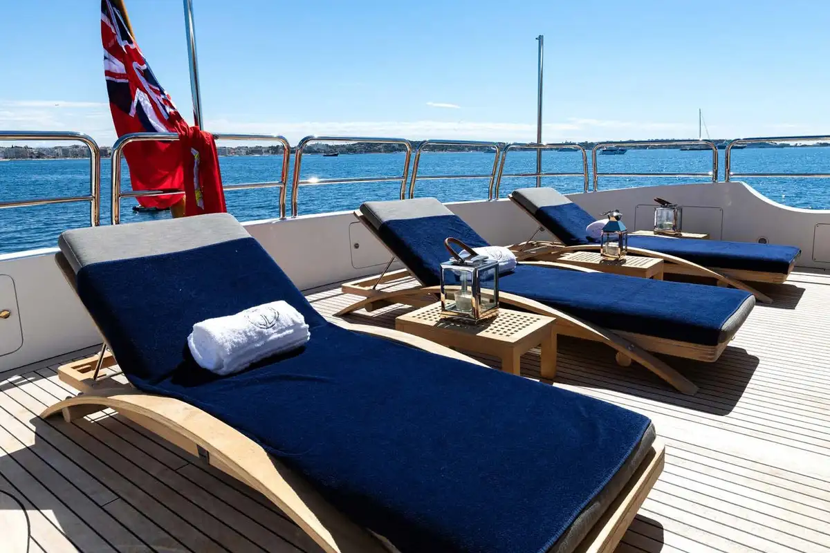 Her exterior spaces are thoughtfully designed for every mood and moment. The expansive sundeck features loungers, a jacuzzi, and shaded dining, while the main aft deck provides a welcoming spot for al fresco breakfasts or evening cocktails. With ample space across three decks, there’s always a perfect place to soak up the sun or enjoy the breeze in the shade.