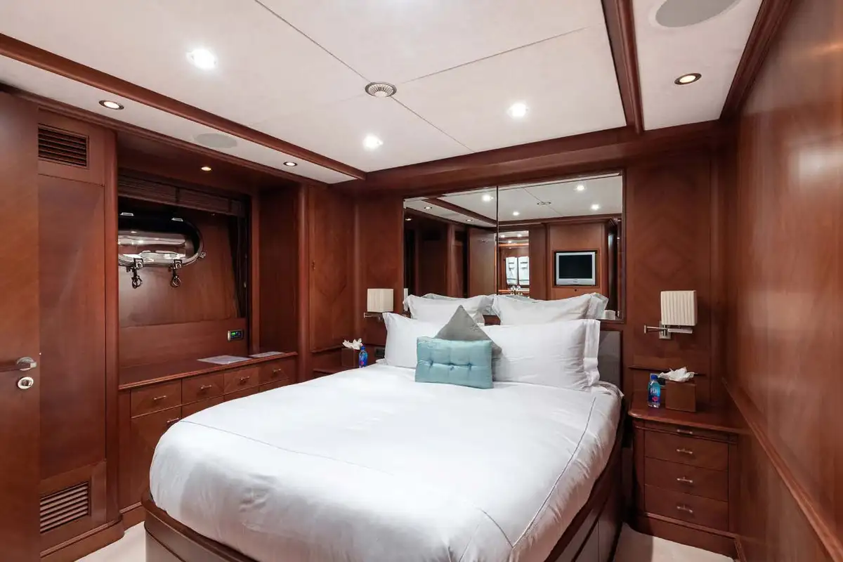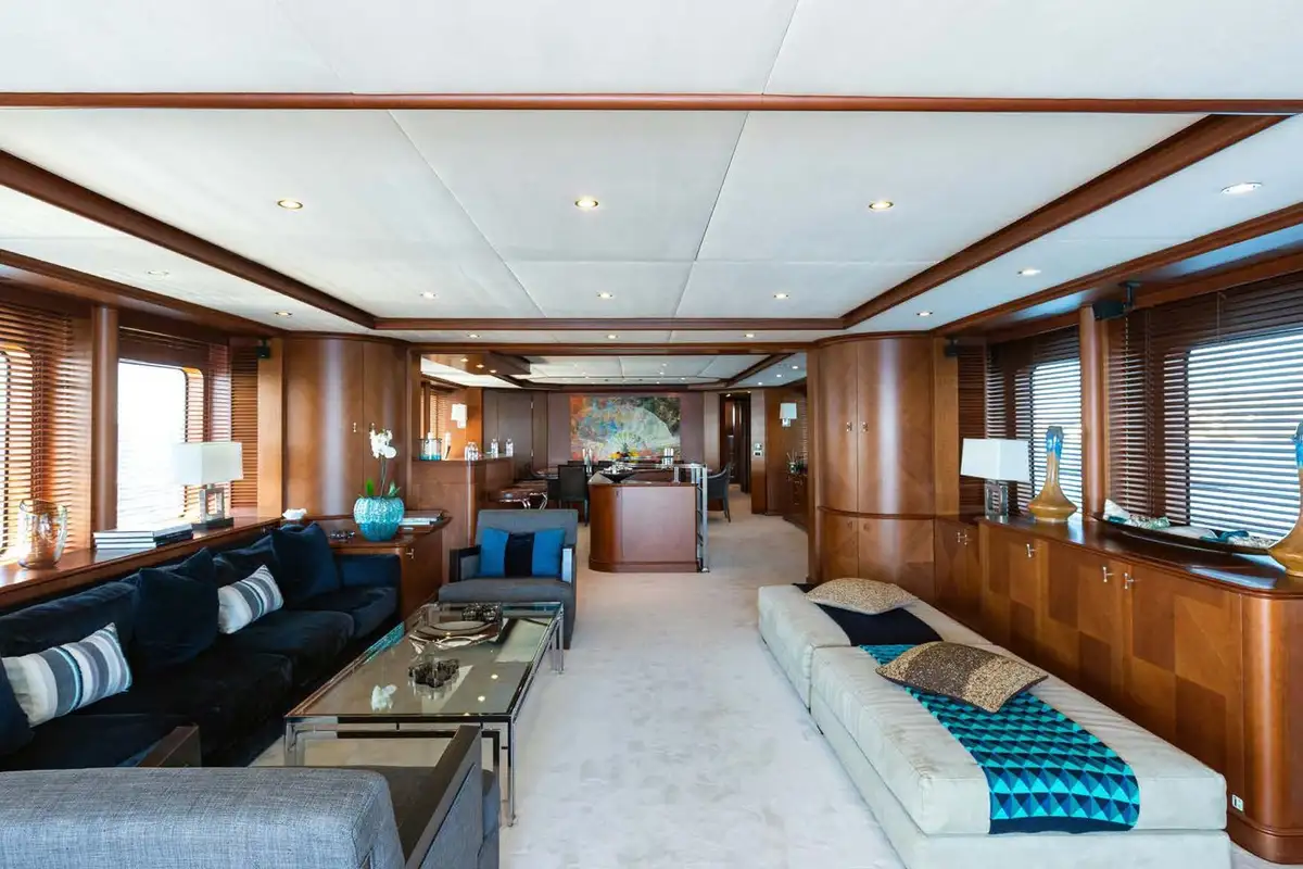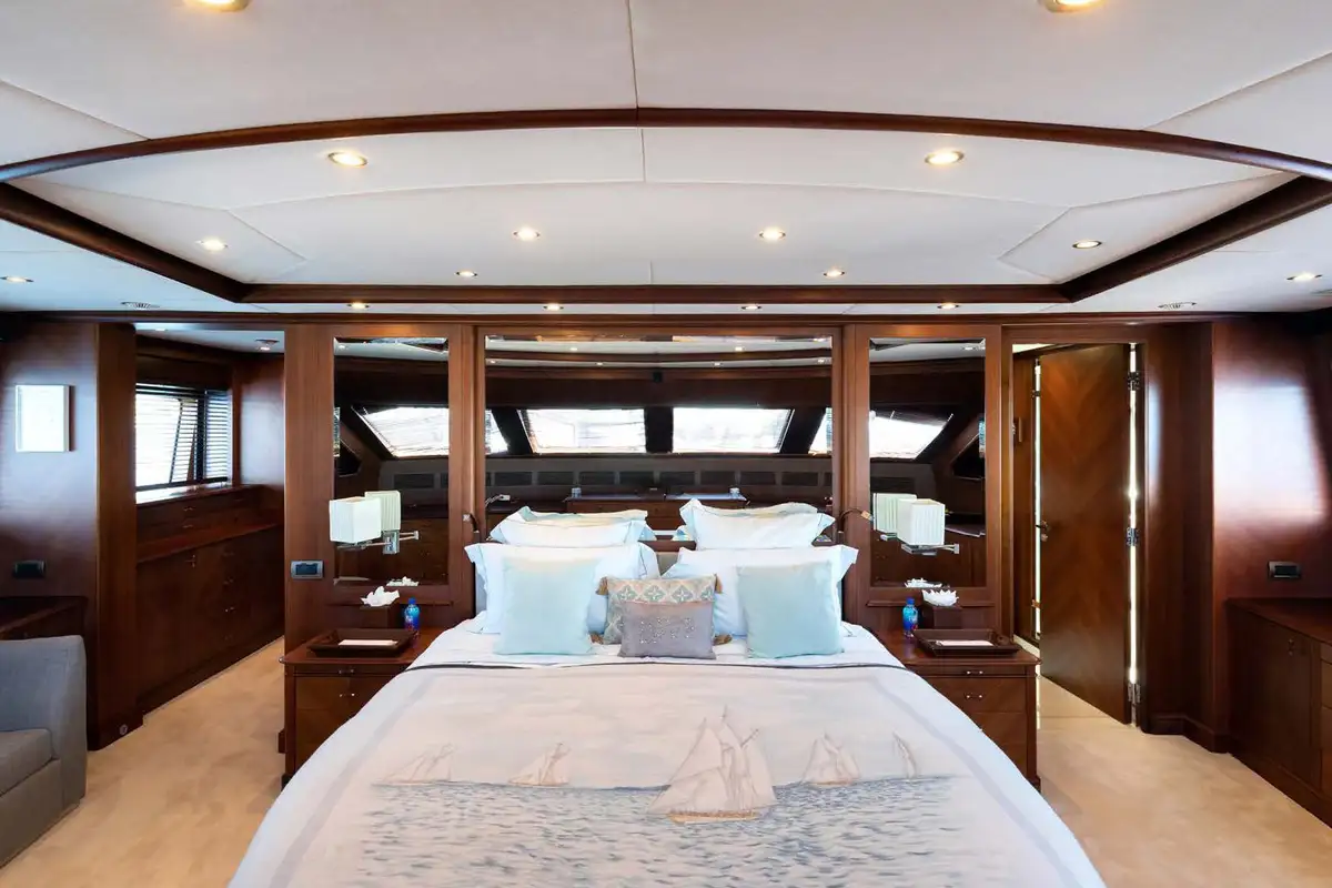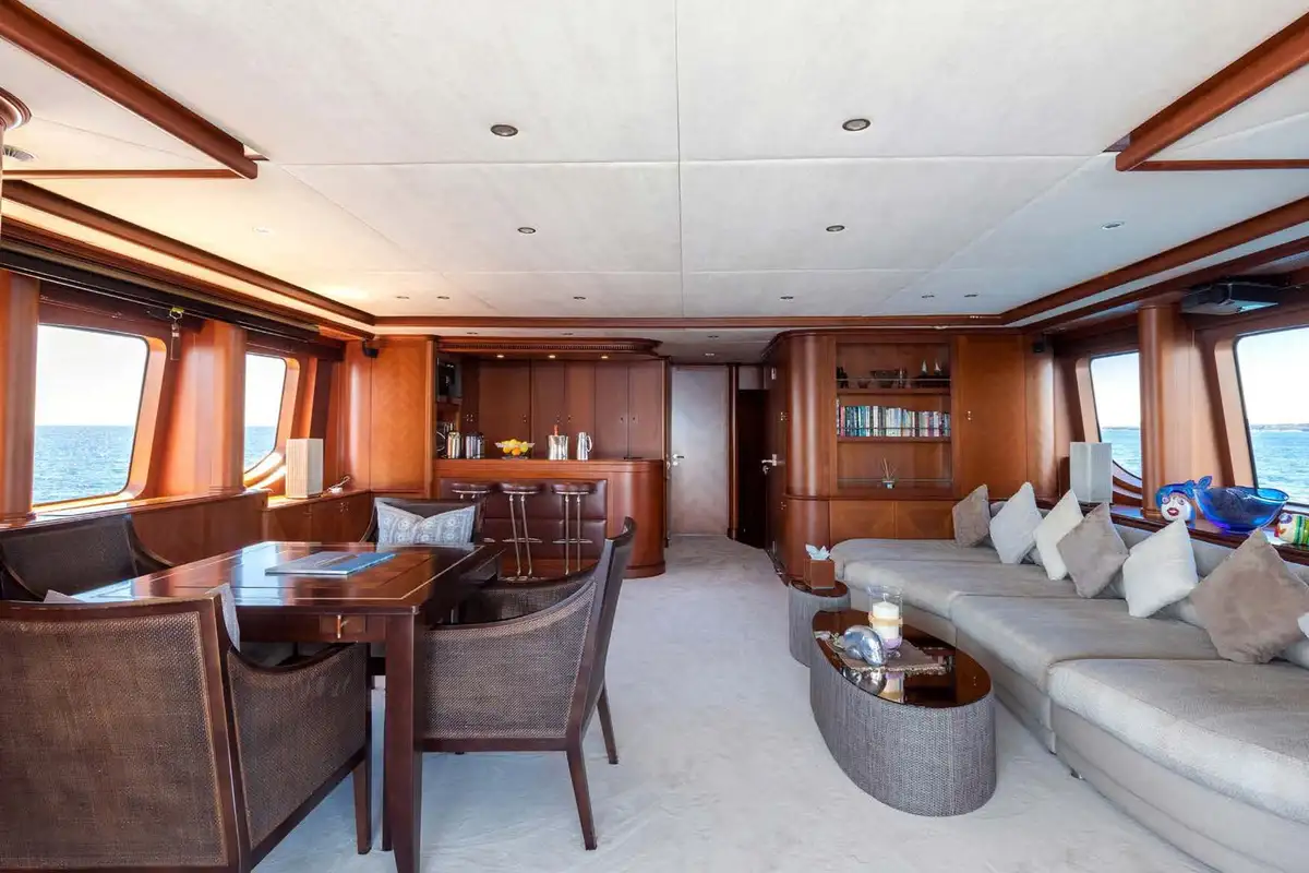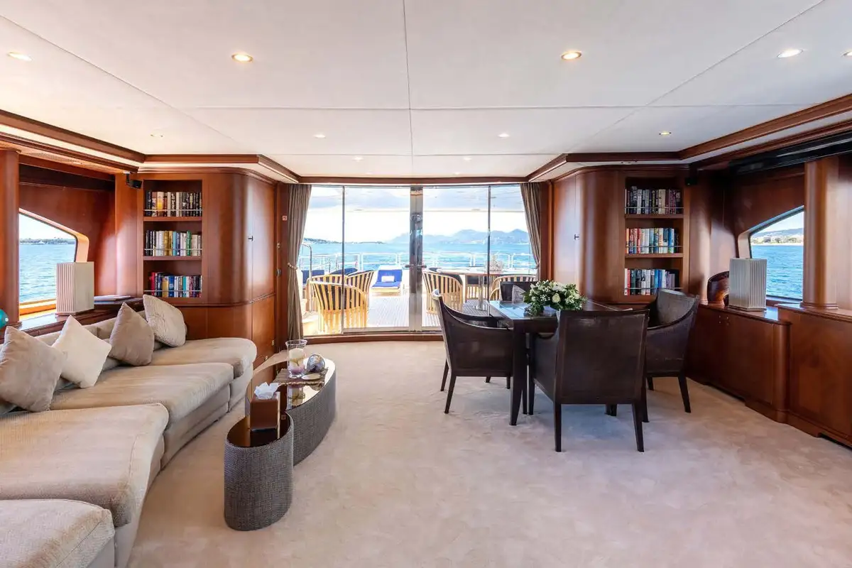 Her exterior spaces are thoughtfully designed for every mood and moment. The expansive sundeck features loungers, a jacuzzi, and shaded dining, while the main aft deck provides a welcoming spot for al fresco breakfasts or evening cocktails. With ample space across three decks, there’s always a perfect place to soak up the sun or enjoy the breeze in the shade.