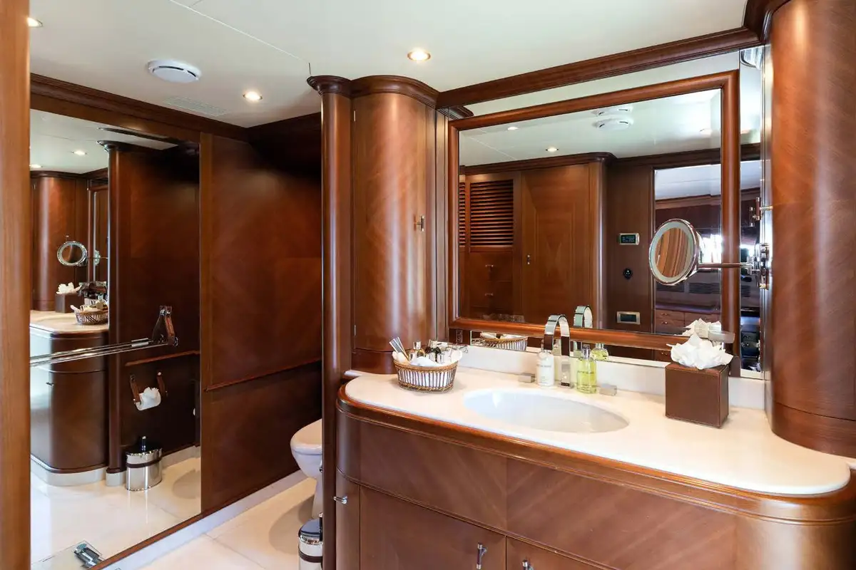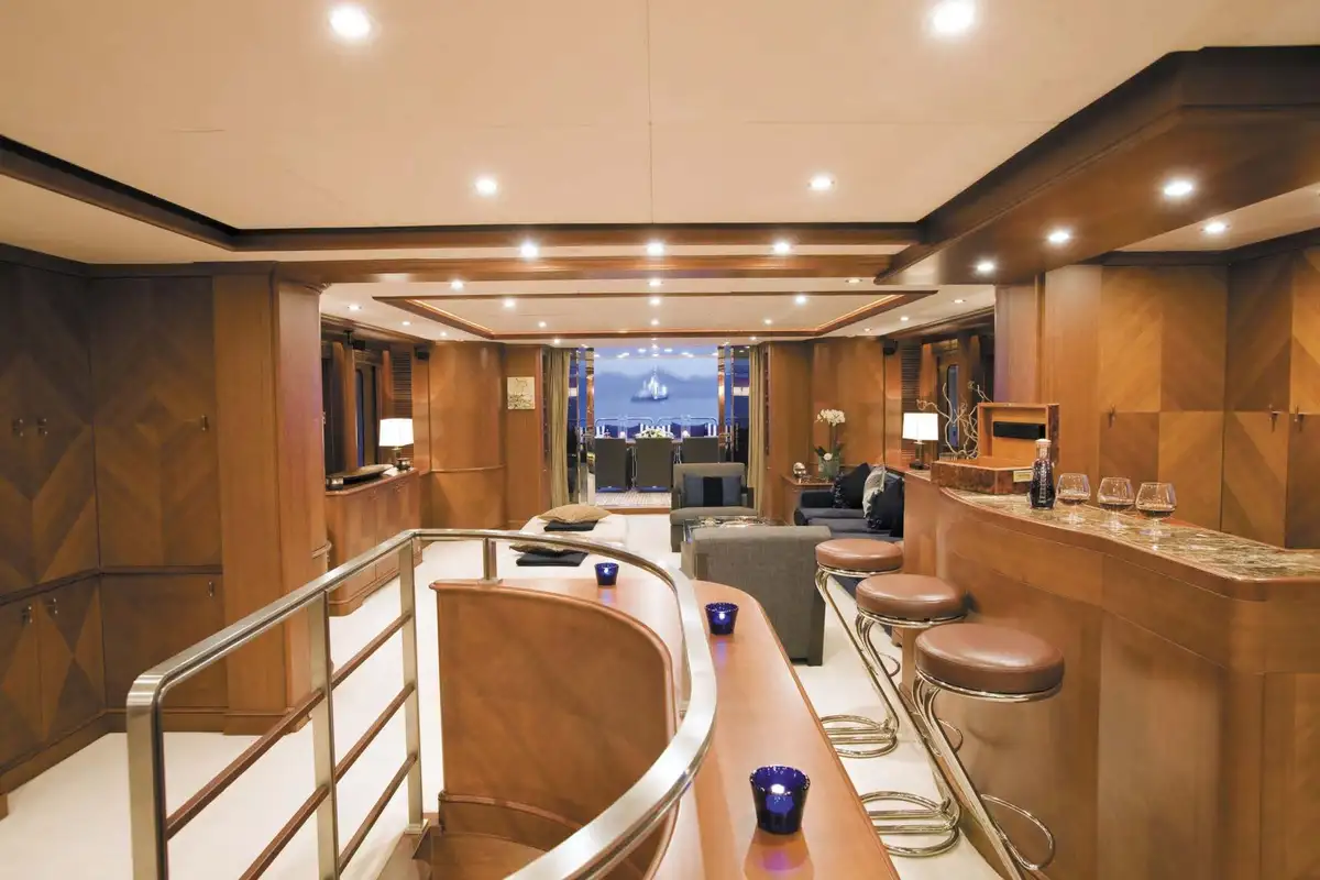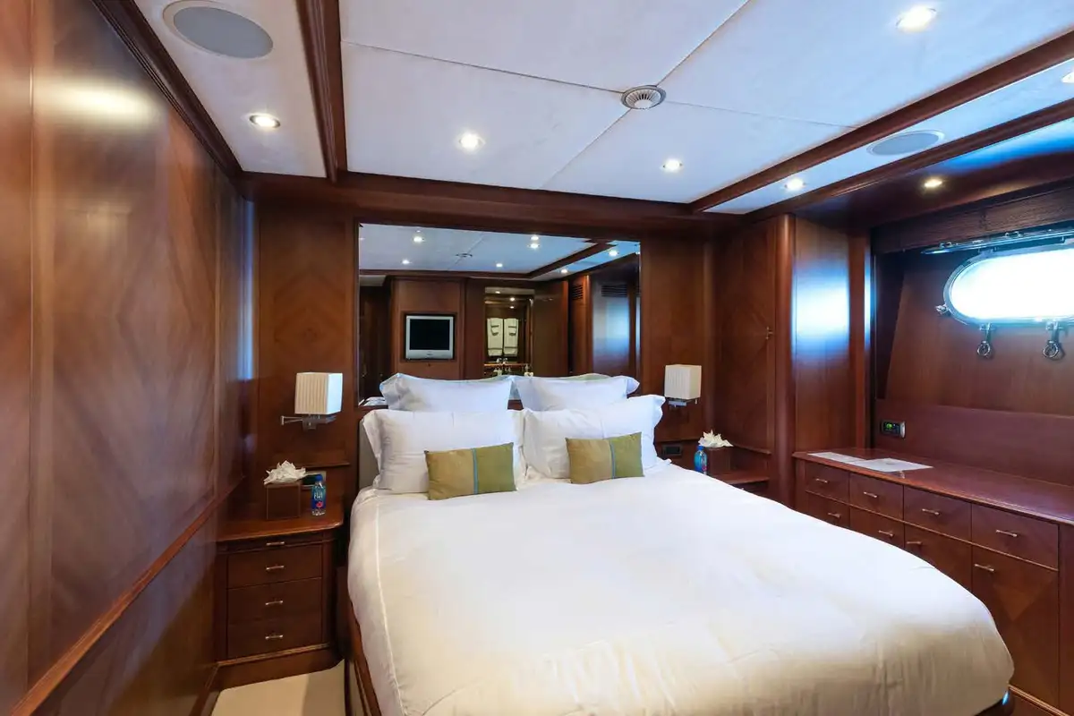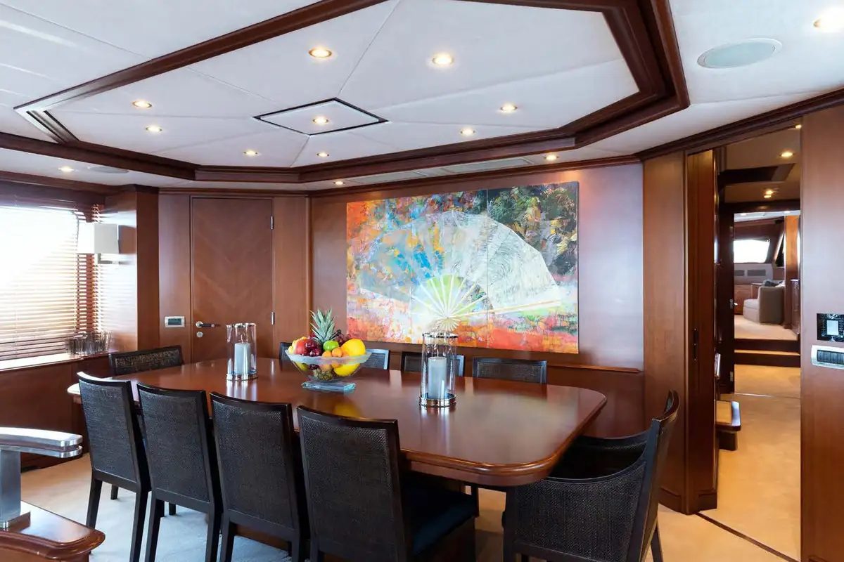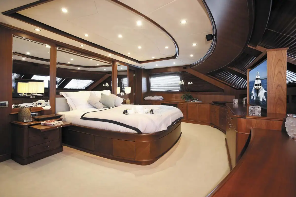 Her exterior spaces are thoughtfully designed for every mood and moment. The expansive sundeck features loungers, a jacuzzi, and shaded dining, while the main aft deck provides a welcoming spot for al fresco breakfasts or evening cocktails. With ample space across three decks, there’s always a perfect place to soak up the sun or enjoy the breeze in the shade.