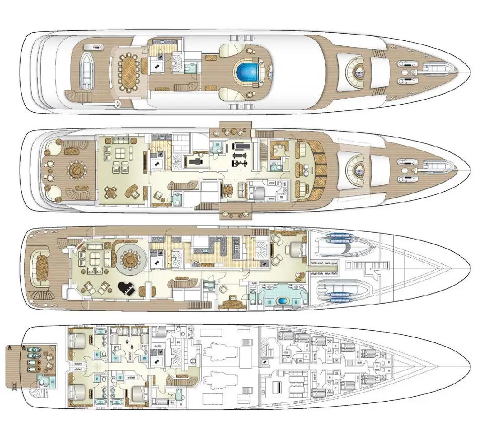 SEA OWL has seven themed cabins for up to 12 guests, including a full-beam master cabin with private study, three distinct VIP cabins, and additional cabins for children, nannies, or staff.