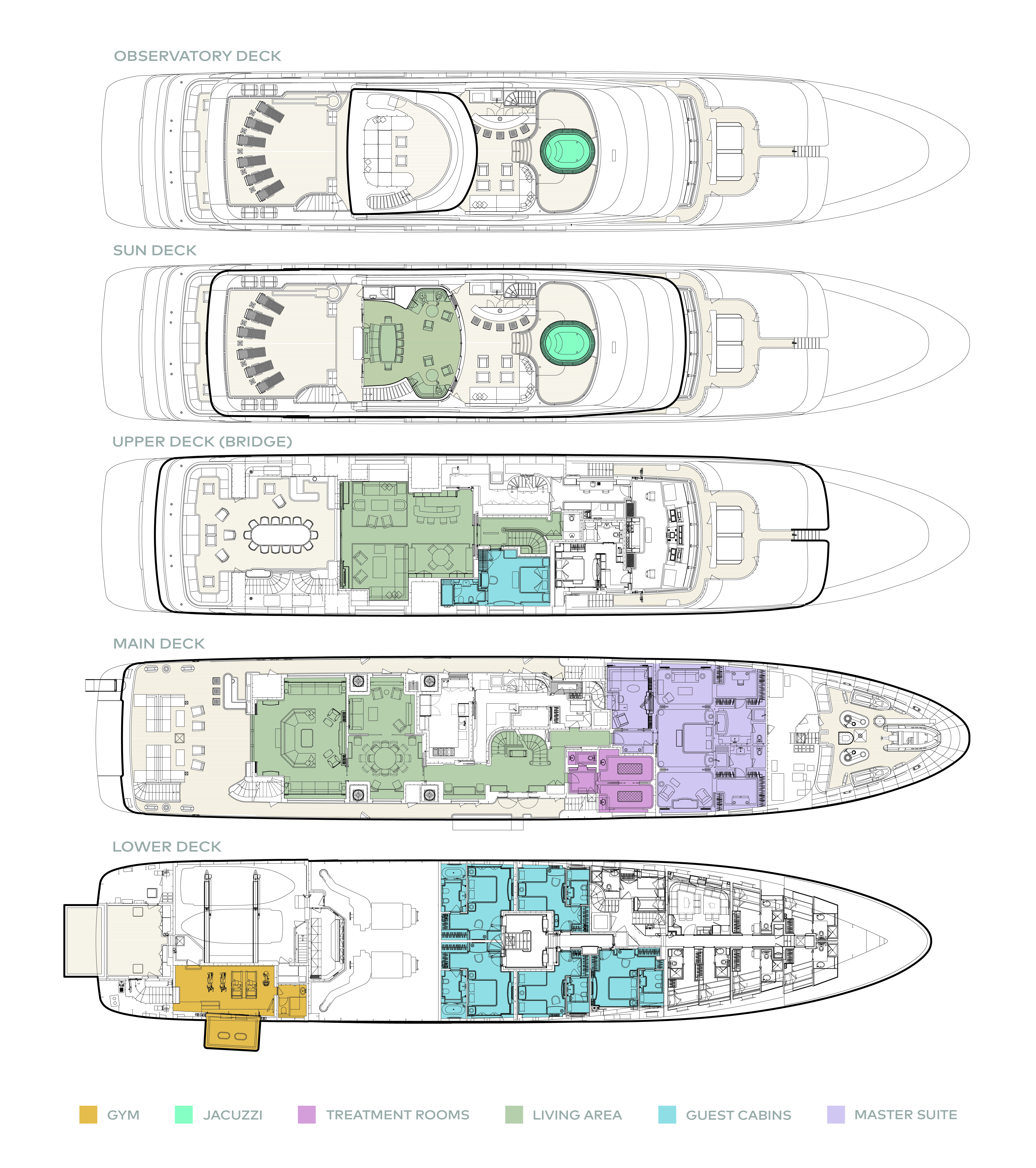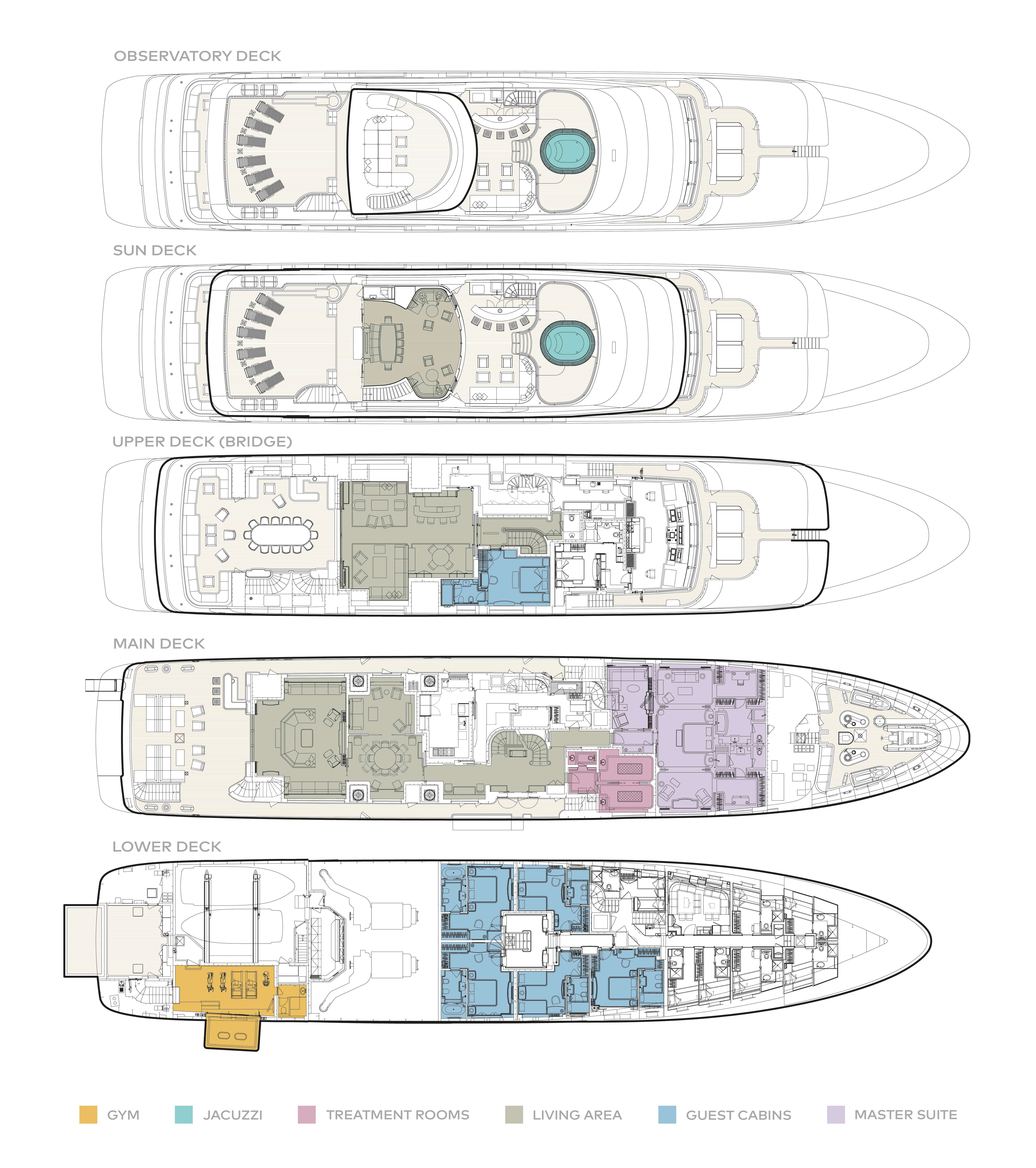 If you or your guests prefer action, motor yacht SEANNA delivers. Exercise in the indoor/outdoor gym with fresh sea air, dive from the swim platform, or speed across the water by jetski. Ready to unwind? Head to the sun deck for prime sunbathing opportunities. Stretch out on the vast aft deck, soak in the forward jacuzzi surrounded by sun pads, or climb to the observatory deck for 360-degree views.