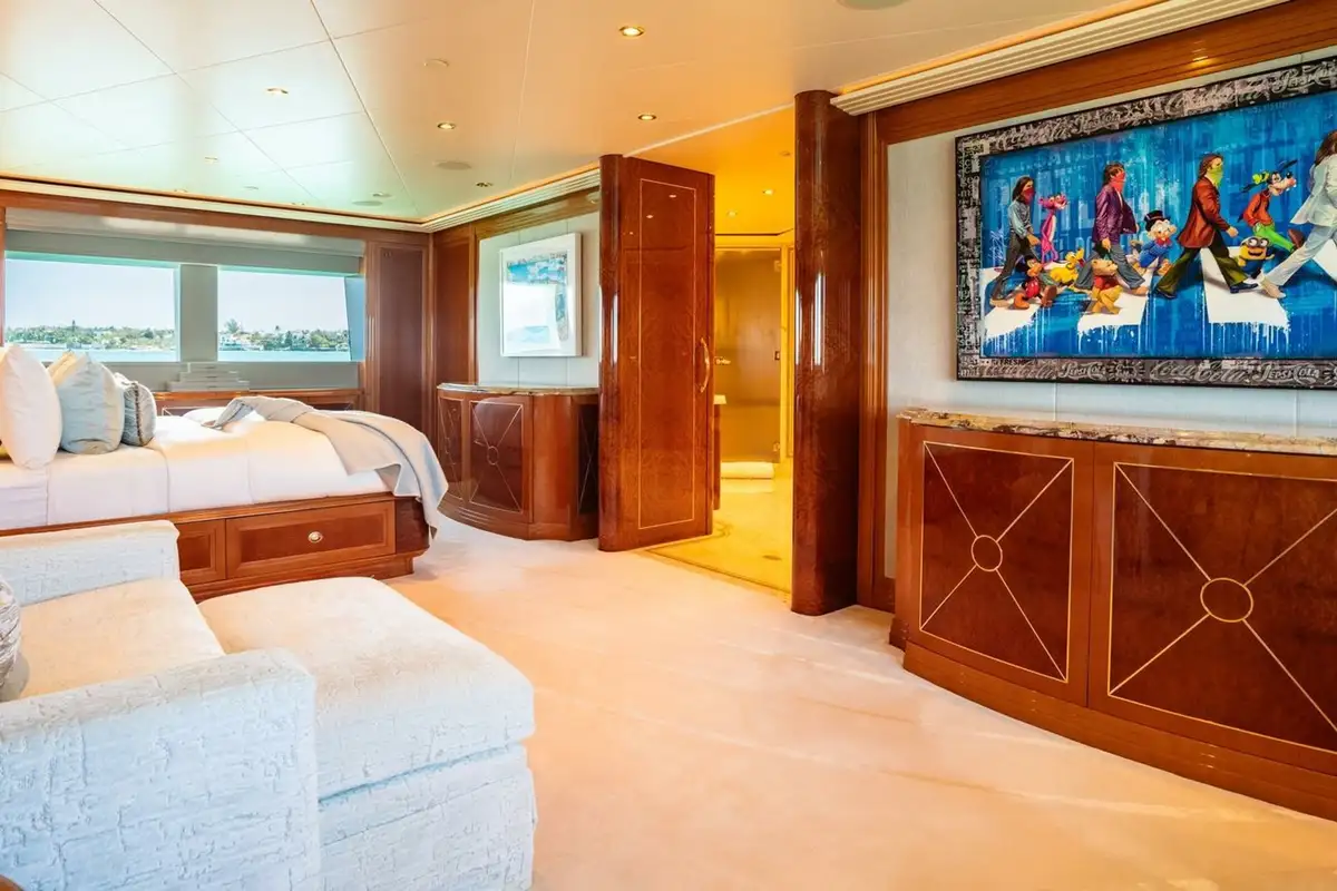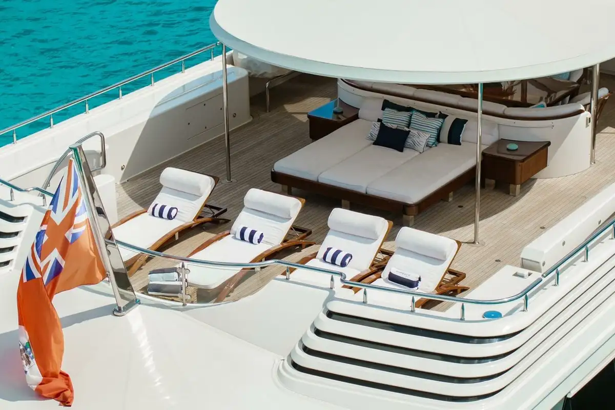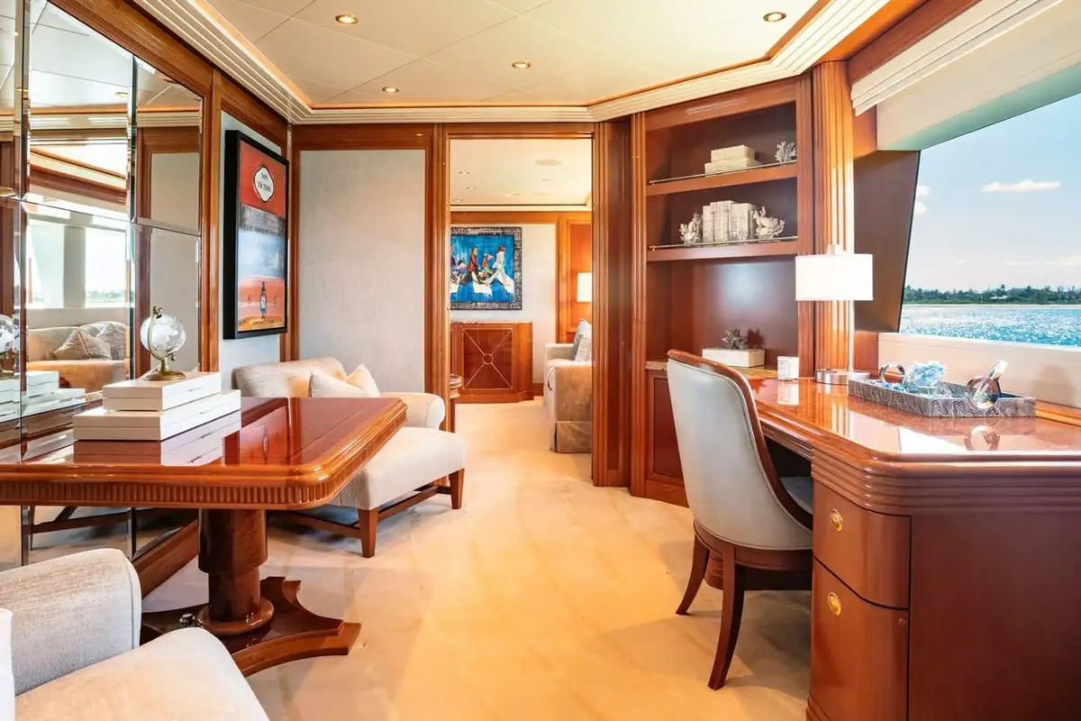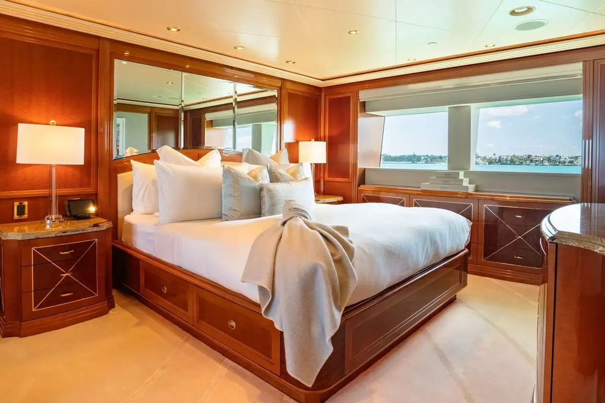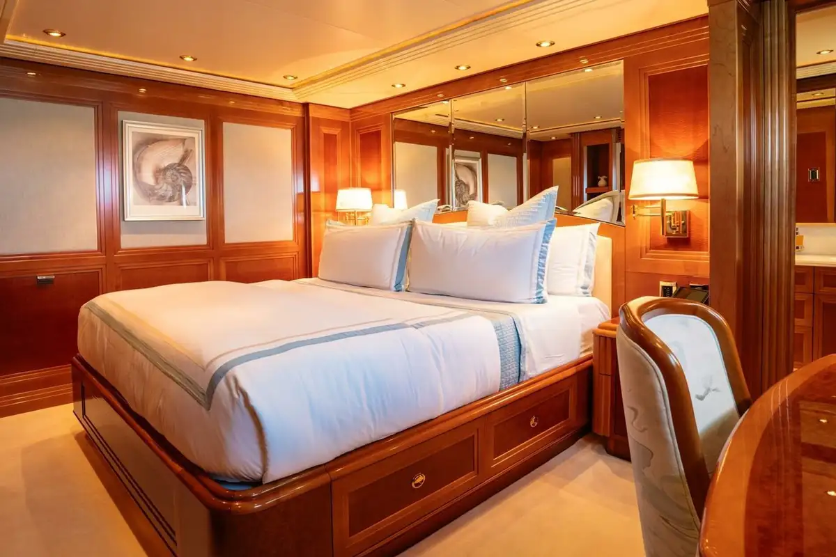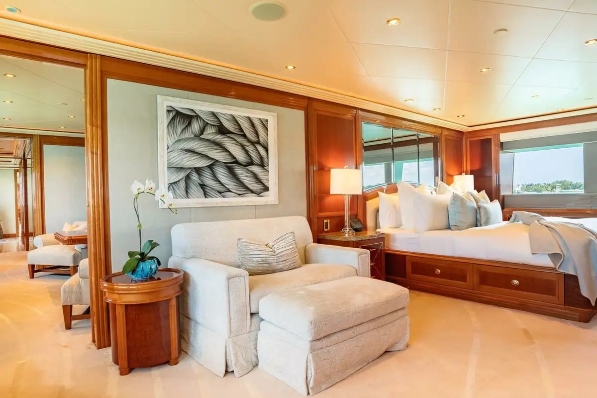 SECOND LOVE offers a versatile six-cabin layout that comfortably accommodates up to twelve guests in a chic, contemporary interior balanced with inviting, relaxed comfort. The full-beam master suite is located on the main deck and features a private office, offering a peaceful retreat with added privacy. On the bridge deck is a VIP cabin with its own private balcony. The flexible guest accommodation arrangement also includes one convertible twin cabins, making it ideal for both families and groups of friends.