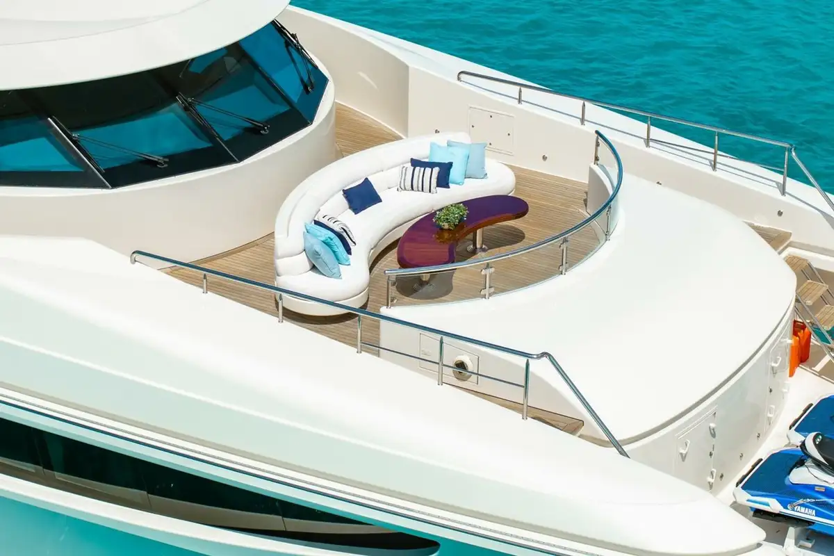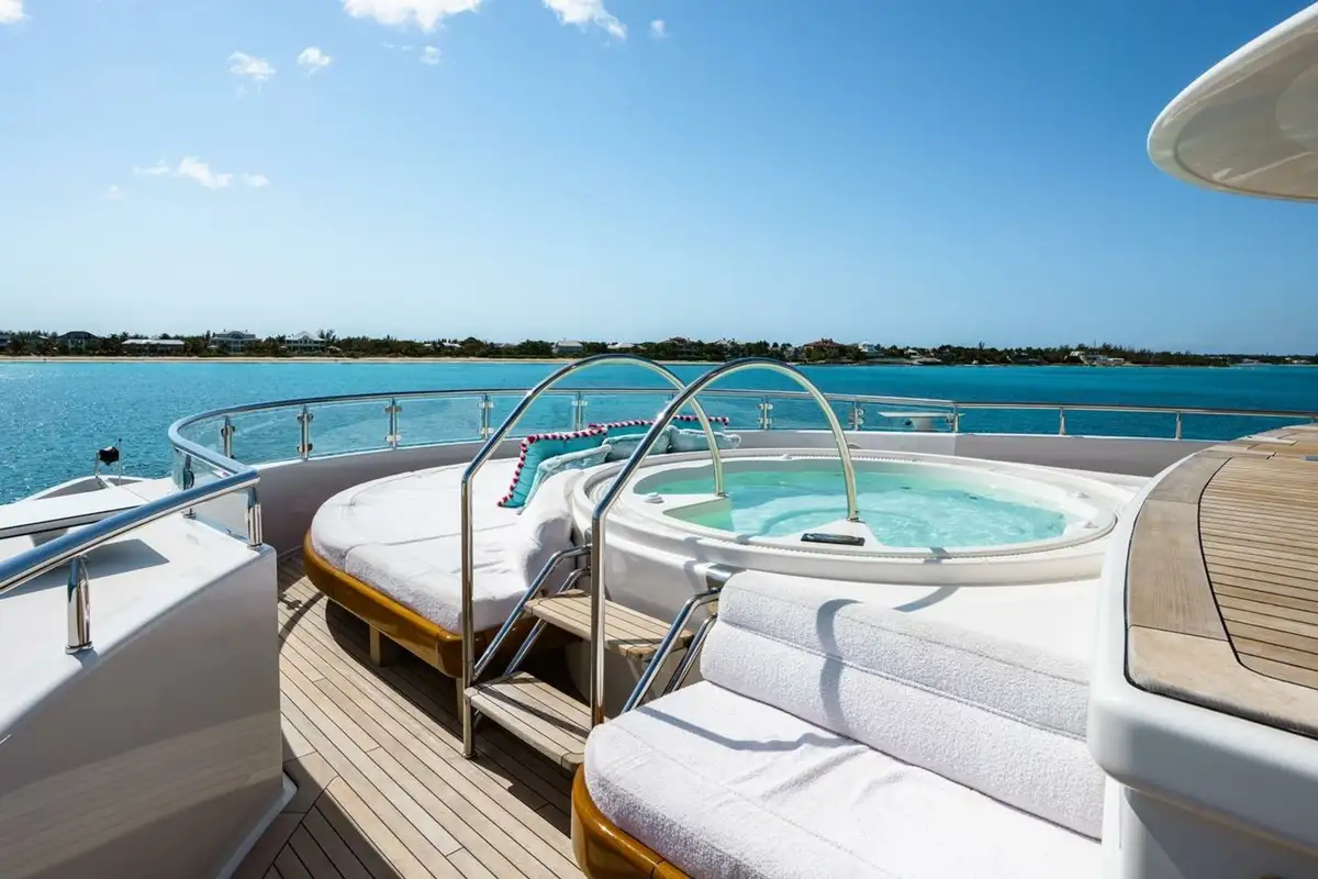 On the bridge deck, guests can enjoy a cozy lounge area complete with a card table, a large flat-screen TV, and inviting seating. This space flows effortlessly out to the aft deck dining area, ideal for everything from intimate gatherings to lively celebrations. The expansive sun deck is tailored for both relaxation and adventure. It includes a beautiful bar with a protective windscreen for comfort while cruising, and a forward hot tub surrounded by sun loungers.