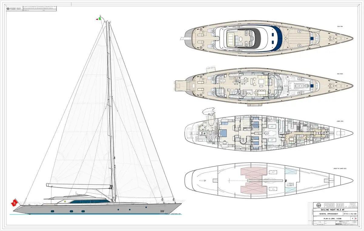 Built in 2011 as the Italian yard Perini Navi’s 51st masterpiece, the 45 metre sloop SERENDIPITY I is the ultimate charter yacht for ocean going adventures. SERENDIPITY I’s naval architecture is the work of Ron Holland in collaboration with Perini Navi. Her 52 metre mast can carry a total sail surface of 900 square metres propelling the yacht at up to 13 knots in the right conditions. Notably, with a keel that retracts from 8.7 to just 3.9 metres, she can confidently access shallow and remote anchorages that other luxury sailing yachts cannot.
