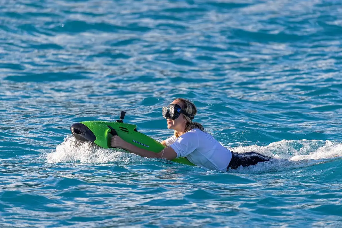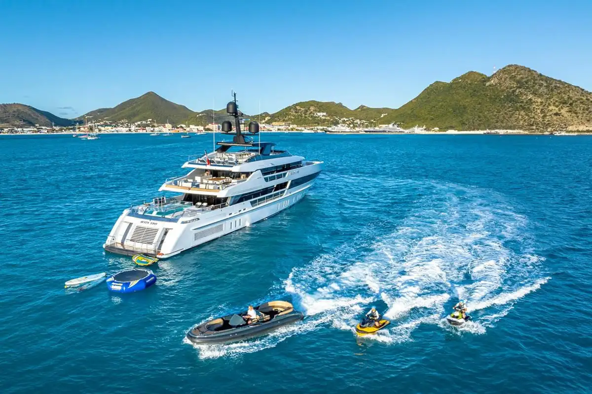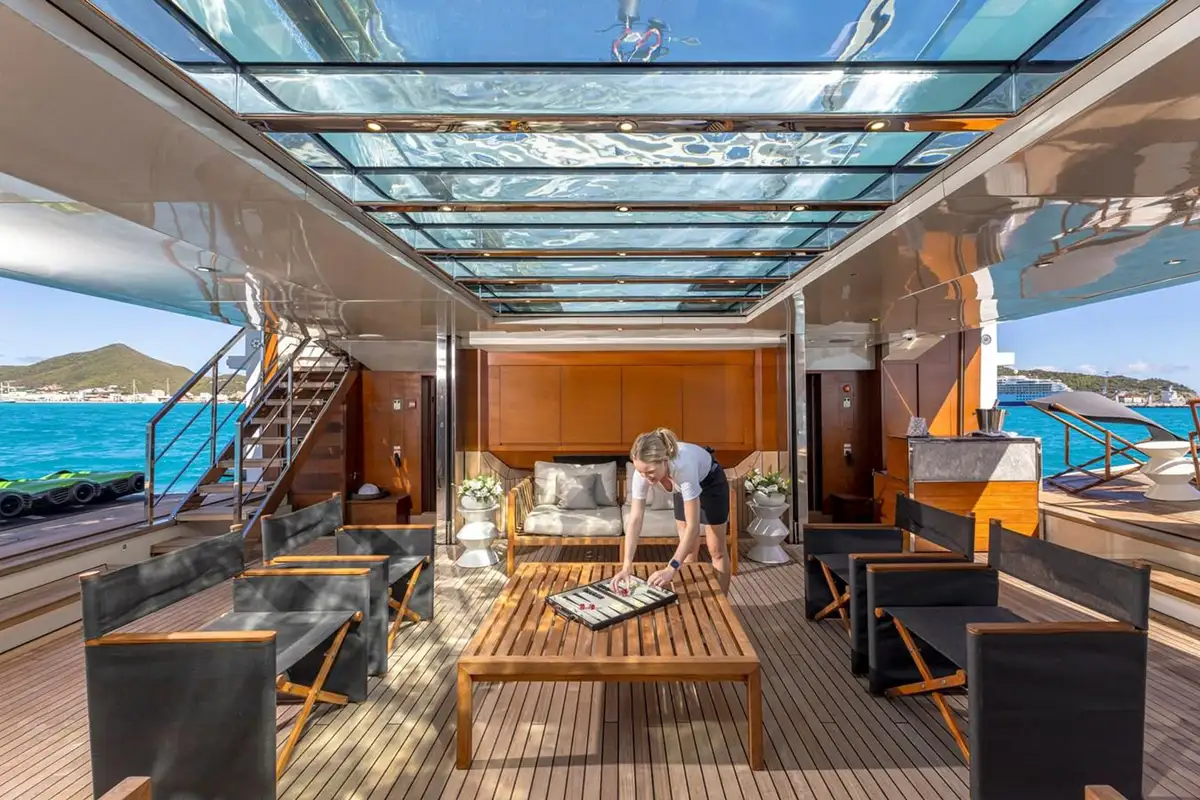 This beach club adapts to allow the tender garage to flood and the chase boat to drive in. With clever engineering, the floor lifts out of the way to store the boat, and then back into position for your use. There is a raft of watertoys to try too: from an inflatable trampoline to jetskis and SeaBobs.