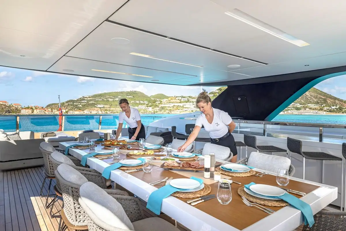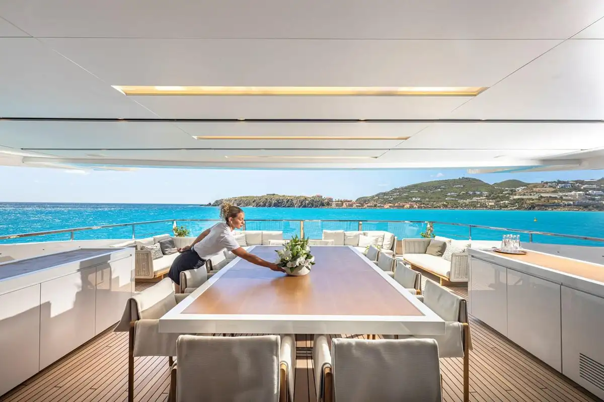 Take a walk around the decks before breakfast or go for a swim from the beach club astern. Breakfast is served al fresco on the upper aft deck, where a large table sits all 10 of your party. The Italian-chic vibe continues here with modern furniture on the pale teak deck. Cool breezes lift off the sea as you take time with your friends and family to chat about the day ahead.