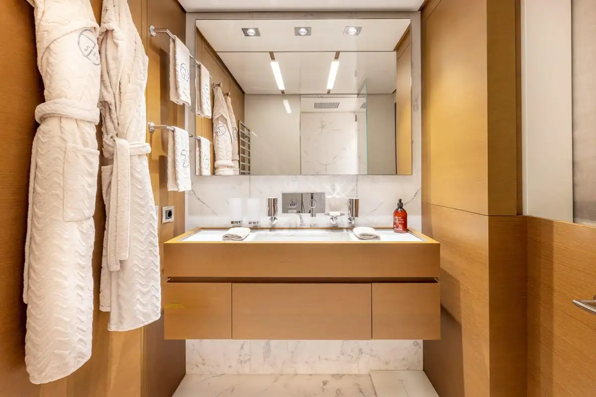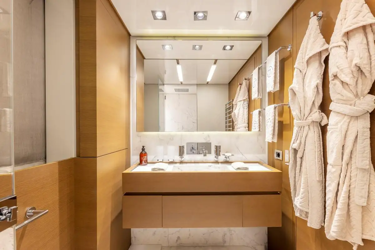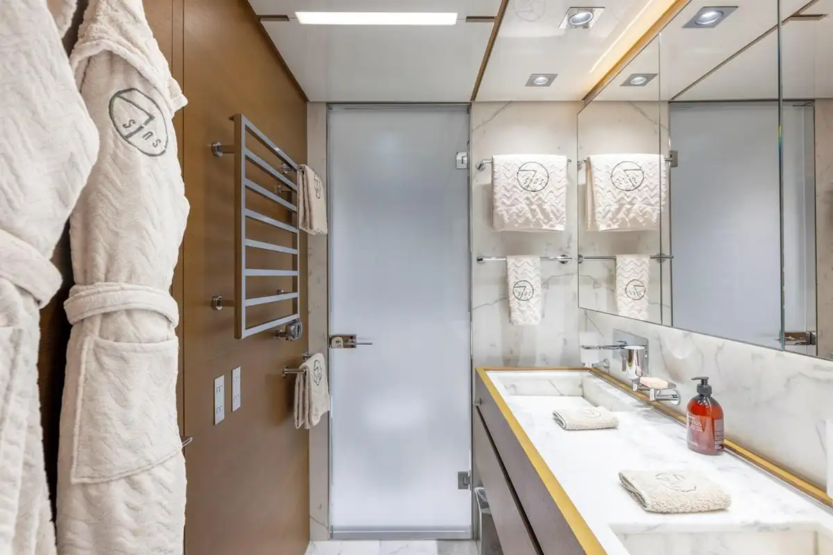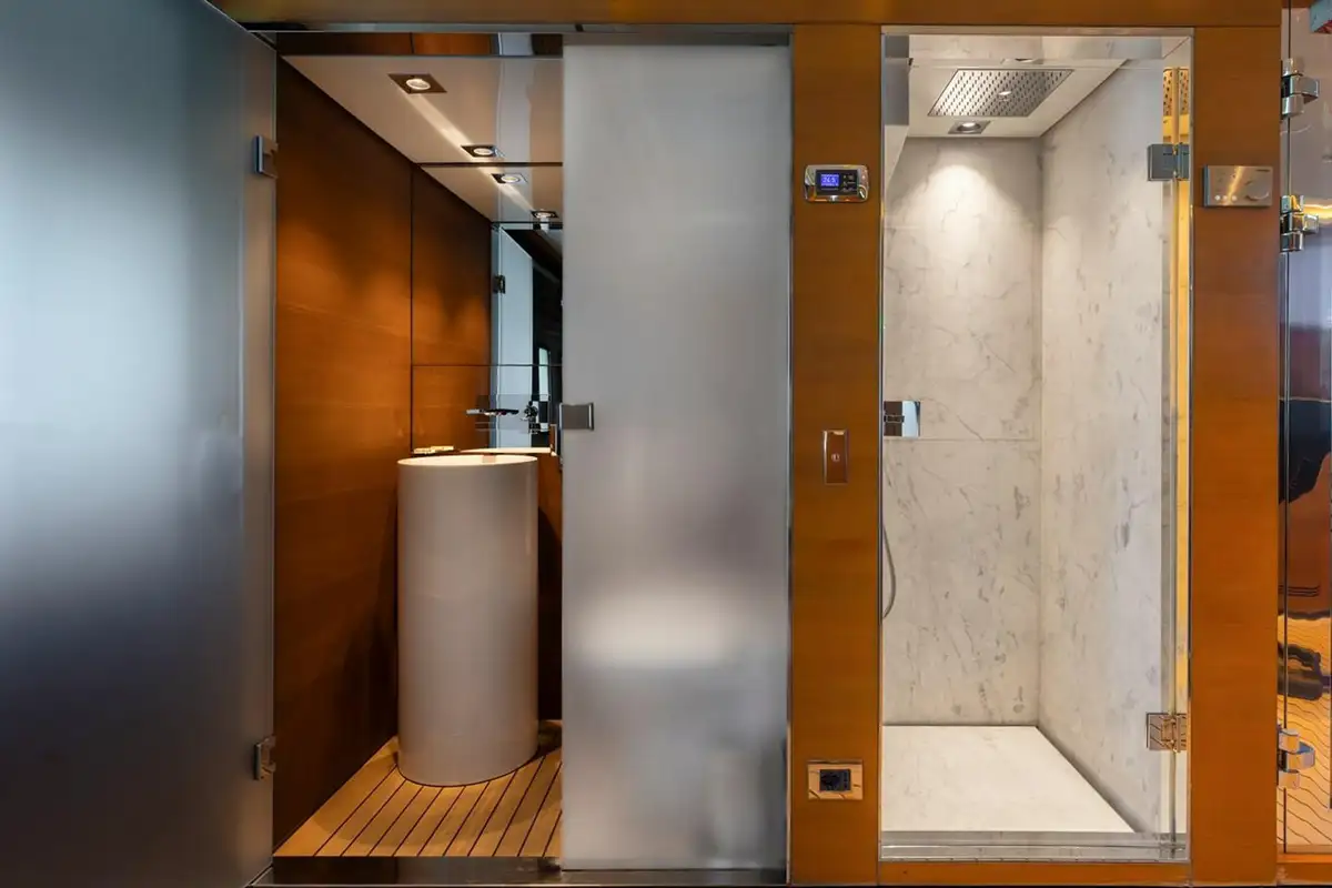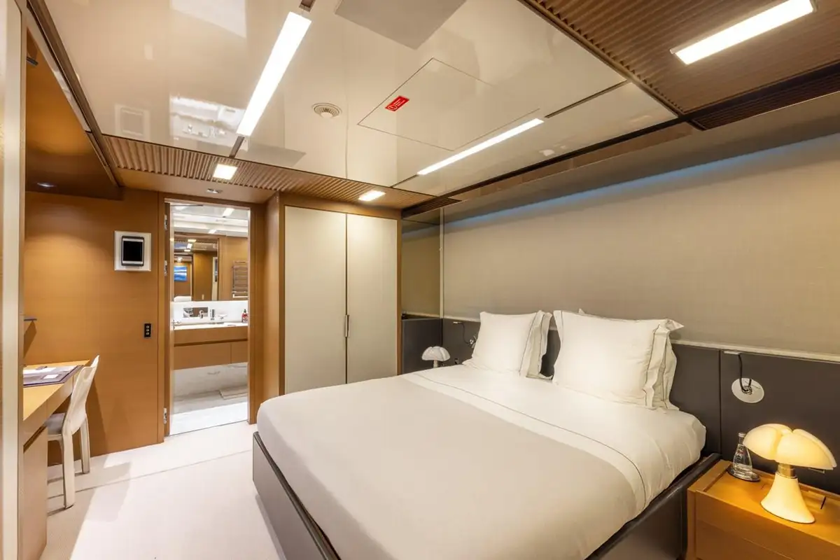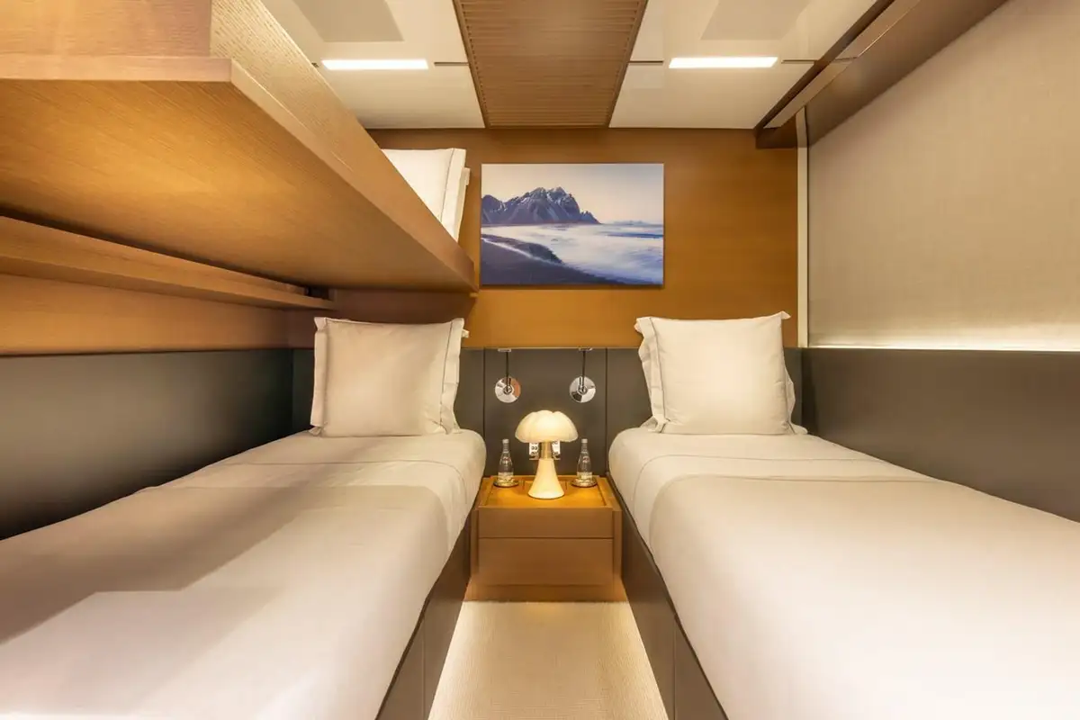 The five guest cabins include the master suite, secluded and private in the forward part of the main deck. In the morning you will wake in your linen sheets to hazy light coming through the sheer blinds. The other four cabins are all designed with the same sleek white-wall and muted-tan woodwork, creating a calm, zen-like ambiance.