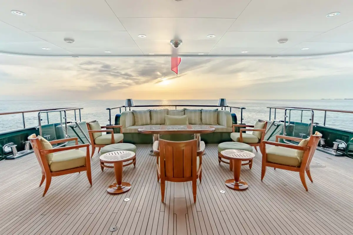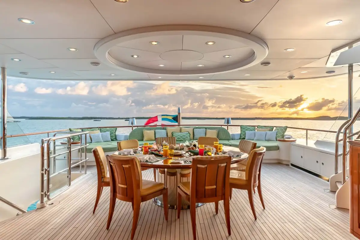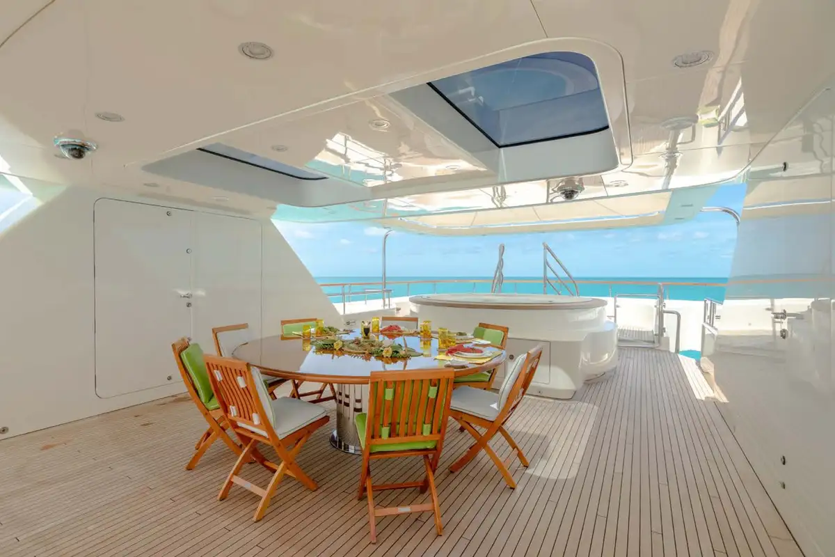Ascend to the bridge deck and discover the sumptuous sky lounge, complete with plush seating, a games table, and a projection screen TV. Whether used as office space or a relaxation area, the sky lounge offers versatility and comfort for all guests to enjoy. Outside, the al fresco formal dining area on the aft deck provides the perfect setting, while forward-facing seating and a Portuguese bridge offer unparalleled views over your anchorage.